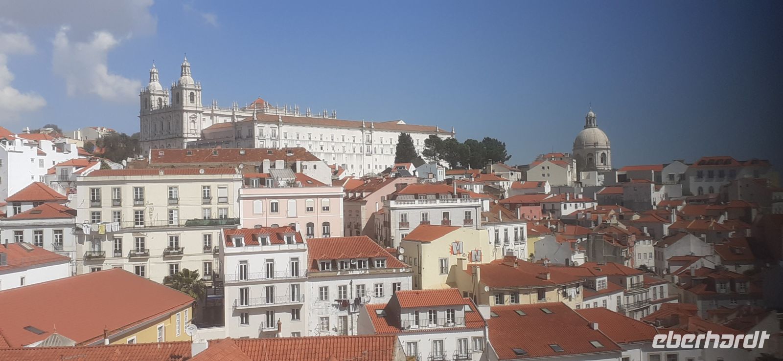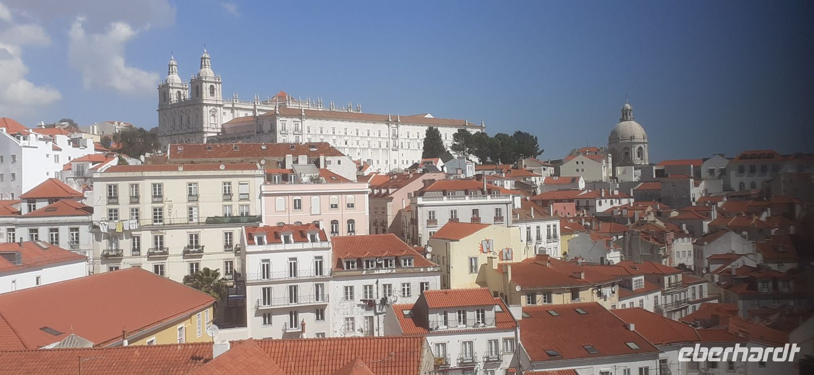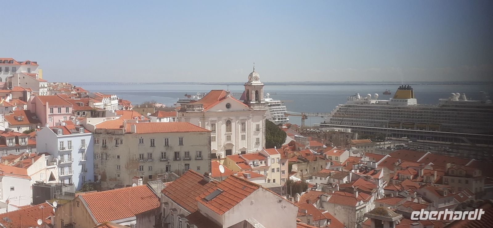 Nach dem reichhaltigen Frühstück fuhren wir mit dem Bus zur Stadtbesichtigung. Zuerst ging es hinauf zum Aussichtspunkt des Parks Eduardo VII, von dessen Terrasse sich uns ein prächtiges Panorama auf die Stadt und das Tal der Baixa bis zum Tejo bot. Vorbei an der stolzen Säule des Stadtplaners Pombal, erreichten wir die Prachtstraße Avenida da Liberdada mit der Eleganz des Jugendstils. An deren Ende befindet sich in einem Mosaik die Symbolik Portugals, die Abbildung der Caravelle mit den zwei schwarzen Raben. Nun ging es zu Fuß weiter. Hinauf zum Castelo de São Jorge halfen uns 2 Fahrstühle. Von oben bot sich erneut ein toller Blick auf die Stadt, bevor wir die Festungsanlage erkundeten. Durch schmale Gassen und auf Treppen ging es hinunter zur Alfama, dem ältesten Stadtteil mit der Kathedrale aus dem 12. Jahrhundert. Am Ende erreichten wir das Ufer des Tejo am Handelsplatz. Nun hatte ein Jeder Zeit für ein individuelles Mittagessen oder einen Bummel. Der zweite Teil der Besichtigungen startete mit dem Torre de Belem, dem bekannten Turm am Meer. Hier gab es auch ein Gläschen Portwein und die typischen Pasteis de Belem, eine süße Leckerei. Den ausführlichen Entdecker-Tag beendeten wir mit zwei weiteren Stopps am Seefahrerdenkmal und am bekannten Jerónimos-Kloster. Das Abendmenü nahmen wir in einem lokalen Restaurant in der Nähe des Hotels ein.
