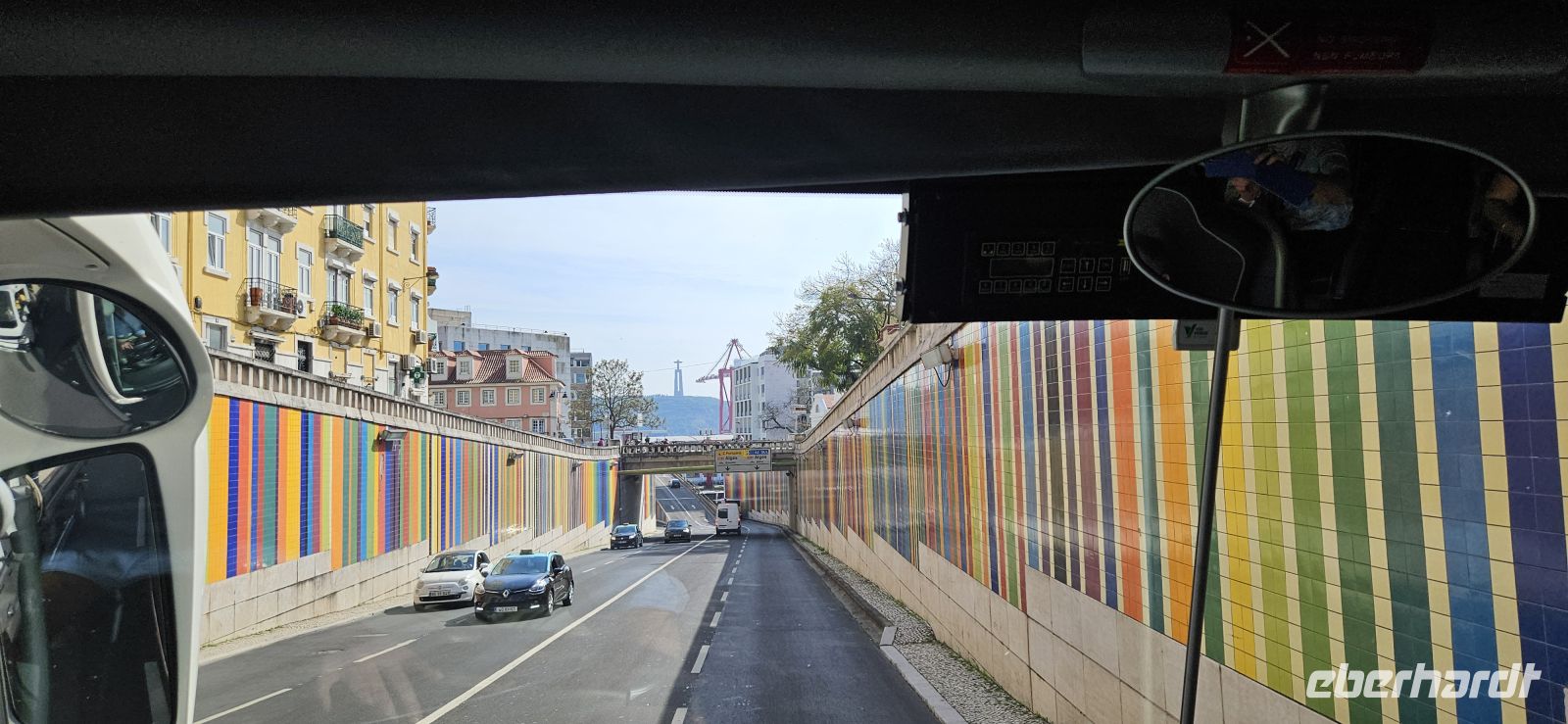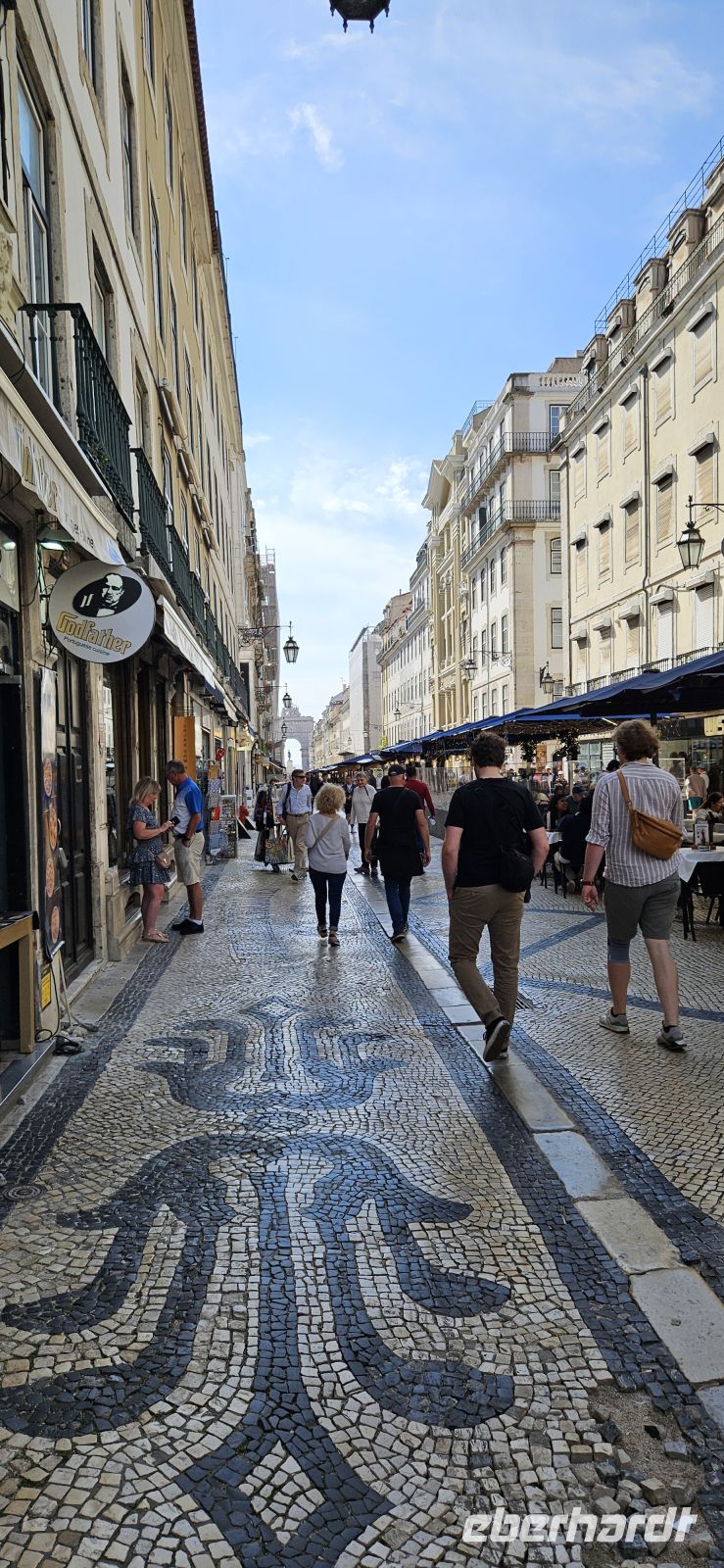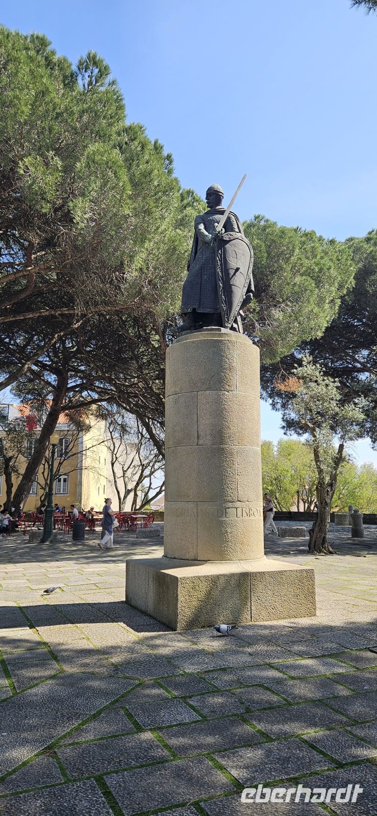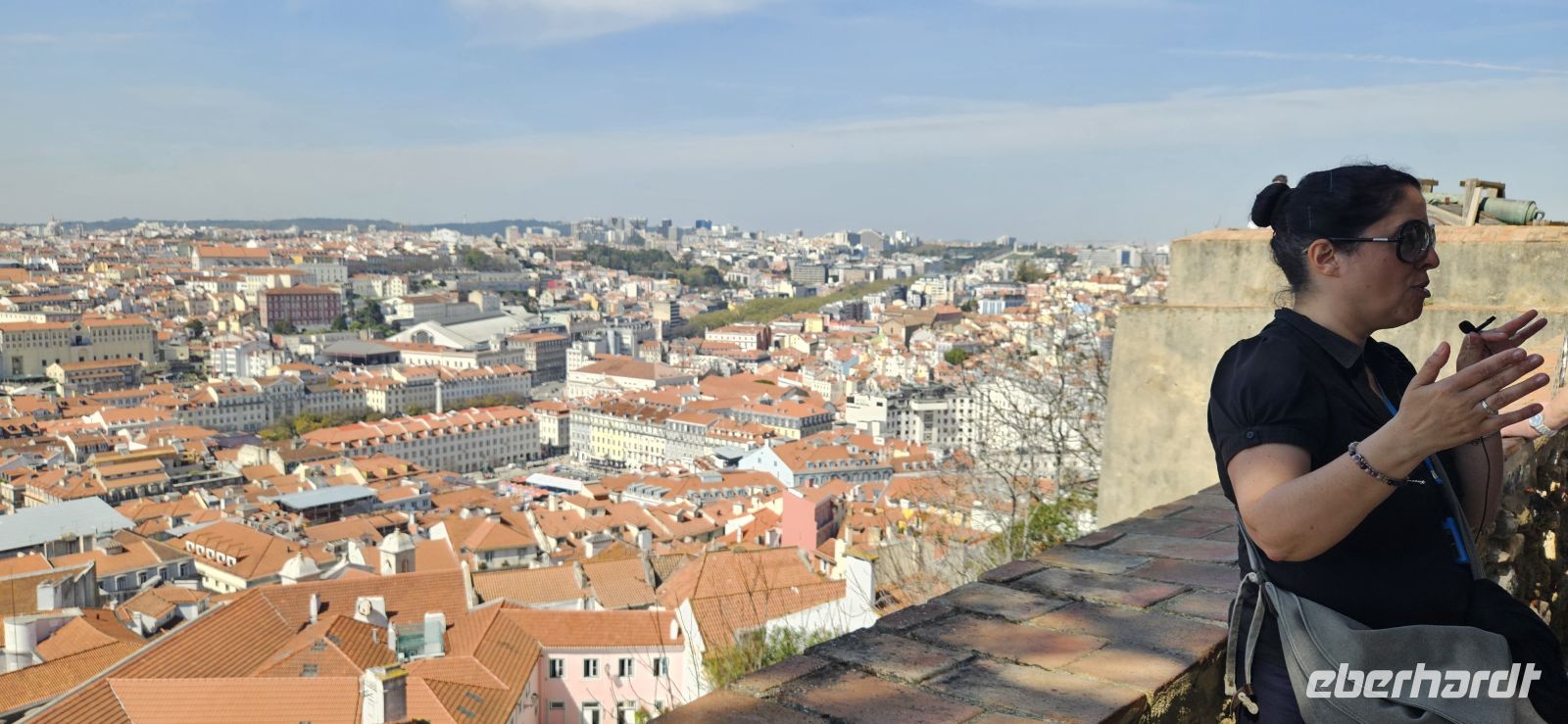Ab 7 Uhr gab es Frühstück und 9 Uhr starteten wir mit unserer Reiseleiterin Susana zur Stadtbesichtigung. Wir hatten einen Bus zur Verfügung, der allerdings nicht in die Altstadt fahren durfte und so besichtigten wir Lissabon zu Fuss. Ricardo war unser Busfahrer, leider nur für einen Tag. Zuerst machten wir einen Fotostopp am Aussichtspunkt oberhalb des Parkes Eduardo VII. Lissabon lag uns zu Füssen und Susana gab einen Überblick zu unserem Besichtigungsprogramm. Zu Fuss spazierten wir dann über den Rossio Platz mit dem beeindruckenden "Bodenwellen" aus abertausenden weissen und schwarzen Mosaiksteinchen. Wir kamen vorbei am ehemaligen Bahnhof, besuchten eine alte Klosterkirche und genossen einen ersten Ginhja - Sauerkirschlikör - in der Sonne. Das Zentrum der Baixa ist die Rua Augusta mit vielen Strassenrestaurants und Geschäften. Am Ende steht der Triumphbogen und dahinter öffnet sich der gewaltige Praca do Comercio - das Herz der Altstadt von Lissabon. Wir gingen nach links zu den Aufzügen hinauf zum Castello. Mit 2 Aufzügen gelangten wir recht schnell hinauf unterhalb des Castells. Einige steile Strassen führten zum Eingang. Susane hatte unsere Tickets bereits besorgt und so konnte wir ohne Anstehen den Eingang passieren. Von der Plattform an der Festungsmauer hatten wir eine traumhafte Aussicht über den Hafen, die Stadt, die beiden Brücken und auf die Baixa. Gleich am Eingang steht die Stratue von König Alfonso I und hier informierte uns Susana über den Bau und die Bedeutung des Castelo Sao Jorge über die Jahrhunderte. Mitten in den Festungsmauern stehen die Ruinen der alten Burg mit begehbaren Festungsmauern. Im Areal tummelten sich zahlreiche Pfaue, die ab und zu die Touristen mit einem schönen "Rad" als Fotomotiv erfreuten. Wir besuchten noch kurz die archäologischen Ausgrabungen und gingen dann hinunter zum Aussichtspunkt beim Hl.Vincent. Dort verkehrt auch die legendäre Strassenbahnlinie 28. Entlang der Strassenbahnroute gingen wir hinunter zum Dom und weiter zur Rua Augusta und dort war Zeit für eine individuelle Mittagspause. Beim Rossio Platz nahm uns der Bus wieder auf und brachte uns hinaus zum Hieronimuskloster. Von dort spazierten wir durch den Park zum Entdeckerdenkmal und später zum Belem Turm. Dort wartete noch eine kleine Überraschung auf uns. Es gab ein Gläschen Portwein und dazu ein Pasteis de Belem.