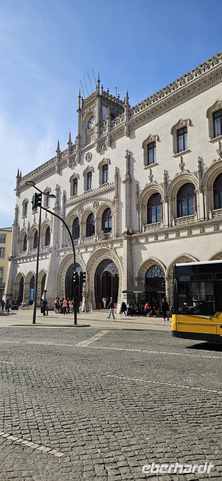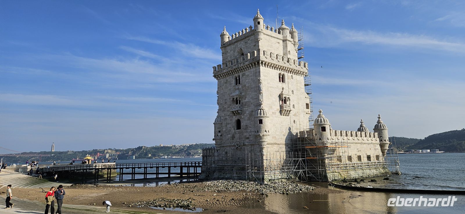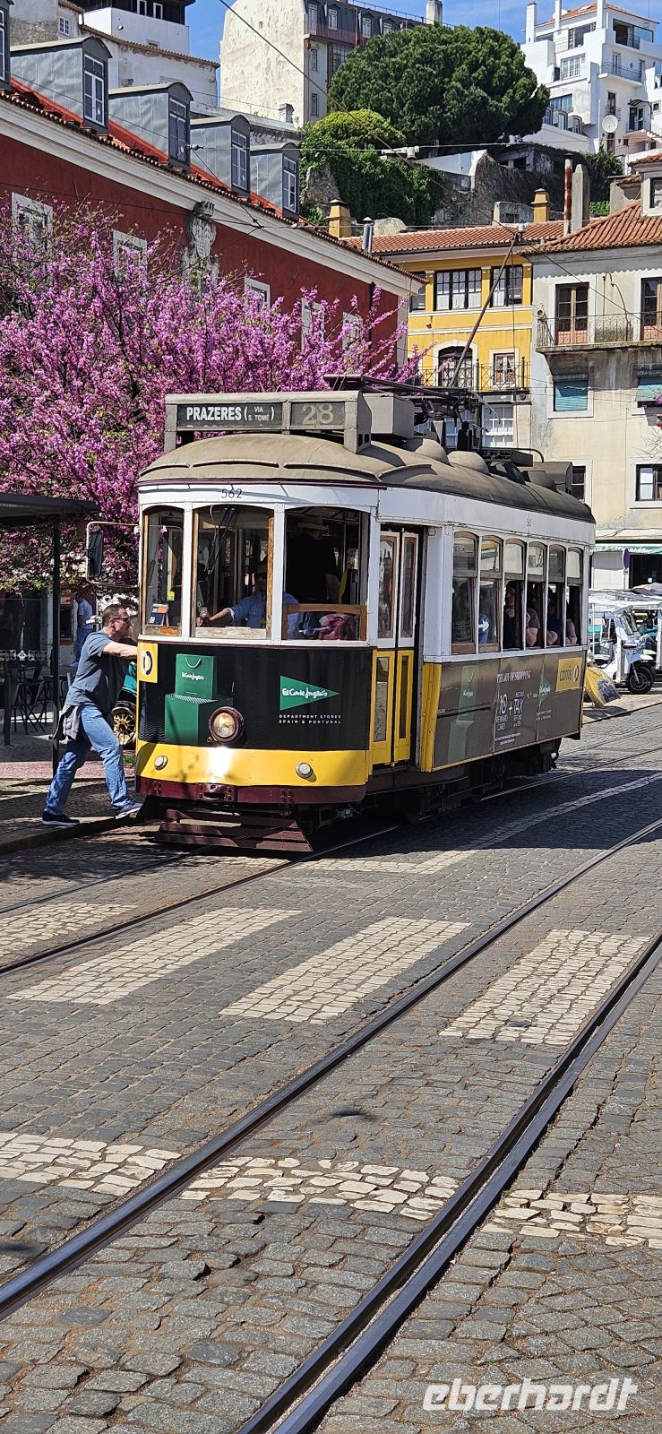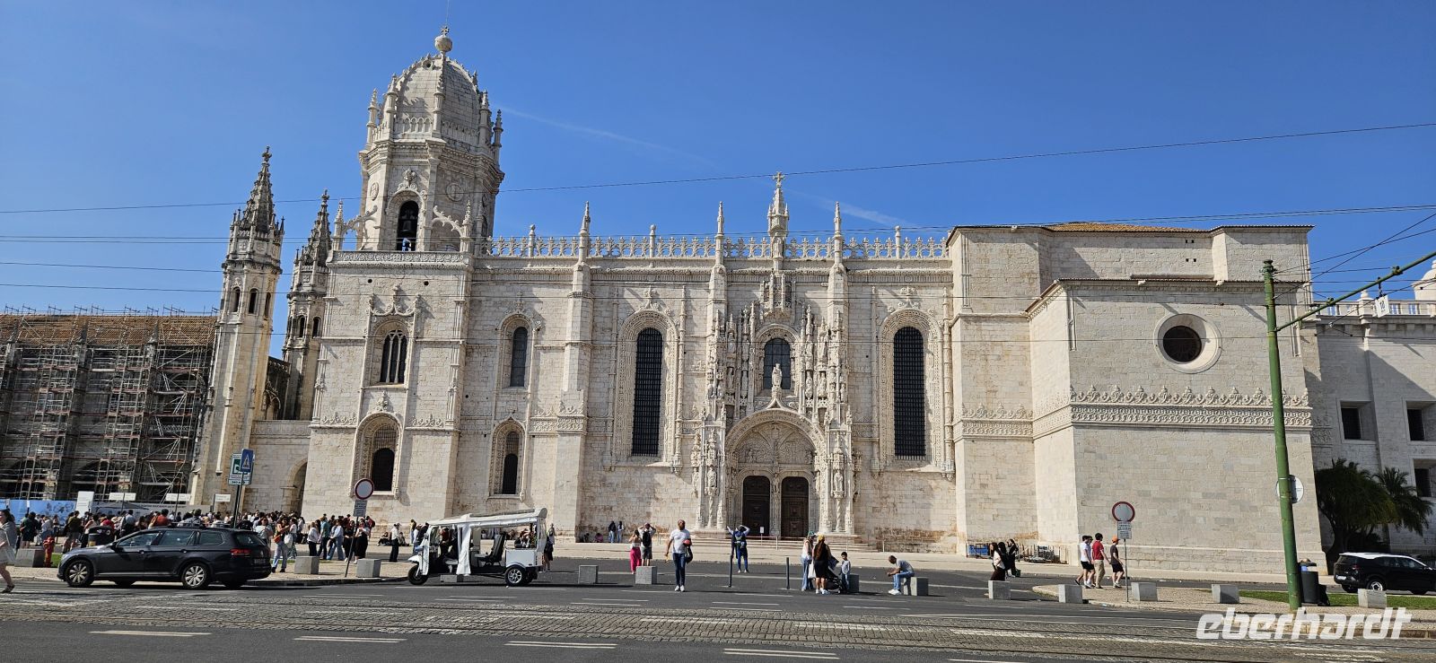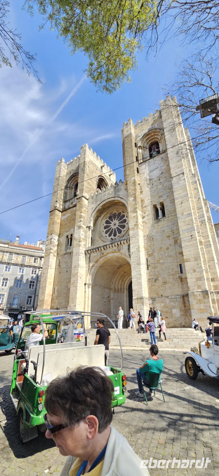 Ab 7 Uhr gab es Frühstück und 9 Uhr starteten wir mit unserer Reiseleiterin Susana zur Stadtbesichtigung. Wir hatten einen Bus zur Verfügung, der allerdings nicht in die Altstadt fahren durfte und so besichtigten wir Lissabon zu Fuss. Ricardo war unser Busfahrer, leider nur für einen Tag. Zuerst machten wir einen Fotostopp am Aussichtspunkt oberhalb des Parkes Eduardo VII. Lissabon lag uns zu Füssen und Susana gab einen Überblick zu unserem Besichtigungsprogramm. Zu Fuss spazierten wir dann über den Rossio Platz mit dem beeindruckenden "Bodenwellen" aus abertausenden weissen und schwarzen Mosaiksteinchen. Wir kamen vorbei am ehemaligen Bahnhof, besuchten eine alte Klosterkirche und genossen einen ersten Ginhja - Sauerkirschlikör - in der Sonne. Das Zentrum der Baixa ist die Rua Augusta mit vielen Strassenrestaurants und Geschäften. Am Ende steht der Triumphbogen und dahinter öffnet sich der gewaltige Praca do Comercio - das Herz der Altstadt von Lissabon. Wir gingen nach links zu den Aufzügen hinauf zum Castello. Mit 2 Aufzügen gelangten wir recht schnell hinauf unterhalb des Castells. Einige steile Strassen führten zum Eingang. Susane hatte unsere Tickets bereits besorgt und so konnte wir ohne Anstehen den Eingang passieren. Von der Plattform an der Festungsmauer hatten wir eine traumhafte Aussicht über den Hafen, die Stadt, die beiden Brücken und auf die Baixa. Gleich am Eingang steht die Stratue von König Alfonso I und hier informierte uns Susana über den Bau und die Bedeutung des Castelo Sao Jorge über die Jahrhunderte. Mitten in den Festungsmauern stehen die Ruinen der alten Burg mit begehbaren Festungsmauern. Im Areal tummelten sich zahlreiche Pfaue, die ab und zu die Touristen mit einem schönen "Rad" als Fotomotiv erfreuten. Wir besuchten noch kurz die archäologischen Ausgrabungen und gingen dann hinunter zum Aussichtspunkt beim Hl.Vincent. Dort verkehrt auch die legendäre Strassenbahnlinie 28. Entlang der Strassenbahnroute gingen wir hinunter zum Dom und weiter zur Rua Augusta und dort war Zeit für eine individuelle Mittagspause. Beim Rossio Platz nahm uns der Bus wieder auf und brachte uns hinaus zum Hieronimuskloster. Von dort spazierten wir durch den Park zum Entdeckerdenkmal und später zum Belem Turm. Dort wartete noch eine kleine Überraschung auf uns. Es gab ein Gläschen Portwein und dazu ein Pasteis de Belem.