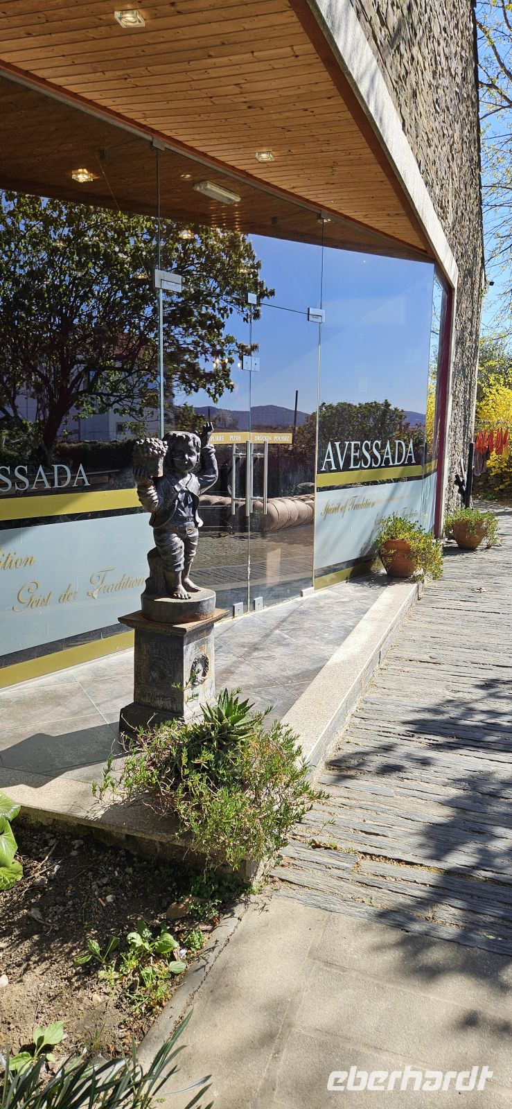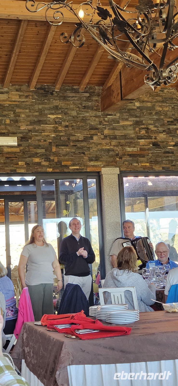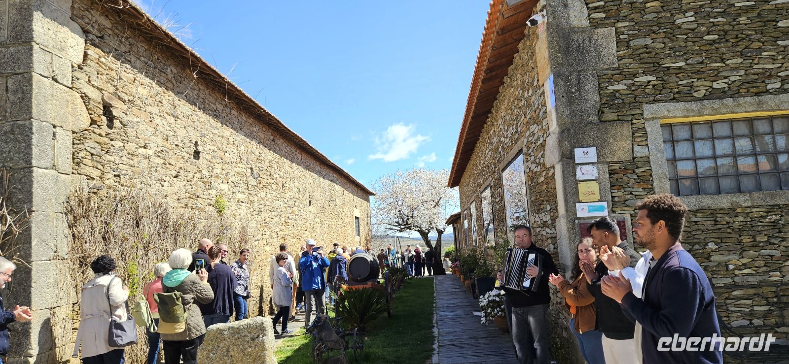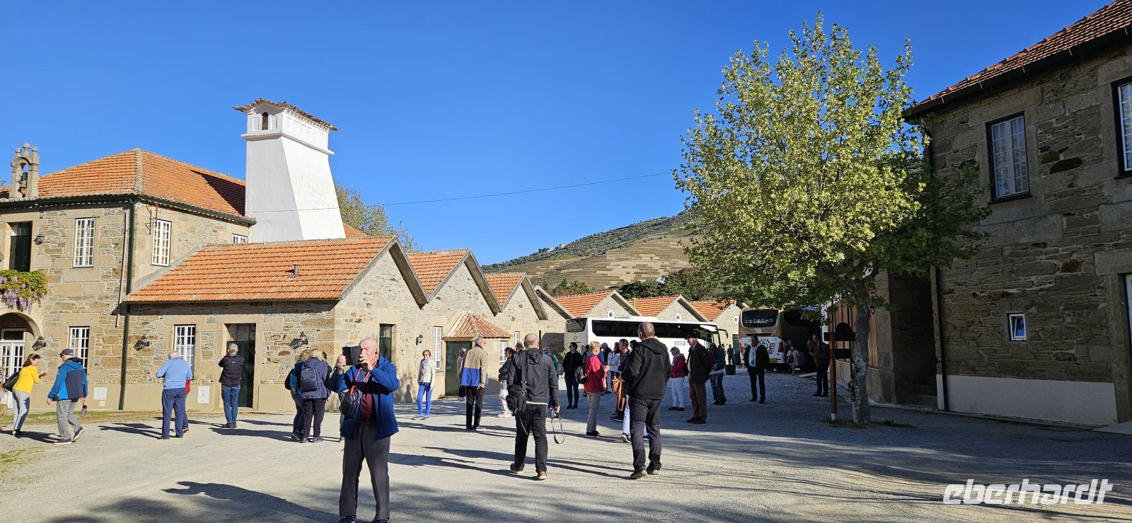 Heute gab es einen Geburtstag zu feiern in unserer Gruppe und wir konnten mal ausschlafen. Gegen 10 Uhr erreichten wir Pinhao und 11 Uhr begaben wir uns zu Fuss vom Schiff zum Bahnhof des Ortes. Der Bahnhof ist mit wunderschönen blau weissen Kacheln verziert und diese zeigen Szenen aus dem Leben der hiesigen Bevölkerung, vor allem Szenen aus der Landwirtschaft und vom Weinanbau. Gegen 12 Uhr stiegen wir in die Busse ein und fuhren über aussichtsreiche Strassen hinauf durch die Weinberge zur Quinta Avessada auf 620 m Höhe. Dort kann man keine Trauben für den Portwein anbauen und so hat sich das Weingut über viele Generationen auf die Produktion von Muskateller Wein spezialisiert. Das ist ein höher prozentiger Apperitiv Wein, den wir zur Begrüßung auf der Terrasse des Weingutes probieren durften. Danach besuchten wir das Weinmuseum der Familie Luis Barros. Im grossen Saal erwartete uns dann ein vorzügliches Mittagessen mit Weinen des Weingutes Avessada. Reiseleiterin Anna übersetzte für uns die Erzählungen eines Mitarbeiters zu einer besonderen Suppe und wir durften auch den Besitzer des Weingutes - Luis Barros - kennenlernen.