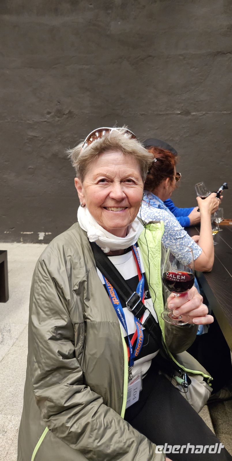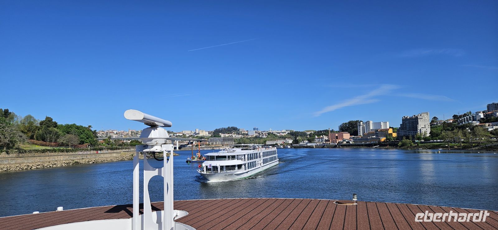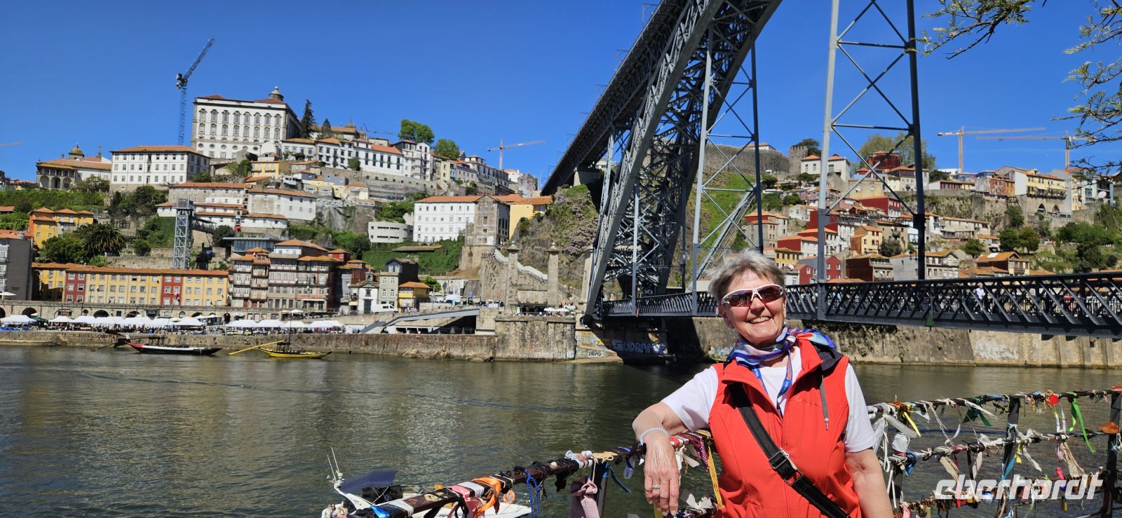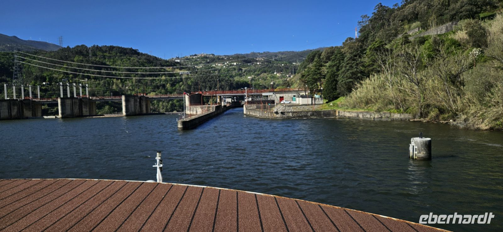 Frühstück gab es auf dem Schiff immer ab 7 Uhr und heute mussten noch die Audiogeräte an der Rezeption abgeholt werden, denn bereits 8.30 Uhr begann unser erster Ausflug. Unsere Singlegruppe war immer für den Bus 1 mit Reiseleiterin Vanessa und Fahrer Pedro eingeteilt. Wir fuhren von Gaia hinauf und über die Brücke hinüber nach Porto. An der Kathedrale stiegen wir aus und genossen zunächst den Blick über die Dächer der historischen Innenstadt von Porto. An der Kathedrale war gerade eine Rad Pilgergruppe dabei , ihre Pilgerhefte abzustempeln. Wir spazierten danach hinunter zum Bahnhof und mussten wegen der Bauarbeiten für die Metro den Seiteneingang nehmen. Der Bahnhof ist reich mit blau weissen Kacheln verziert. Darauf sind Szenen aus dem täglichen Leben sowie von geschichtlich bedeutenden Ereignissen dargestellt. Der Bahnhof wird von Pendlern täglich genutzt. Auf der Weiterfahrt durch das Zentrum von Porto kamen wir unter anderem am Rathaus und an der alten Universität vorbei, sahen viele Wartende vor einem berühmten Buchladen und fuhren schliesslich hinunter an den Atlantik, wo sich der Industriehafen und das neue Kreuzfahrtterminal befinden. Auf der Uferstrasse, die mit vielen grossen neuseeländischen Eisenholzbäumen gesäumt war, fuhren wir in Richtung Douro Mündung und weiter zurück nach Gaia. In Gaia befinden sich alle berühmten Portweinkellereien und wir besuchten die von Calem. Bei einer Führung erfuhren wir alles Wissenswerte über Anbau, Ernte und Verarbeitung der Trauben aus dem Dourotal und zum Schluss probierten wir einen Fine White Portwein und einen gemischten Roten Portwein. Auf dem Weg zurück zum Schiff gab es nochmal zahlreiche tolle Fotomotive. 13 Uhr legte die Douro Queen ab und nun begann endlich unsere Flusskreuzfahrt. Am Nachmittag befuhren wir die ersten beiden Schleusen und kurz nach 17 Uhr erreichten wir Caldas de Aregos. Dort blieben wir über Nacht.