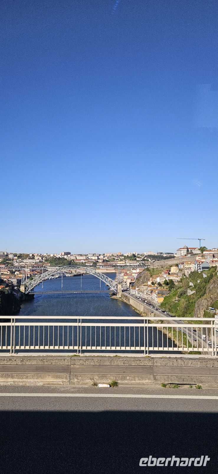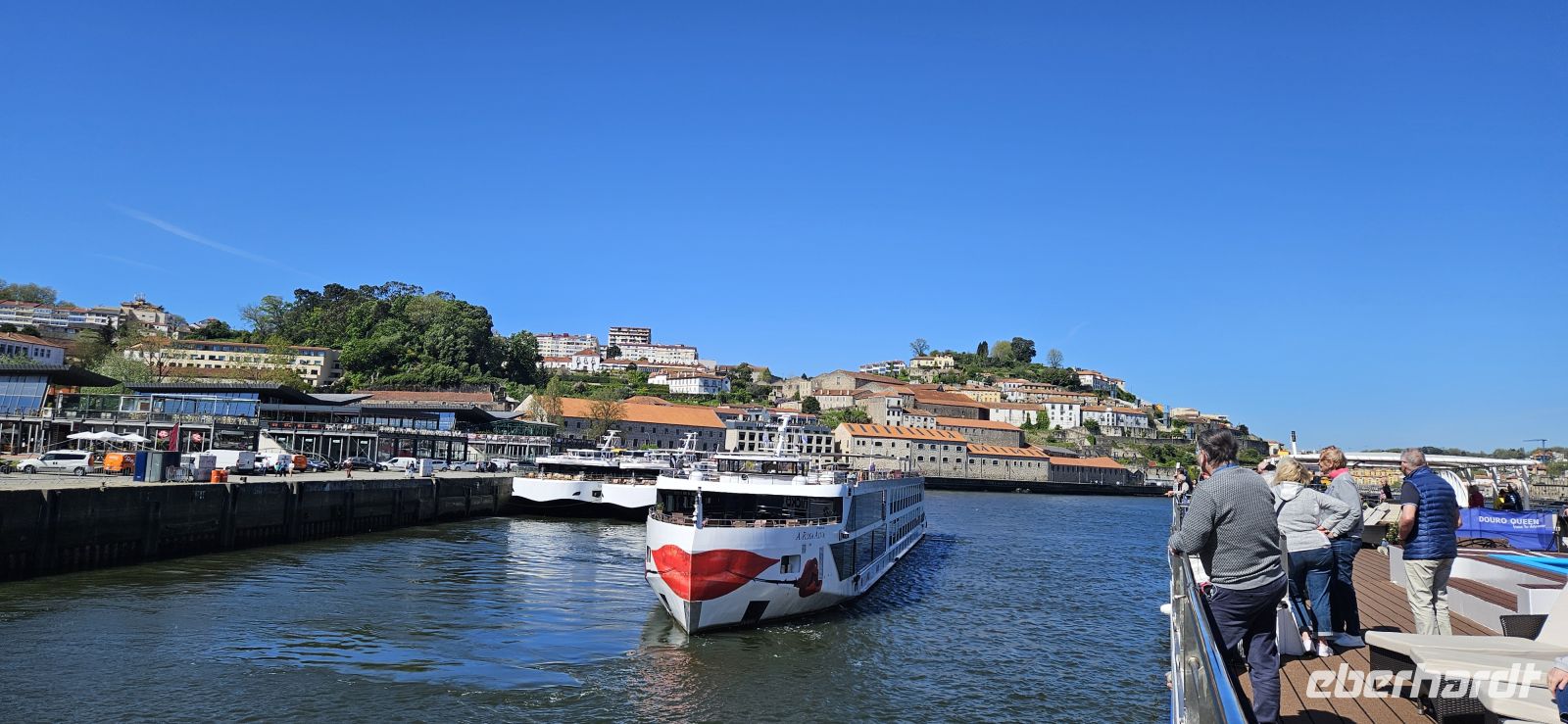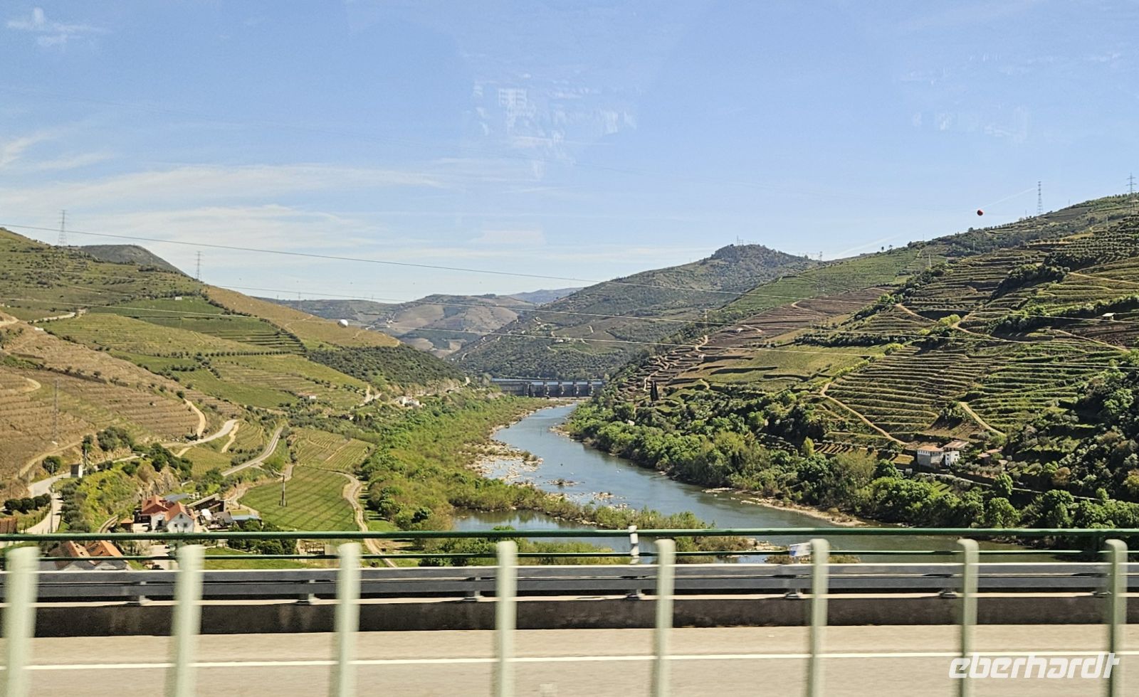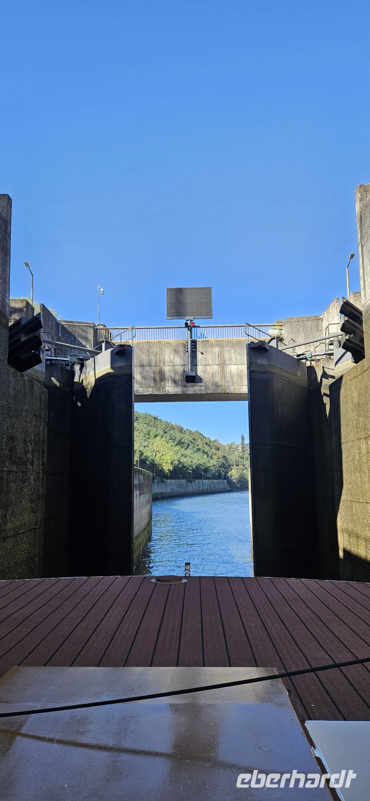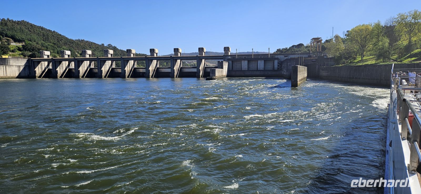 Frühstück gab es auf dem Schiff immer ab 7 Uhr und heute mussten noch die Audiogeräte an der Rezeption abgeholt werden, denn bereits 8.30 Uhr begann unser erster Ausflug. Unsere Singlegruppe war immer für den Bus 1 mit Reiseleiterin Vanessa und Fahrer Pedro eingeteilt. Wir fuhren von Gaia hinauf und über die Brücke hinüber nach Porto. An der Kathedrale stiegen wir aus und genossen zunächst den Blick über die Dächer der historischen Innenstadt von Porto. An der Kathedrale war gerade eine Rad Pilgergruppe dabei , ihre Pilgerhefte abzustempeln. Wir spazierten danach hinunter zum Bahnhof und mussten wegen der Bauarbeiten für die Metro den Seiteneingang nehmen. Der Bahnhof ist reich mit blau weissen Kacheln verziert. Darauf sind Szenen aus dem täglichen Leben sowie von geschichtlich bedeutenden Ereignissen dargestellt. Der Bahnhof wird von Pendlern täglich genutzt. Auf der Weiterfahrt durch das Zentrum von Porto kamen wir unter anderem am Rathaus und an der alten Universität vorbei, sahen viele Wartende vor einem berühmten Buchladen und fuhren schliesslich hinunter an den Atlantik, wo sich der Industriehafen und das neue Kreuzfahrtterminal befinden. Auf der Uferstrasse, die mit vielen grossen neuseeländischen Eisenholzbäumen gesäumt war, fuhren wir in Richtung Douro Mündung und weiter zurück nach Gaia. In Gaia befinden sich alle berühmten Portweinkellereien und wir besuchten die von Calem. Bei einer Führung erfuhren wir alles Wissenswerte über Anbau, Ernte und Verarbeitung der Trauben aus dem Dourotal und zum Schluss probierten wir einen Fine White Portwein und einen gemischten Roten Portwein. Auf dem Weg zurück zum Schiff gab es nochmal zahlreiche tolle Fotomotive. 13 Uhr legte die Douro Queen ab und nun begann endlich unsere Flusskreuzfahrt. Am Nachmittag befuhren wir die ersten beiden Schleusen und kurz nach 17 Uhr erreichten wir Caldas de Aregos. Dort blieben wir über Nacht.