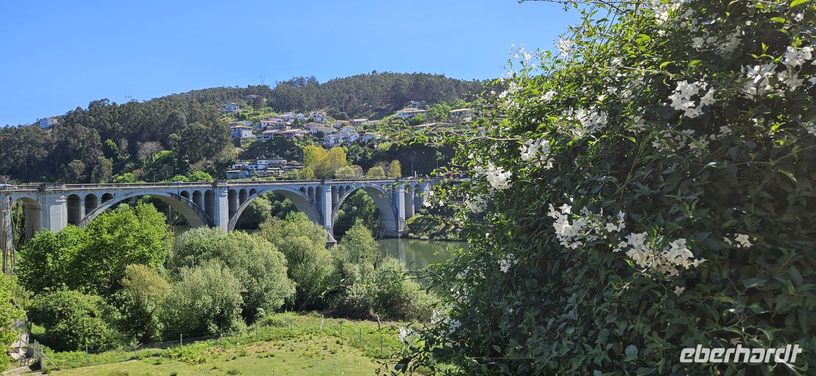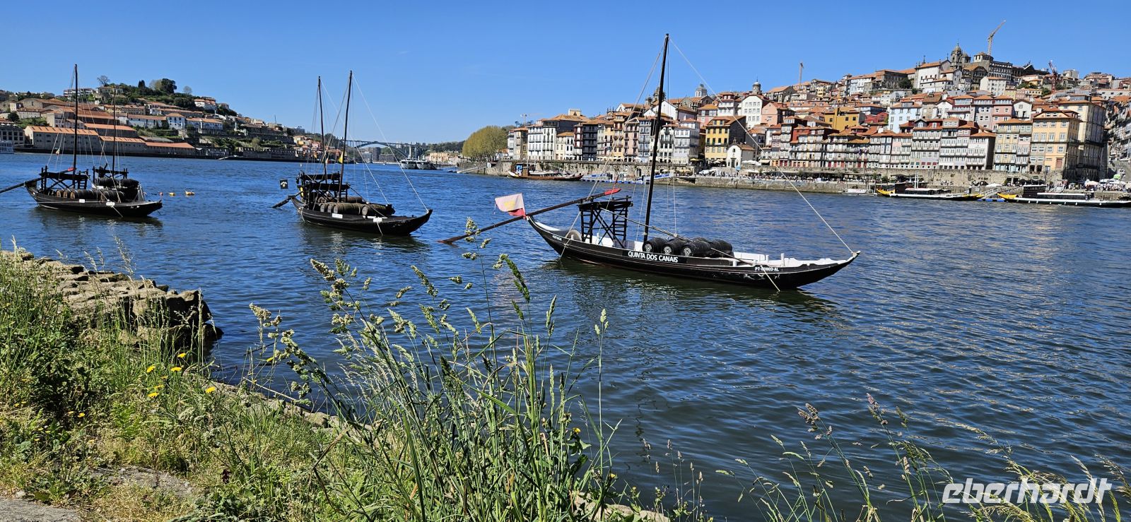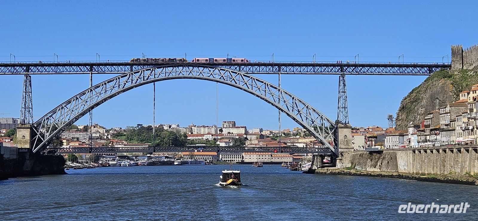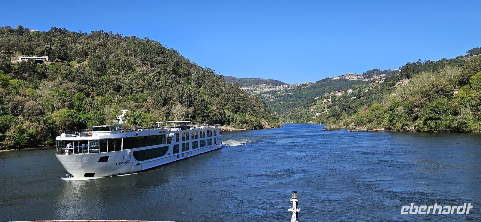 Frühstück gab es auf dem Schiff immer ab 7 Uhr und heute mussten noch die Audiogeräte an der Rezeption abgeholt werden, denn bereits 8.30 Uhr begann unser erster Ausflug. Unsere Singlegruppe war immer für den Bus 1 mit Reiseleiterin Vanessa und Fahrer Pedro eingeteilt. Wir fuhren von Gaia hinauf und über die Brücke hinüber nach Porto. An der Kathedrale stiegen wir aus und genossen zunächst den Blick über die Dächer der historischen Innenstadt von Porto. An der Kathedrale war gerade eine Rad Pilgergruppe dabei , ihre Pilgerhefte abzustempeln. Wir spazierten danach hinunter zum Bahnhof und mussten wegen der Bauarbeiten für die Metro den Seiteneingang nehmen. Der Bahnhof ist reich mit blau weissen Kacheln verziert. Darauf sind Szenen aus dem täglichen Leben sowie von geschichtlich bedeutenden Ereignissen dargestellt. Der Bahnhof wird von Pendlern täglich genutzt. Auf der Weiterfahrt durch das Zentrum von Porto kamen wir unter anderem am Rathaus und an der alten Universität vorbei, sahen viele Wartende vor einem berühmten Buchladen und fuhren schliesslich hinunter an den Atlantik, wo sich der Industriehafen und das neue Kreuzfahrtterminal befinden. Auf der Uferstrasse, die mit vielen grossen neuseeländischen Eisenholzbäumen gesäumt war, fuhren wir in Richtung Douro Mündung und weiter zurück nach Gaia. In Gaia befinden sich alle berühmten Portweinkellereien und wir besuchten die von Calem. Bei einer Führung erfuhren wir alles Wissenswerte über Anbau, Ernte und Verarbeitung der Trauben aus dem Dourotal und zum Schluss probierten wir einen Fine White Portwein und einen gemischten Roten Portwein. Auf dem Weg zurück zum Schiff gab es nochmal zahlreiche tolle Fotomotive. 13 Uhr legte die Douro Queen ab und nun begann endlich unsere Flusskreuzfahrt. Am Nachmittag befuhren wir die ersten beiden Schleusen und kurz nach 17 Uhr erreichten wir Caldas de Aregos. Dort blieben wir über Nacht.