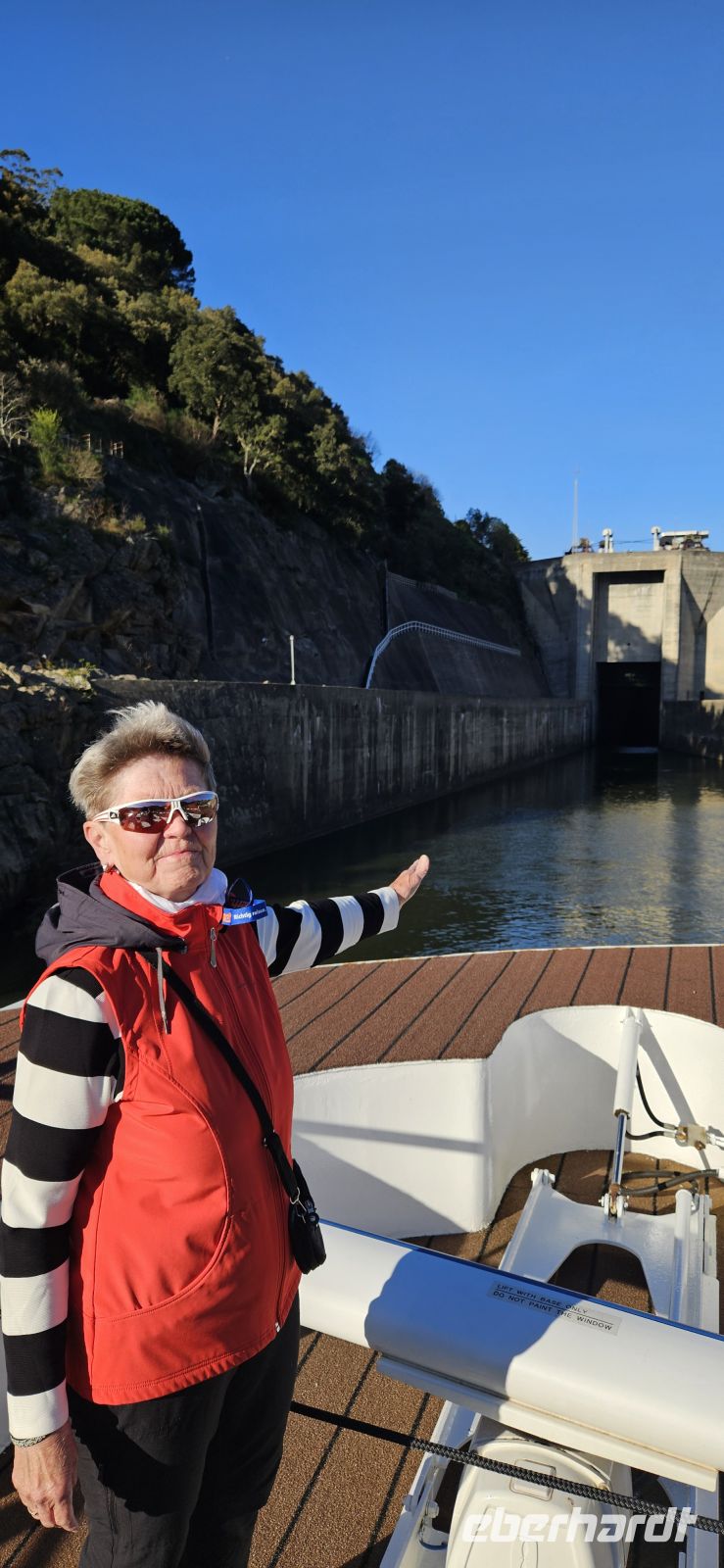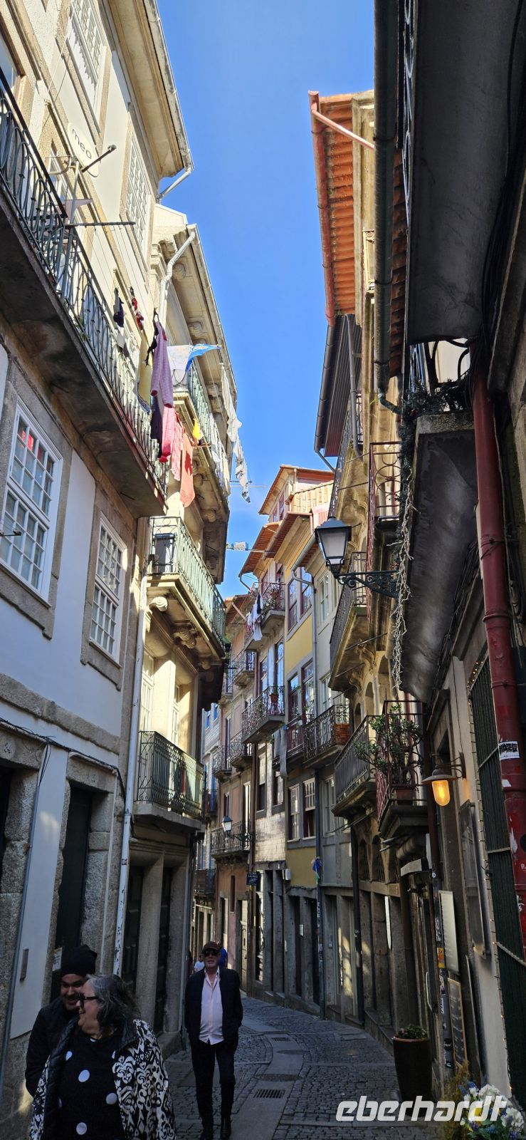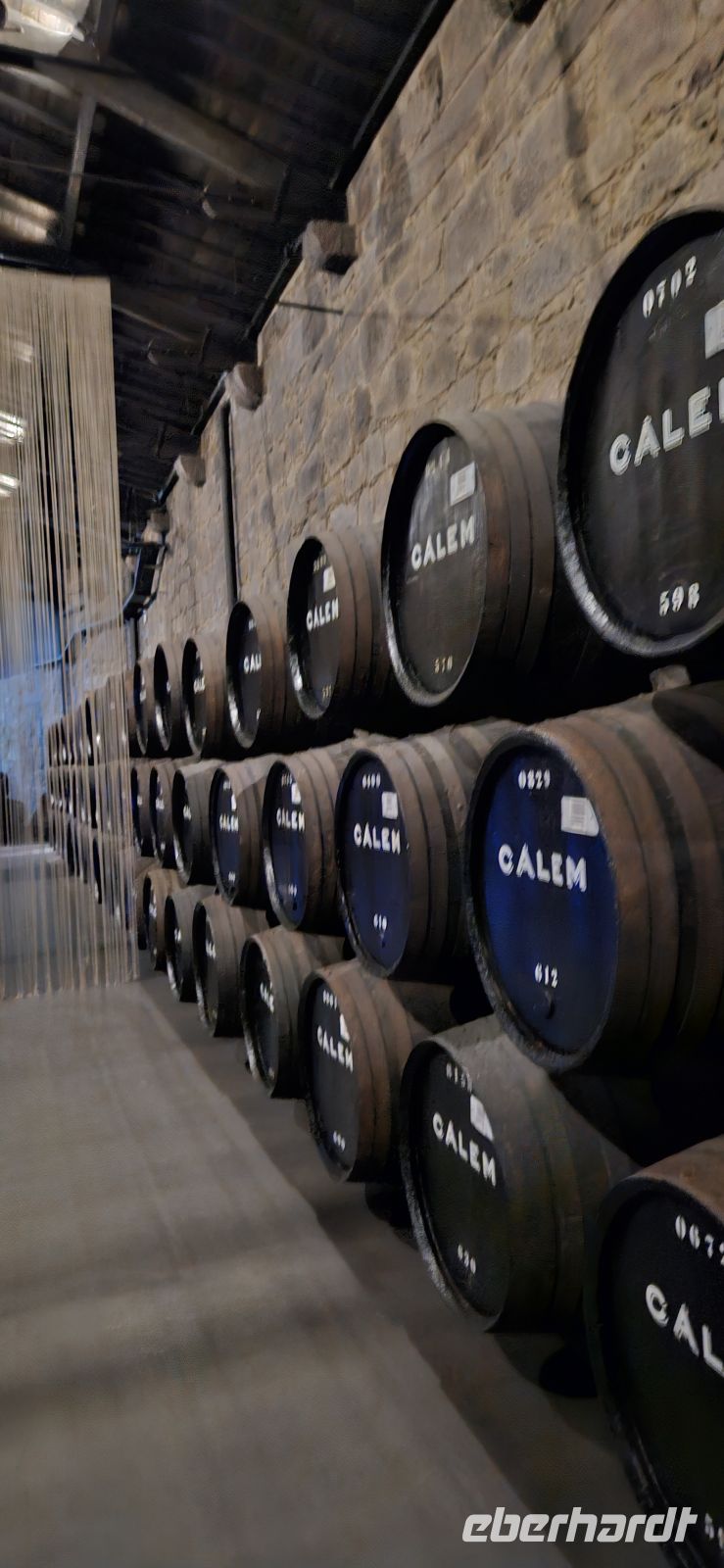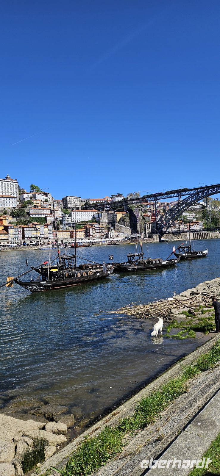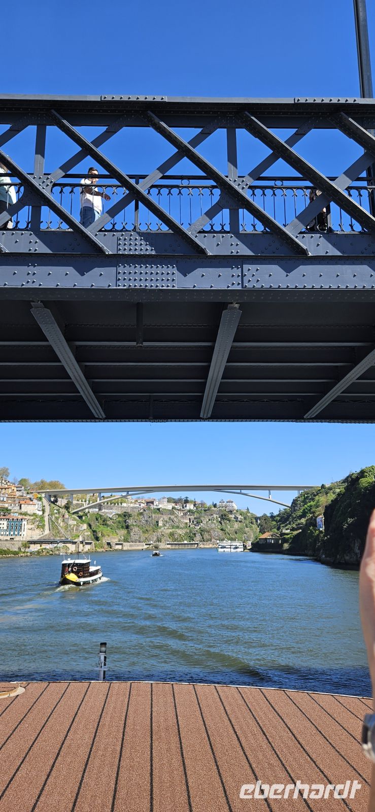 Frühstück gab es auf dem Schiff immer ab 7 Uhr und heute mussten noch die Audiogeräte an der Rezeption abgeholt werden, denn bereits 8.30 Uhr begann unser erster Ausflug. Unsere Singlegruppe war immer für den Bus 1 mit Reiseleiterin Vanessa und Fahrer Pedro eingeteilt. Wir fuhren von Gaia hinauf und über die Brücke hinüber nach Porto. An der Kathedrale stiegen wir aus und genossen zunächst den Blick über die Dächer der historischen Innenstadt von Porto. An der Kathedrale war gerade eine Rad Pilgergruppe dabei , ihre Pilgerhefte abzustempeln. Wir spazierten danach hinunter zum Bahnhof und mussten wegen der Bauarbeiten für die Metro den Seiteneingang nehmen. Der Bahnhof ist reich mit blau weissen Kacheln verziert. Darauf sind Szenen aus dem täglichen Leben sowie von geschichtlich bedeutenden Ereignissen dargestellt. Der Bahnhof wird von Pendlern täglich genutzt. Auf der Weiterfahrt durch das Zentrum von Porto kamen wir unter anderem am Rathaus und an der alten Universität vorbei, sahen viele Wartende vor einem berühmten Buchladen und fuhren schliesslich hinunter an den Atlantik, wo sich der Industriehafen und das neue Kreuzfahrtterminal befinden. Auf der Uferstrasse, die mit vielen grossen neuseeländischen Eisenholzbäumen gesäumt war, fuhren wir in Richtung Douro Mündung und weiter zurück nach Gaia. In Gaia befinden sich alle berühmten Portweinkellereien und wir besuchten die von Calem. Bei einer Führung erfuhren wir alles Wissenswerte über Anbau, Ernte und Verarbeitung der Trauben aus dem Dourotal und zum Schluss probierten wir einen Fine White Portwein und einen gemischten Roten Portwein. Auf dem Weg zurück zum Schiff gab es nochmal zahlreiche tolle Fotomotive. 13 Uhr legte die Douro Queen ab und nun begann endlich unsere Flusskreuzfahrt. Am Nachmittag befuhren wir die ersten beiden Schleusen und kurz nach 17 Uhr erreichten wir Caldas de Aregos. Dort blieben wir über Nacht.