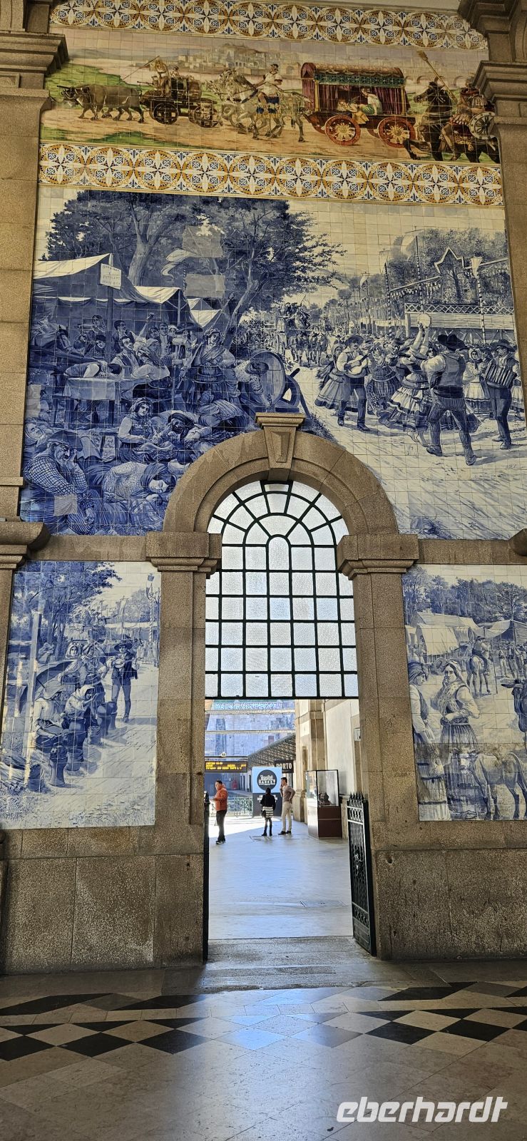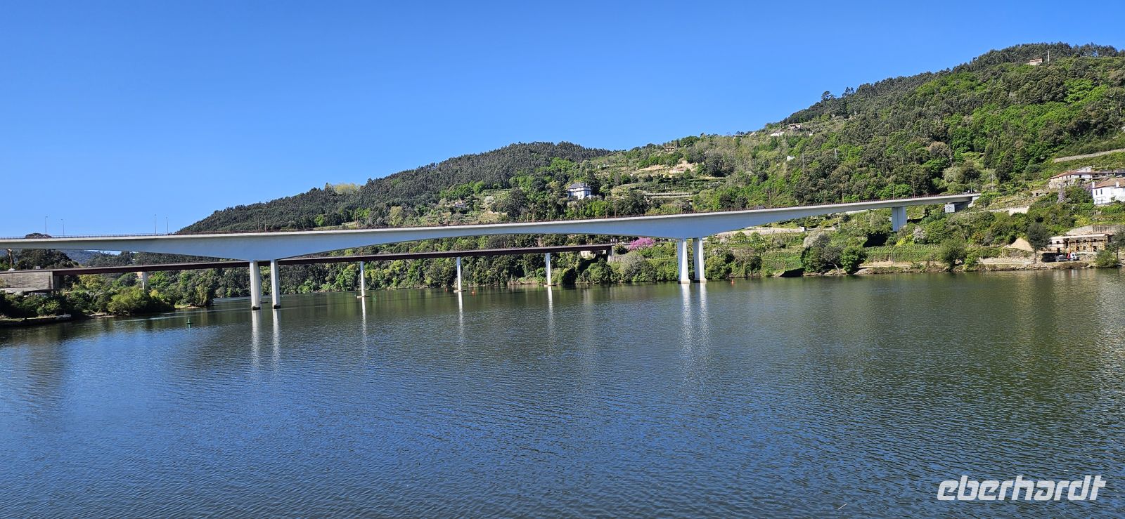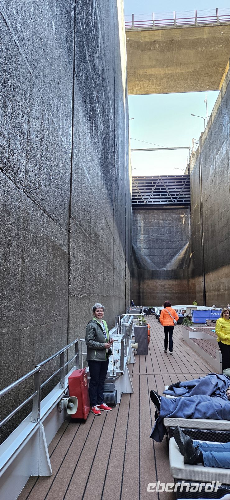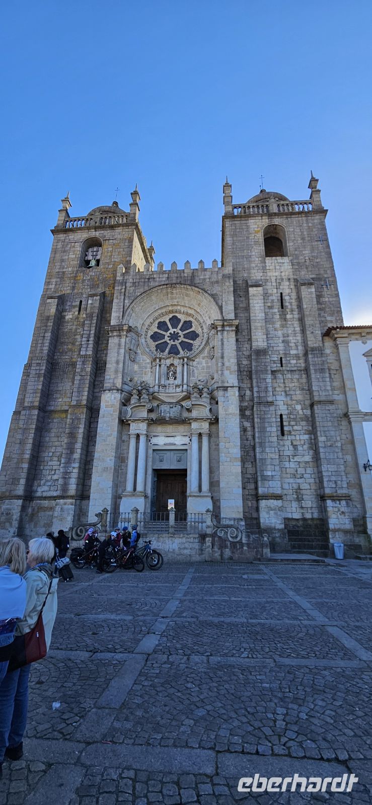 Frühstück gab es auf dem Schiff immer ab 7 Uhr und heute mussten noch die Audiogeräte an der Rezeption abgeholt werden, denn bereits 8.30 Uhr begann unser erster Ausflug. Unsere Singlegruppe war immer für den Bus 1 mit Reiseleiterin Vanessa und Fahrer Pedro eingeteilt. Wir fuhren von Gaia hinauf und über die Brücke hinüber nach Porto. An der Kathedrale stiegen wir aus und genossen zunächst den Blick über die Dächer der historischen Innenstadt von Porto. An der Kathedrale war gerade eine Rad Pilgergruppe dabei , ihre Pilgerhefte abzustempeln. Wir spazierten danach hinunter zum Bahnhof und mussten wegen der Bauarbeiten für die Metro den Seiteneingang nehmen. Der Bahnhof ist reich mit blau weissen Kacheln verziert. Darauf sind Szenen aus dem täglichen Leben sowie von geschichtlich bedeutenden Ereignissen dargestellt. Der Bahnhof wird von Pendlern täglich genutzt. Auf der Weiterfahrt durch das Zentrum von Porto kamen wir unter anderem am Rathaus und an der alten Universität vorbei, sahen viele Wartende vor einem berühmten Buchladen und fuhren schliesslich hinunter an den Atlantik, wo sich der Industriehafen und das neue Kreuzfahrtterminal befinden. Auf der Uferstrasse, die mit vielen grossen neuseeländischen Eisenholzbäumen gesäumt war, fuhren wir in Richtung Douro Mündung und weiter zurück nach Gaia. In Gaia befinden sich alle berühmten Portweinkellereien und wir besuchten die von Calem. Bei einer Führung erfuhren wir alles Wissenswerte über Anbau, Ernte und Verarbeitung der Trauben aus dem Dourotal und zum Schluss probierten wir einen Fine White Portwein und einen gemischten Roten Portwein. Auf dem Weg zurück zum Schiff gab es nochmal zahlreiche tolle Fotomotive. 13 Uhr legte die Douro Queen ab und nun begann endlich unsere Flusskreuzfahrt. Am Nachmittag befuhren wir die ersten beiden Schleusen und kurz nach 17 Uhr erreichten wir Caldas de Aregos. Dort blieben wir über Nacht.