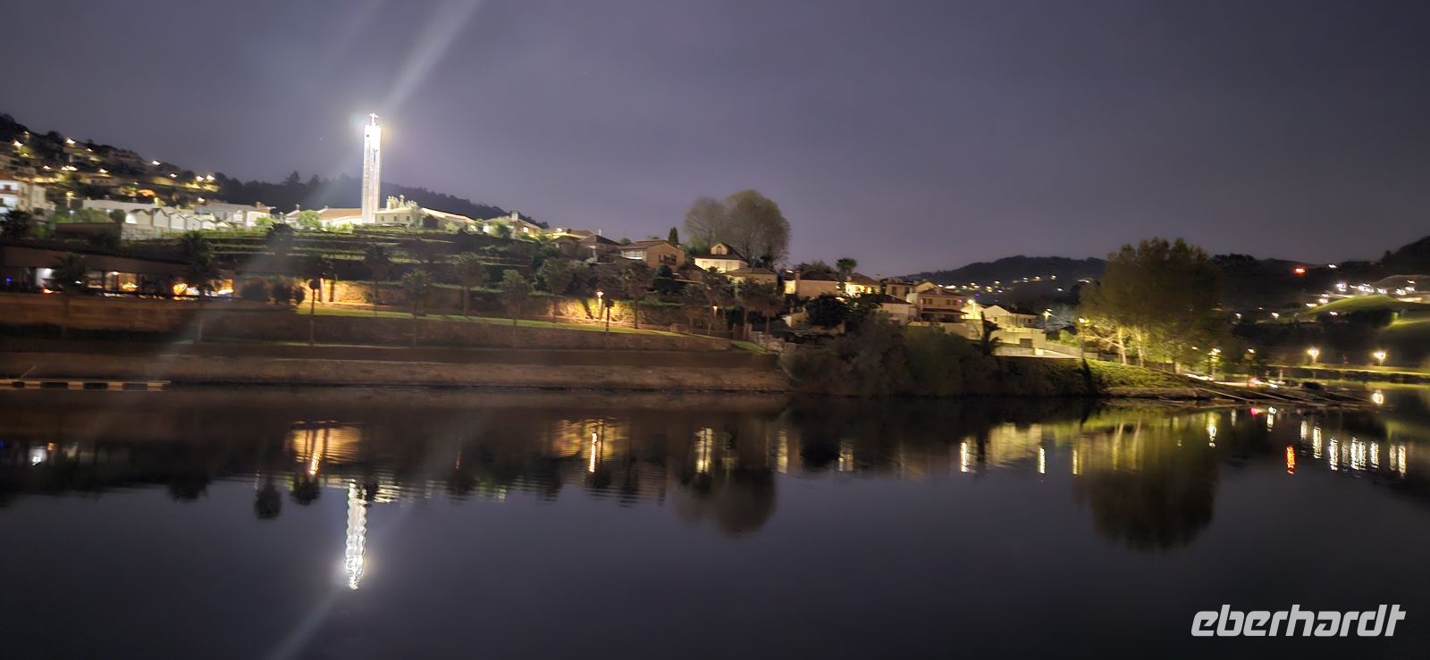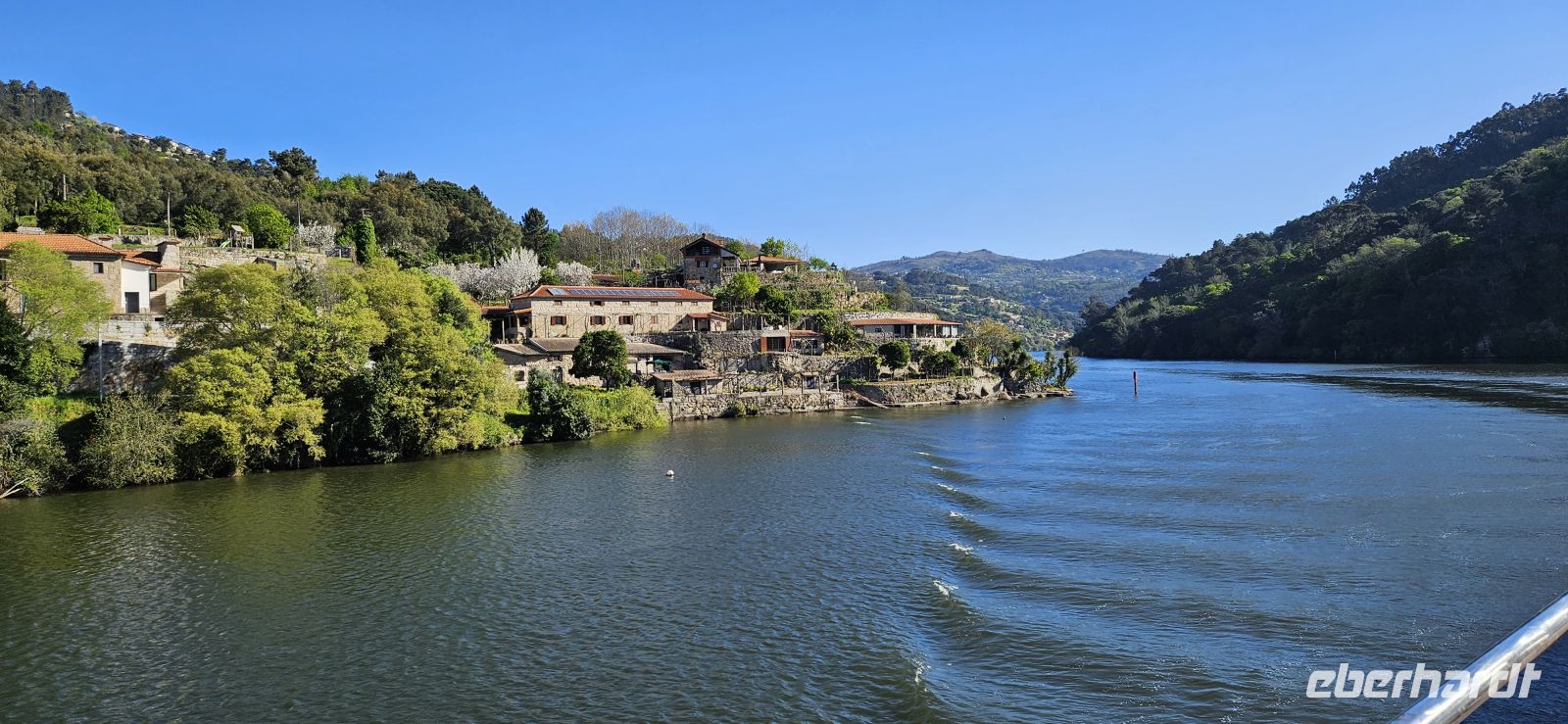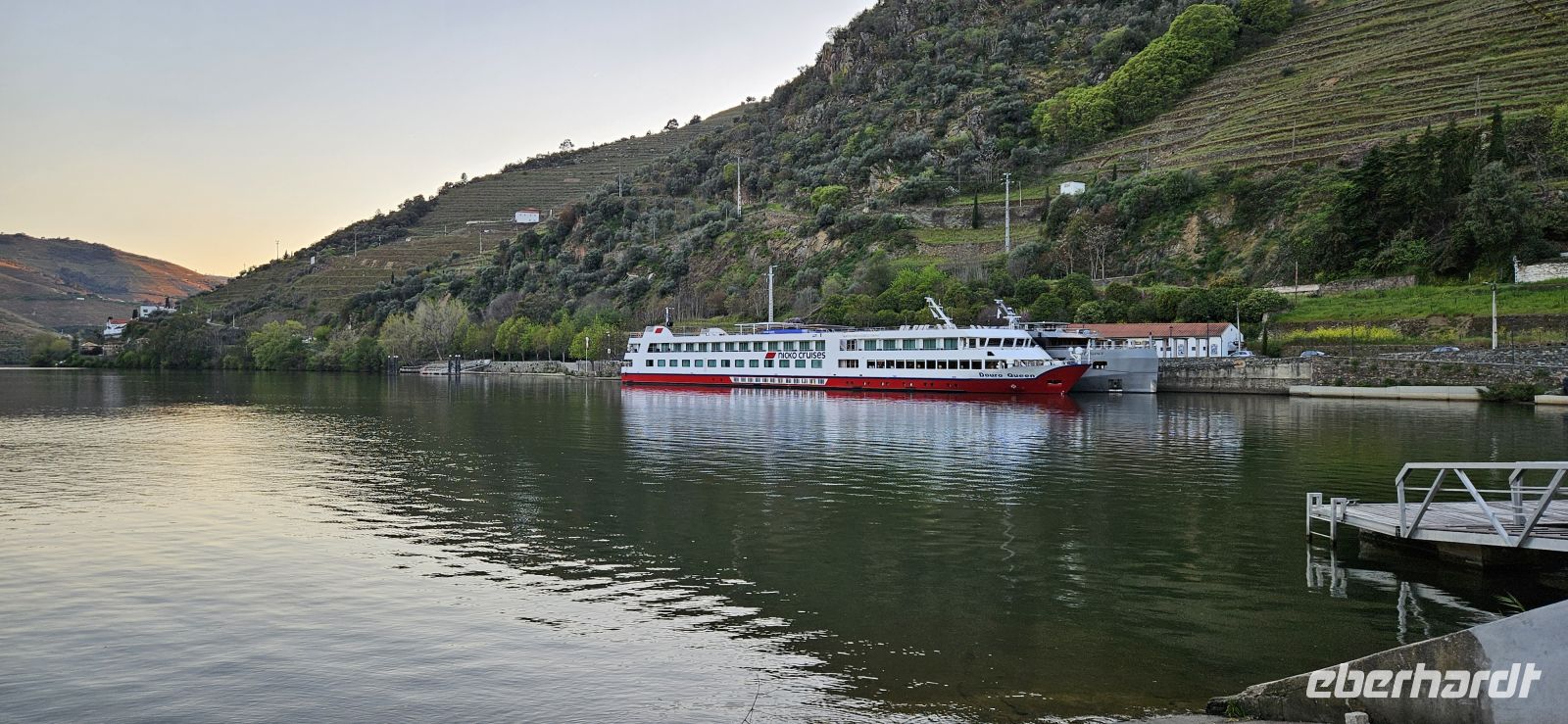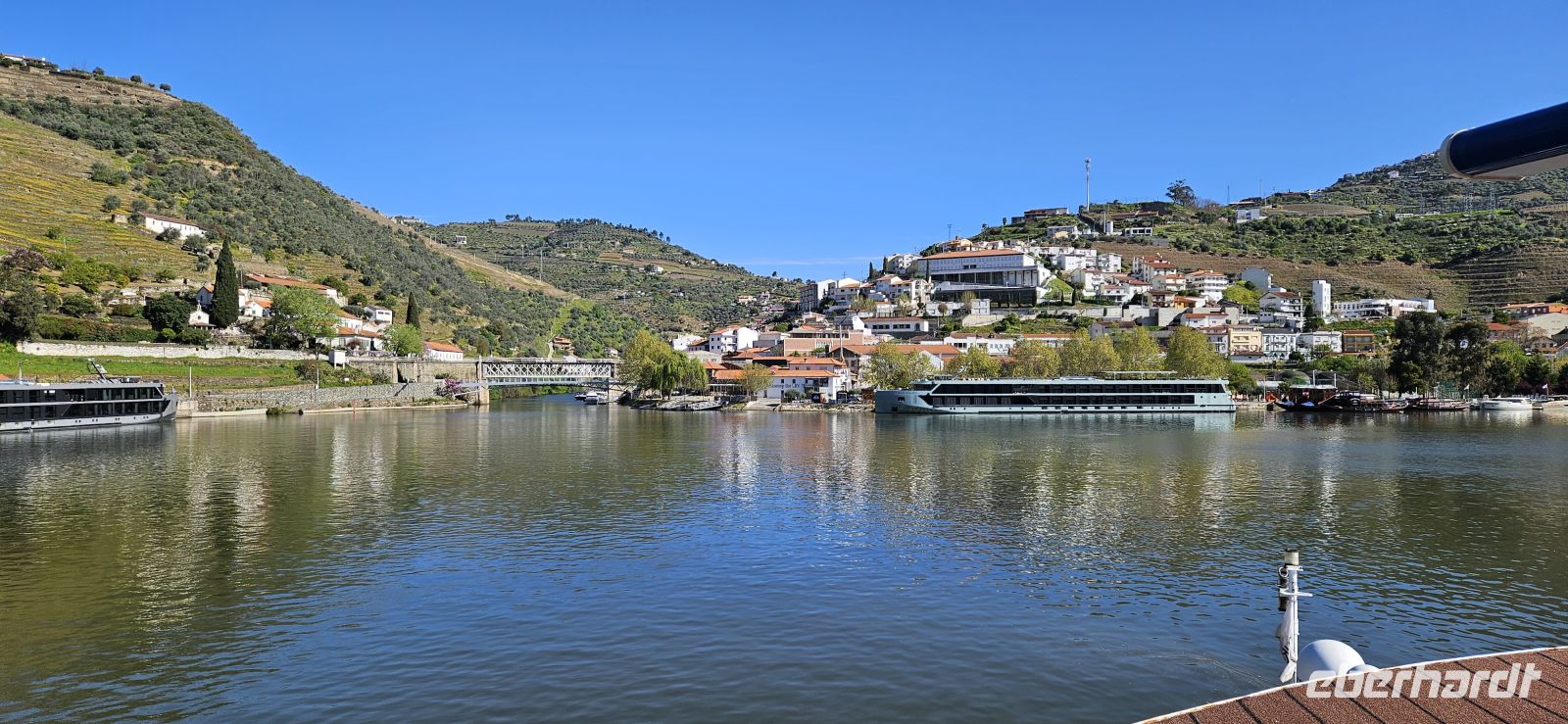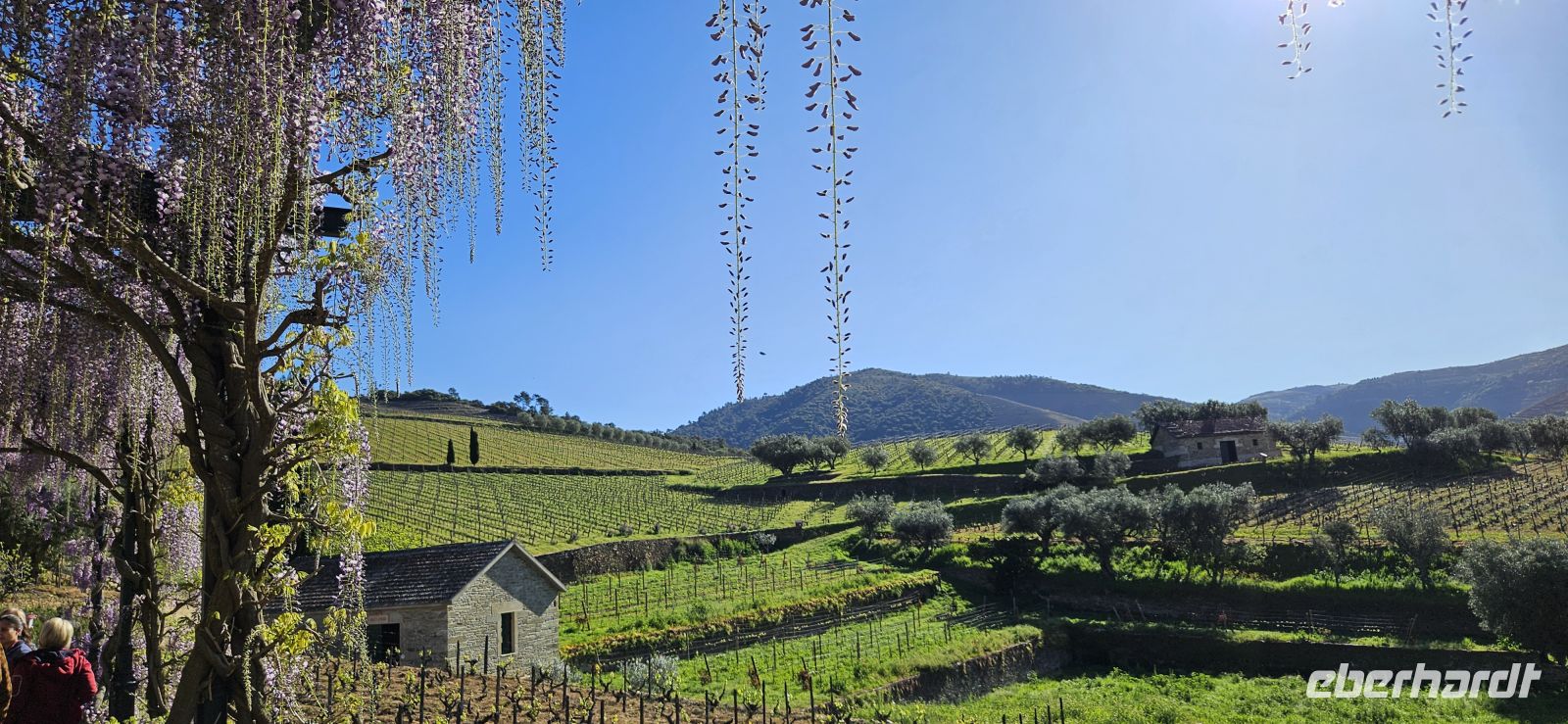 Nach dem Frühstück gab es einen kostenlosen, zusätzlichen Ausflug in die Quinta da Roeda am Rande von Pinhao. Wir fuhren 10 Minuten mit dem Bus dorthin und bekamen eine fachkundige Führung durch das gepfegte Anwesen. Die Glyzinien waren in voller Blüte und ein traumhafter Schuck an der Pergola im Weingut. Die Familie Croft betreibt das Weingut seit 1588 und ist eine der ersten, die Rose Portwein "Pink"herstellt. Den und einen weiteren roten Portwein durften wir probieren und so kehrten wir recht fröhlich zum Schiff zurück. 11 Uhr verliess die Douro Queen Pinhao und wir fuhren flussabwärts nach Regua. Nach 2 Stunden entspannter Fahrt durften wir in Regua sogar auf der Stadtseite anlegen, wo noch vor einer Woche das Hochwasser stand.