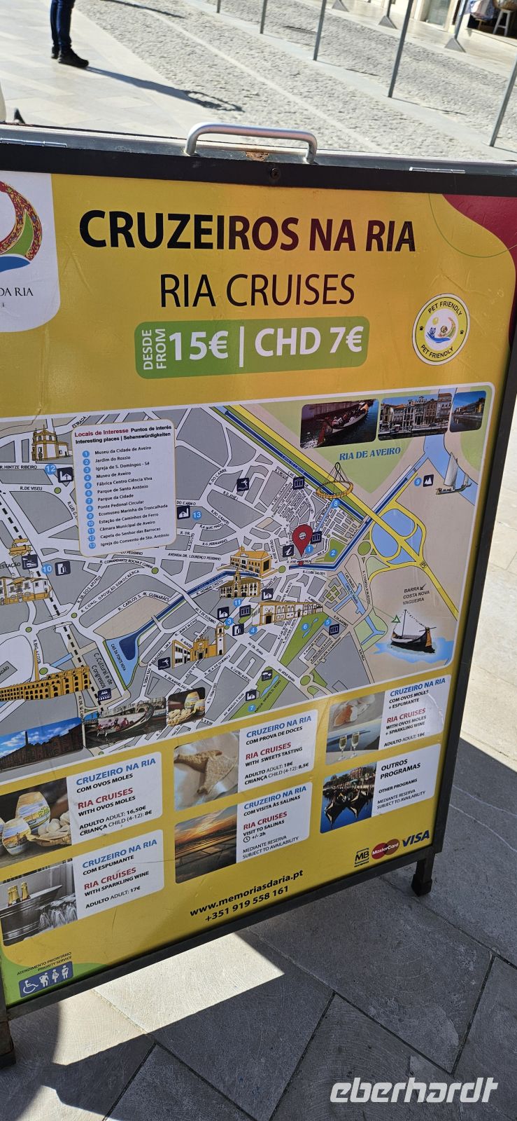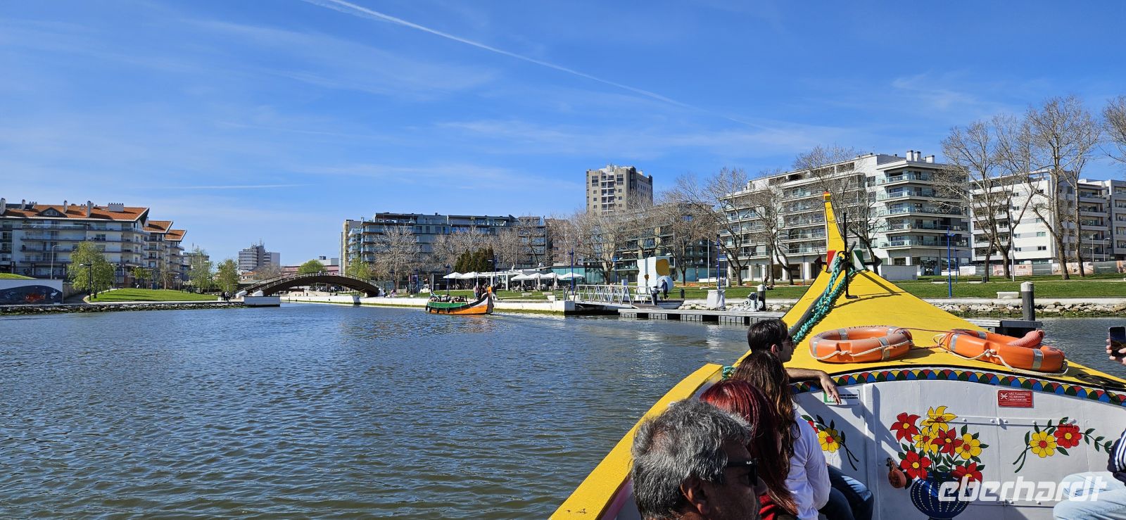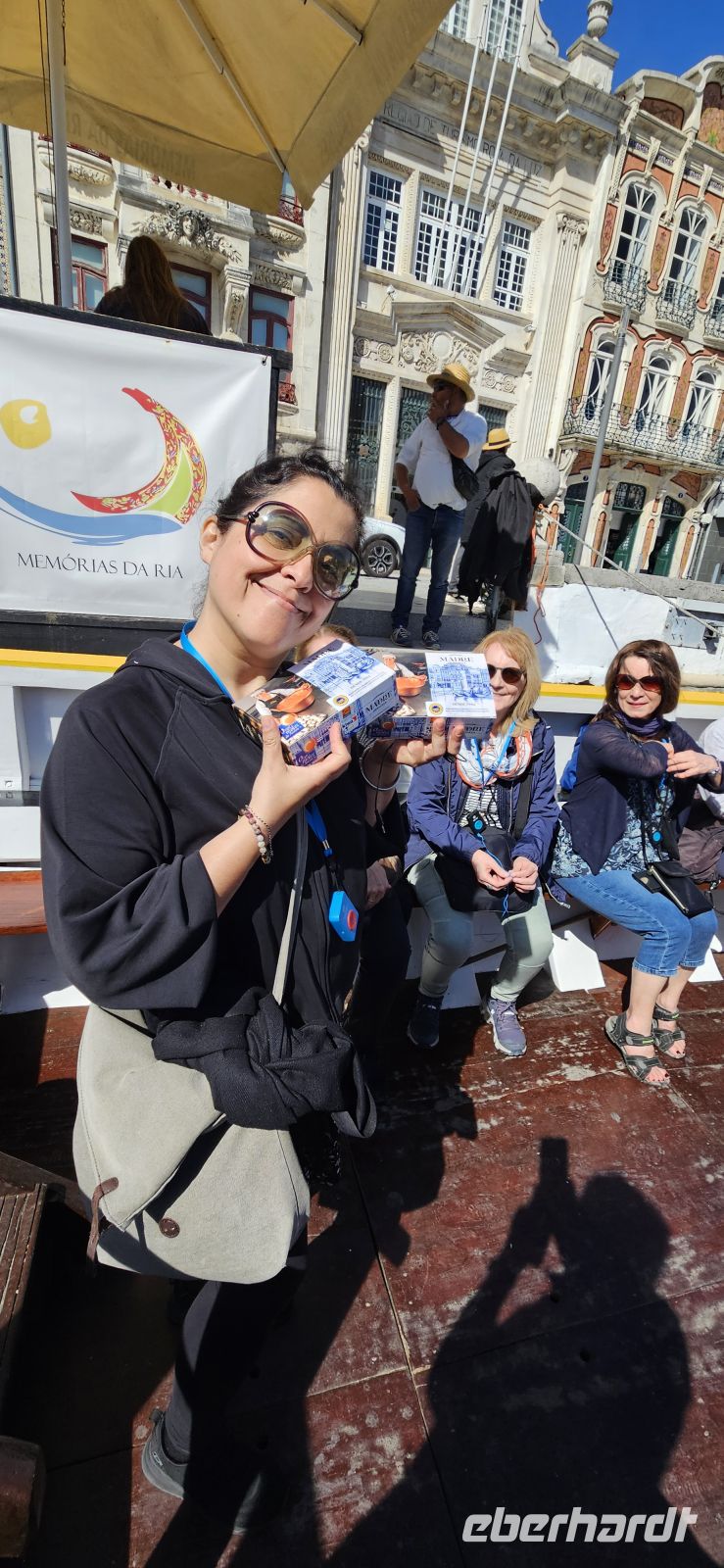 Dann ging unsere Fahrt weiter gen Norden und unterwegs konnten wir noch die Schäden von Sturm Kristina sehen. Viele umgestürzte und abgebrochene Bäume hatten die Landschaft verändert und man war dabei, das Holz zu bergen für den Abtransport. Zur Mittagszeit erreichten wir Aveiro, auch das Venedig Portugals genannt. Wir stärkten uns zunächst bei einer individuellen Mittagspause und trafen uns dann wieder zu einer Bootsfahrt durch die Kanäle von Aveiro. Mit einem historischen Holzboot waren wir unterwegs und konnten ganz entspannt die wunderschönen Jugendstilhäuser, sowie die neuen, modernen Bauten betrachten. Aveiro ist auch bekannt für ein süsses Gebäck - Ovos Moles und das probierten wir während der Bootsfahrt. Danach fuhren wir noch eine Stunde mit dem Bus bis nach Gaia, wo unsere "Douro Queen " schon zum Einsteigen bereit war. Unsere Koffer trugen fleissige Helfer an Bord und wir wurden nach und nach zum Einchecken aufgerufen. Jeder konnte sich in seiner Kabine einrichten und 19 Uhr gab es das erste Abendessen an Bord.