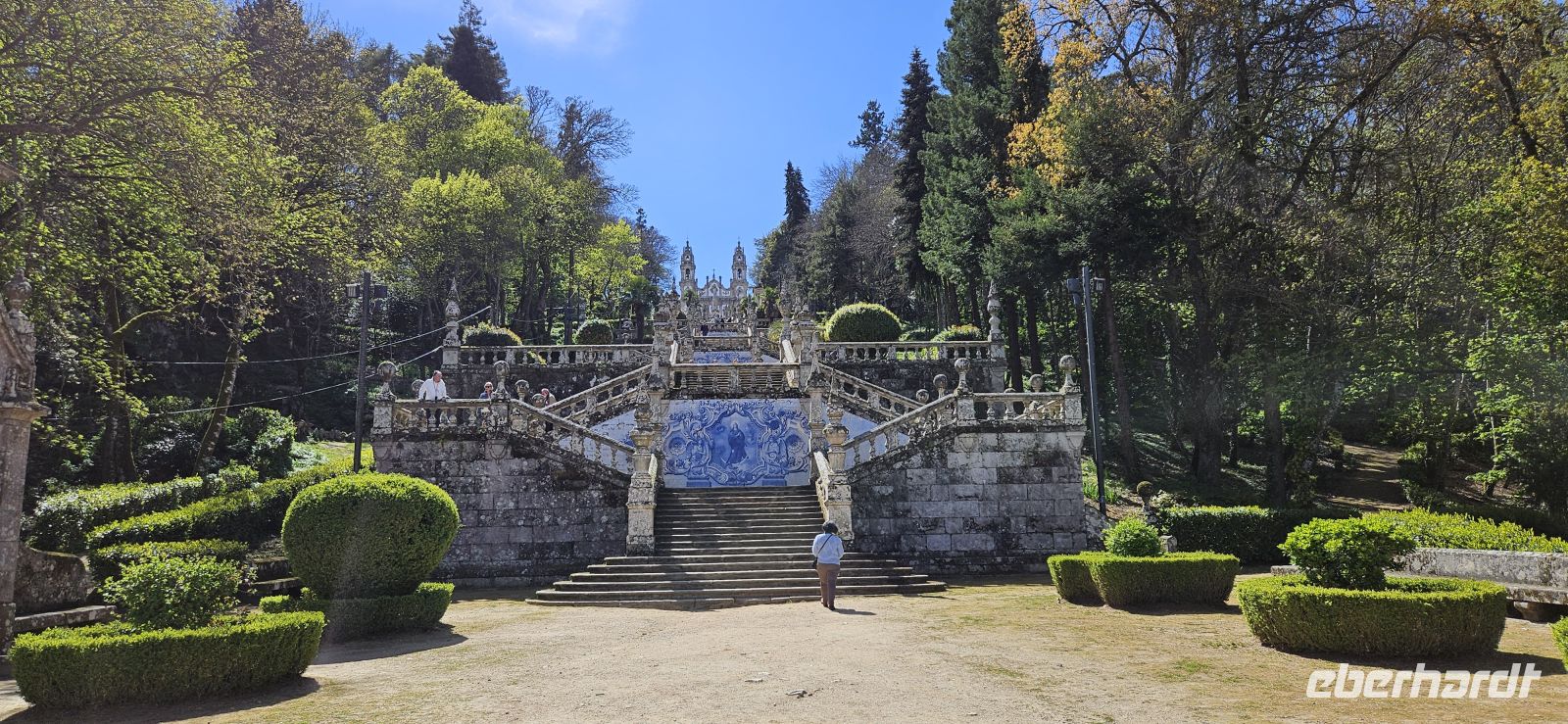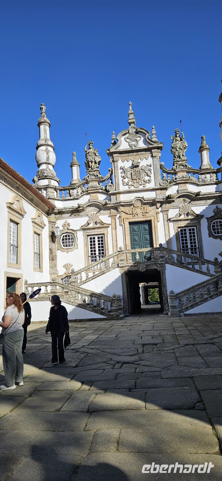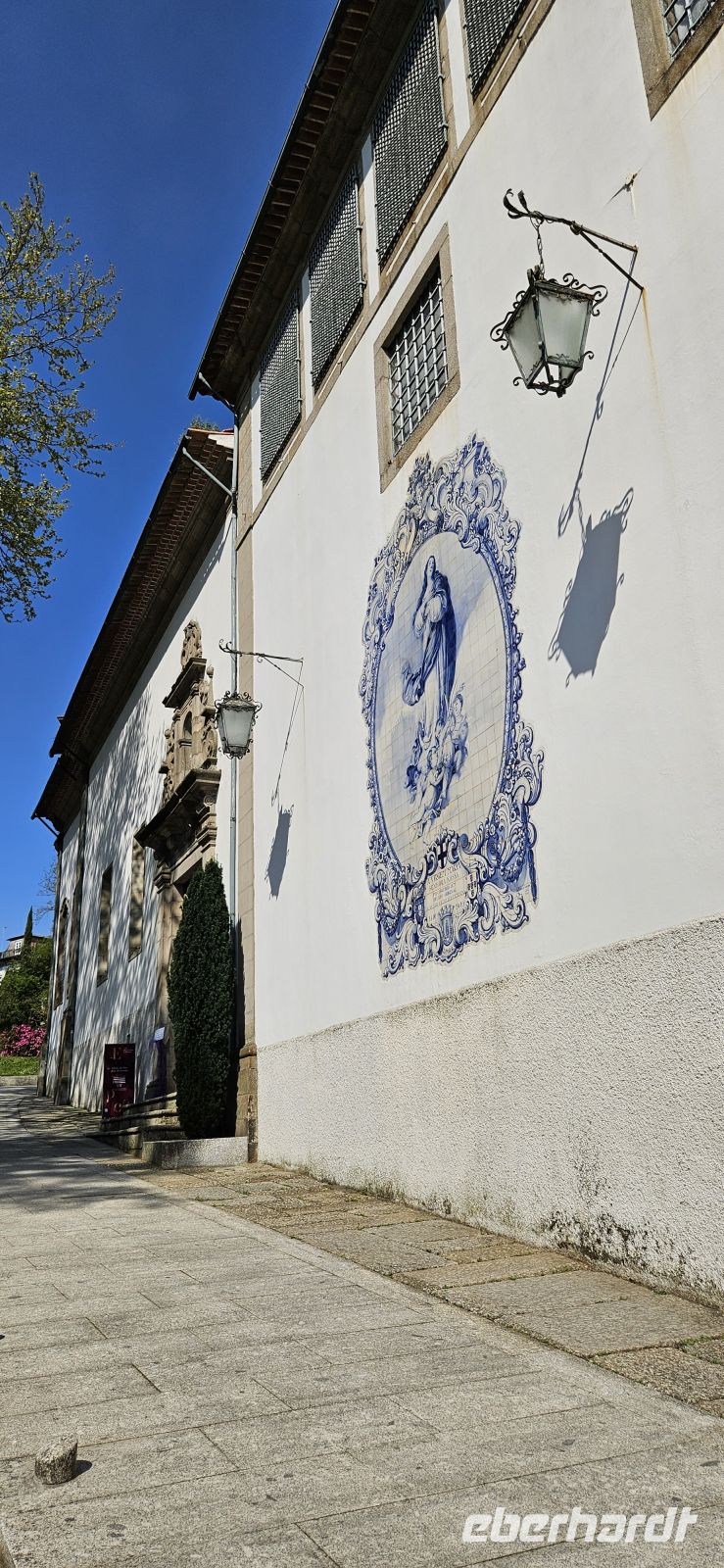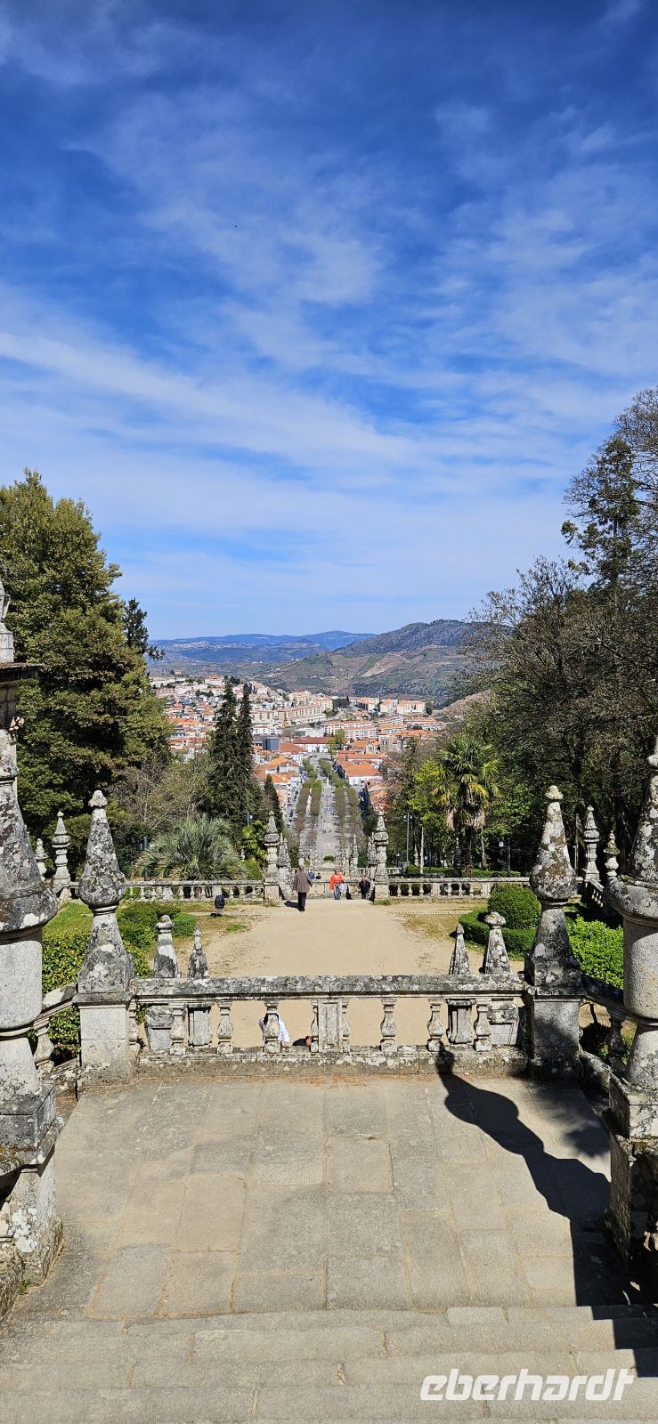 Am Nachmittag fand unser Ausflug nach Lamego statt. Über die Autobahn erreichten wir nach kurzer Fahrtzeit Lamego. Wir verliessen den Bus oben an der Wallfahrtskirche und besuchten das Innere der reich geschmückten Kirche. Es war Palmsonntag und in der Kirche wurde alles für den Auftritt eines Chores vorbereitete. Hinunter in die Stadt konnten wir mit dem Bus fahren oder über die reichlich 600 Stufen einer prunkvoll gestalteten Treppenanlage gehen. An den Absätzen waren die Portale mit Kachelmotiven geschmückt und ringsum blühten die Bäume. Unten in Lamego spazierten wir über die Hauptallee mit vielen Wasserbecken, die mit Plastiken geschmückt waren, und wir hatten Zeit für einen Kaffee und den Besuch der Kathedrale. Hinter dem Bischofspalast warteten unsere Busfahrer und brachten uns zurück nach Regua. Wer dann noch Lust hatte, konnte mit Vanessa das interessante Museum zum Weinbau in Regua besichtigen.