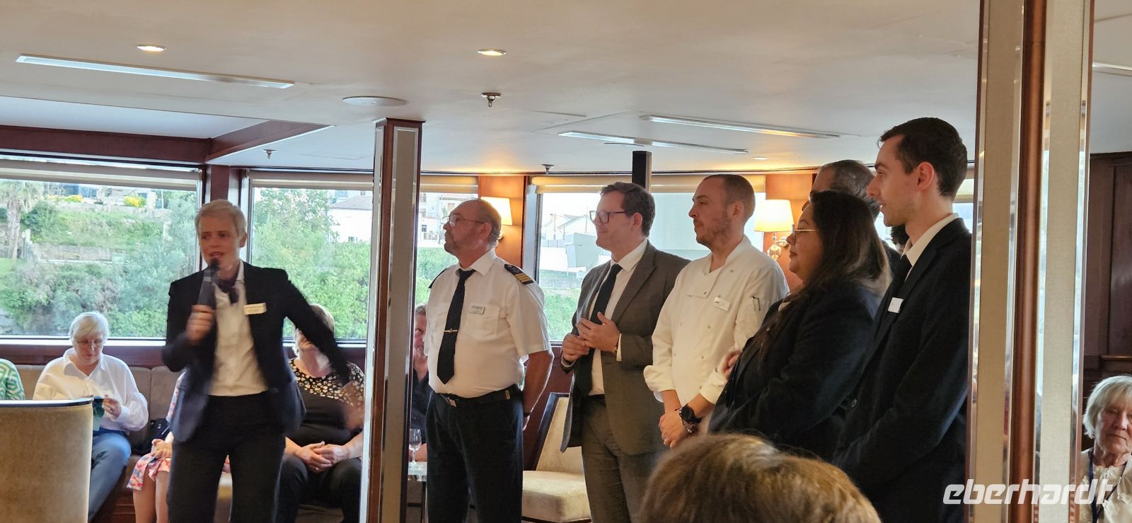 Vor dem Abendessen trafen wir uns in der Bar und bei einem Glas Sekt wurde die gesamte Crew vorgestellt. Danach wurde uns das am morgen bestellte Menue serviert.