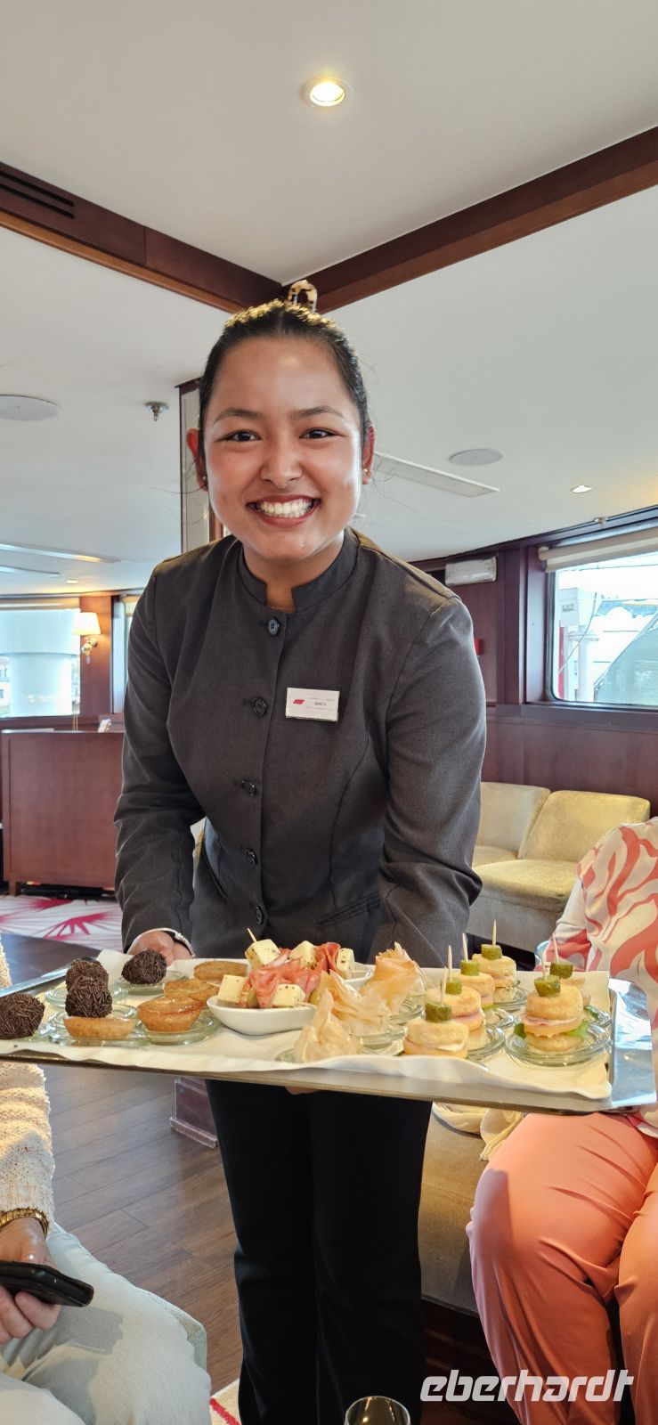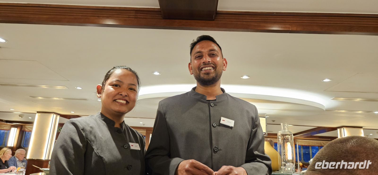 Vor dem Abendessen gab es im Salon den Abschiedsempfang der Crew und danach ein festliches Menue im Restaurant mit leider zuvielen Leckereien, die wir nicht alle schaffen konnten.