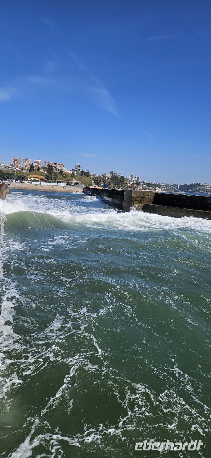 Nun wurde es langsam ernst und das Ende unserer Douro Kreuzfahrt kam immer näher. Heute fuhren wir die letzte Etappe von Entre-os-Rios zurück nach Porto und zu unserer Anlegestelle in Vila Nova de Gaia. 11.30 Uhr legten wir an, gingen zum Mittagessen und dann hatten wir den ganzen Nachmittag für individuelle Entdeckungen Zeit. Einige Gäste gingen mit mir hinüber nach Porto zu Fuss über die Brücke und dann weiter bis zur Abfahrtsstelle der historischen Strassenbahn Nr.1. Sie fährt vom Stadtzentrum immer am Douroufer entlang hinaus zur Douromündung am Atlantik. Die Fahrt war ein Erlebnis, auch wenn wir nur Stehplätze hatten. Von der Endhaltestelle spazierten wir zum Leuchtturm an der Douromündung und dort gab es gewaltige Wellen und starken Wind. Die frische Luft tat gut und auf dem Rückweg machten wir noch kurz einen Stopp in einem kleinen Lokal. Danach fuhren wir zurück nach Porto und spazierten gemütlich wieder hinüber zu unserem Schiff. Nun mussten spätestens die Koffer gepackt werden und das letzte Abendessen liess etwas Wehmut aufkommen.