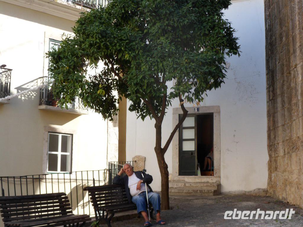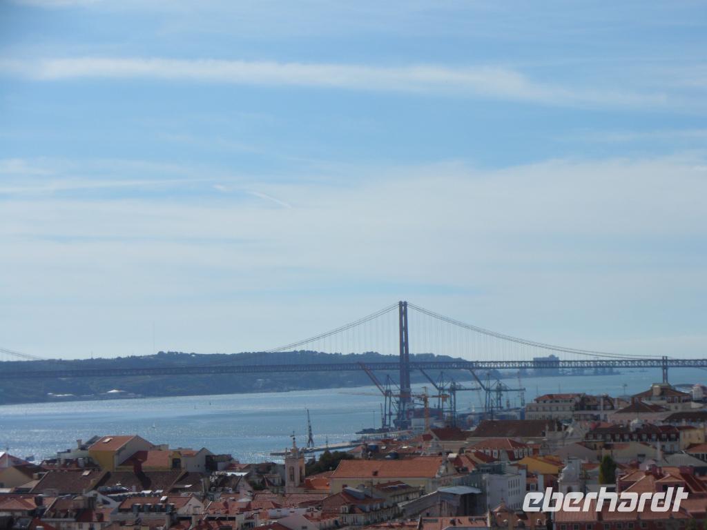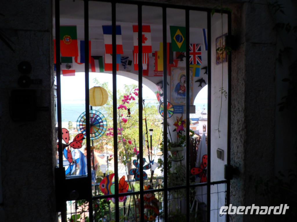 13.00Uhr stiegen wir wieder in den Bus und fuhren Richtung Altstadt vorbei an kleinen Häusern mit wunderschön verzierten Balkonen, vorbei an der roten Brücke des 25. April, sie ähnelt der Golden Gate Bridge in San Franzisko,am Staßenbahnmuseum, am Bahnhof "Cais de Sotre" vorbei an den Docas und an der Christus Statue wo die herrlichen Jacaranda Bäume in diesem Jahr zum 2. Mal blühten. Am schönsten Platz der Stadt" Comercio ", laut Aussage von Margarida, machten wir Halt und gingen Richtung Oberstadt, Bairro Alto. Hier konnten sich die Gäste in einen der vielen Kaffees und Bars stärken. Wir unternahmen noch einen kleinen Spaziergang durch die engen Gassen vorbei an mehreren Theatern und und an der oberen Station des Elevador da Gloria. 14.30 Uhr fuhren wir in die "Baixa",die Altstadt und gingen durch die kleinen Straßen zum Castelo de Sao Jorge das wir gemeinsam besichtigten und auf der Aussichtsplattform einen atemberaubenden Blick über die Baixa bis zum Ufer des Tejo hatten.
