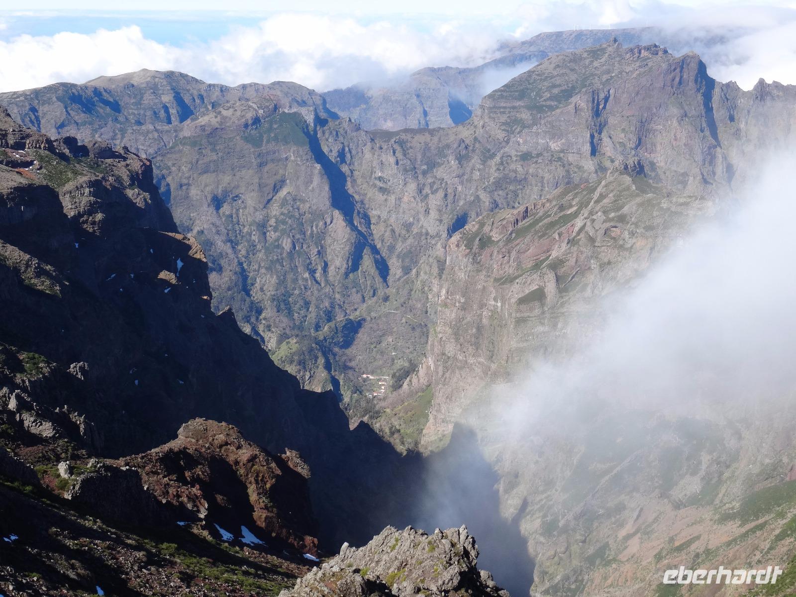 Bei herrlichem Sonnenschein fuhren wir weiter zum Gipfel des dritthöchsten Berges auf Madeira - dem Pico de Areiro auf 1818 Meter Höhe. Von hier bot sich uns eine phantastische Aussicht auf das Nonnental und den östlichsten Zipfel der Insel. Weiter ging es in das Naturschutzgebiet Ribeiro Frio (kalter Bach), wo wir als Generalprobe für unsere Levada-Wanderung am Dienstag mit einer Mini-Levada-Wanderung zum Aussichtspunkt "Balcoes" eine Trainingseinheit absolvierten.