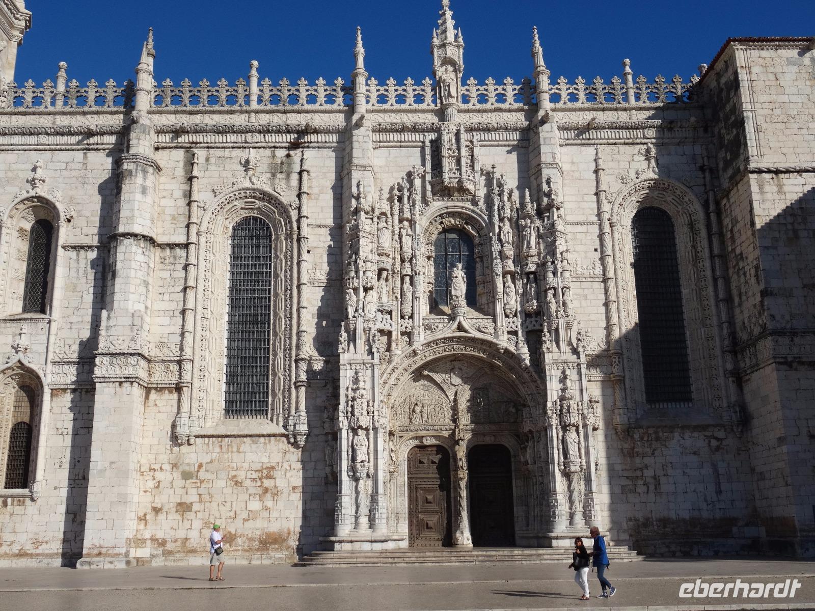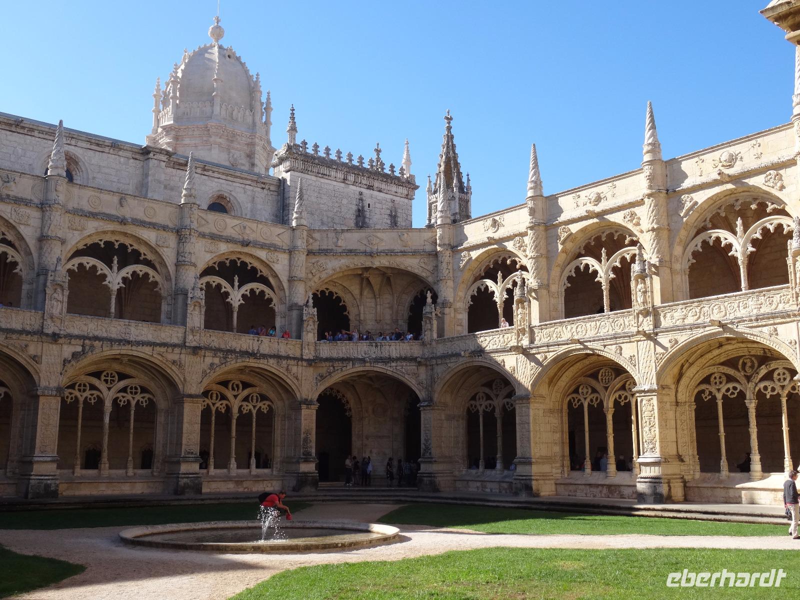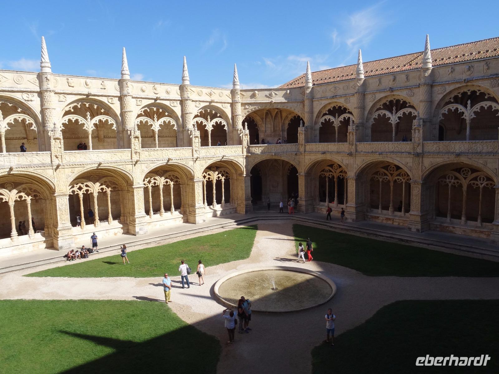 Gestärkt vom Frühstück, starteten wir bei herrlichem Sommerwetter zum ersten Teil der Stadtrundfahrt durch die portugiesische Hauptstadt. Ein erster Halt am Park Edward des VII bot uns bereits einen beeindruckenden Blick auf die Stadt. Weiter ging es mit dem Bus in den Stadtteil Belem, stets versorgt mit Informationen über Lissabon von Rute. Hier besichtigten wir das berühmte Hieronynimus-Kloster, welches nicht nur von außen betrachtet sehr faszinierend ist, sondern auch innen einen wahnsinnig tollen Innenhof zu bieten hat. Rute führte uns durch das Kloster und erklärte uns alles über den Bau und die Besonderheiten der Architektur und Geschichte... Von soviel Kultur hungrig gemacht, verkosteten wir anschließend nahe dem Torre de Belem eine Köstlichkeit Lissabons - "Pasteis de Nada". An diese leckeren Puddingtörtchen "kann man sich gewöhnen". Einer schönen Tradition von Eberhardt Travel folgend nutzten wir die Gelegenheit, vor dem wunderschönen kleinen Turm am Ufer des Tejo ein erstes Gruppenfoto "zu schießen". Nach einem weiteren Fotostopp am Entdeckerdenkmal, vorbei an der Brücke des 25. April (ein Hauch von San Fransisco war zu spüren), erreichten wir die Altstadt (Baixa), um am Rossio - dem Zentrum von Lissabon - für heute weitere Erkundigungen auf eigene Faust zu unternehmen.