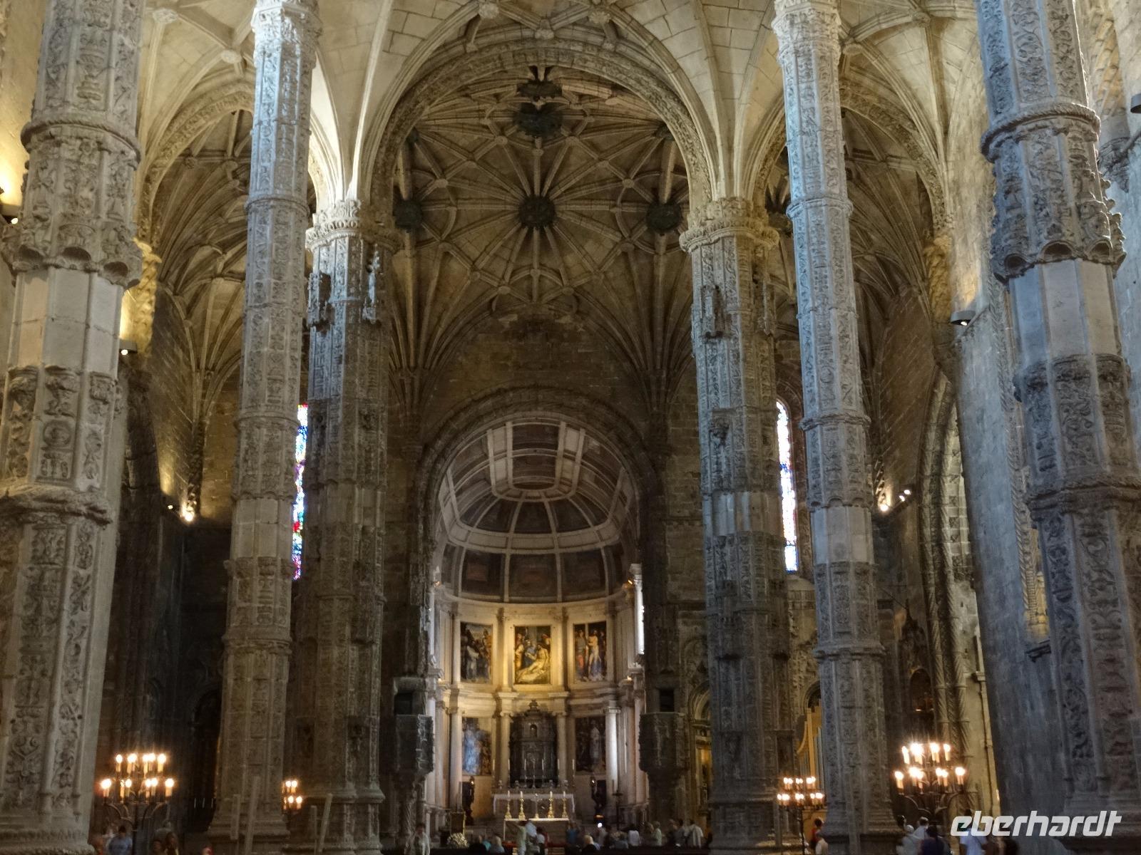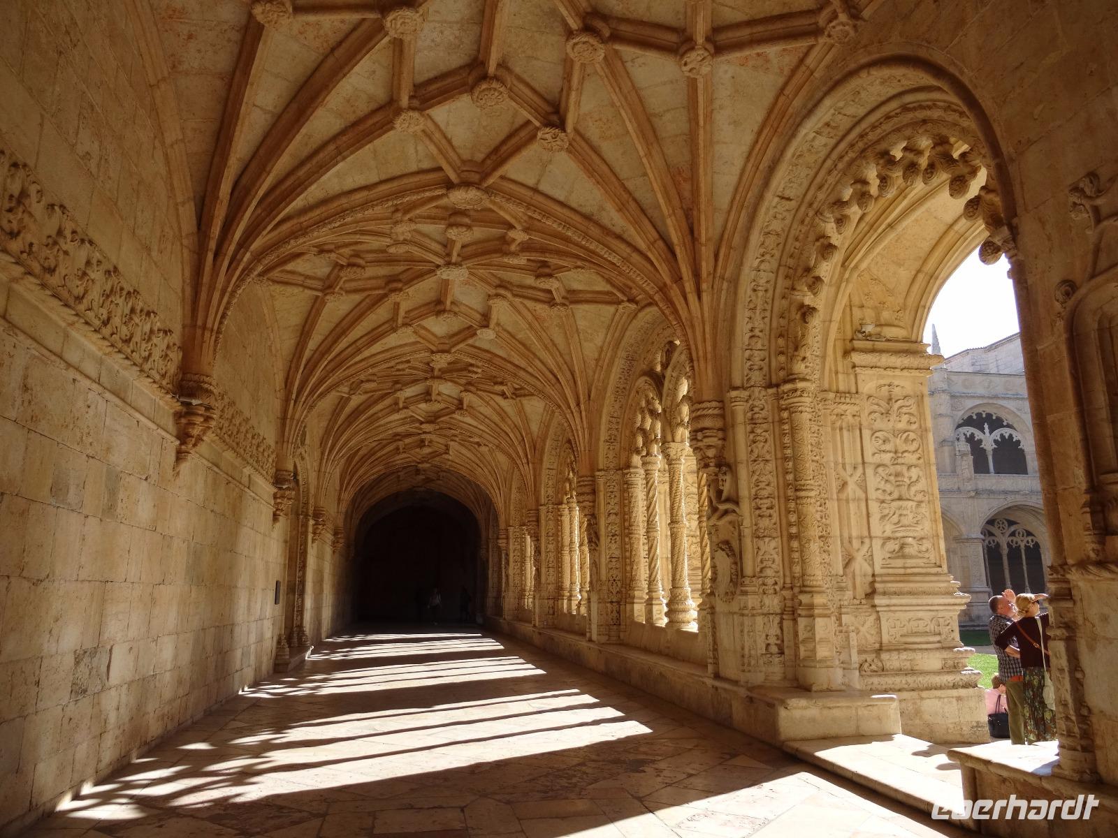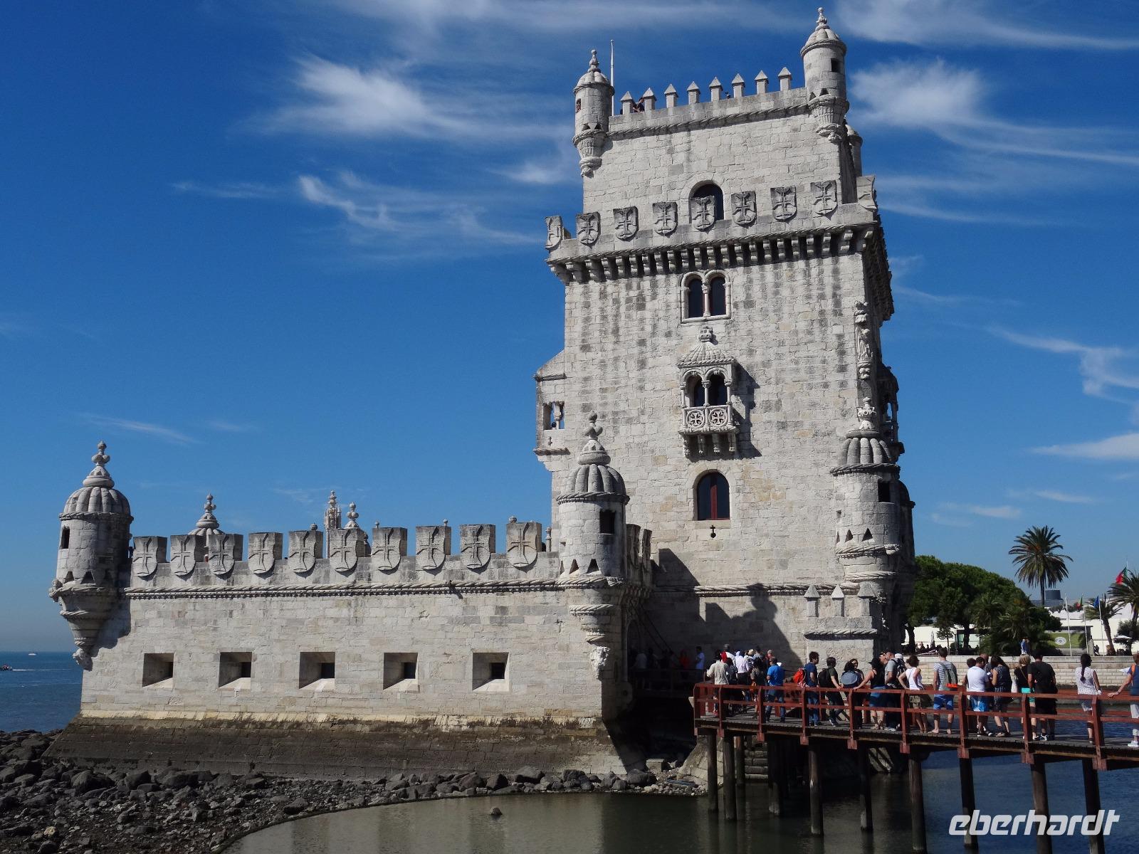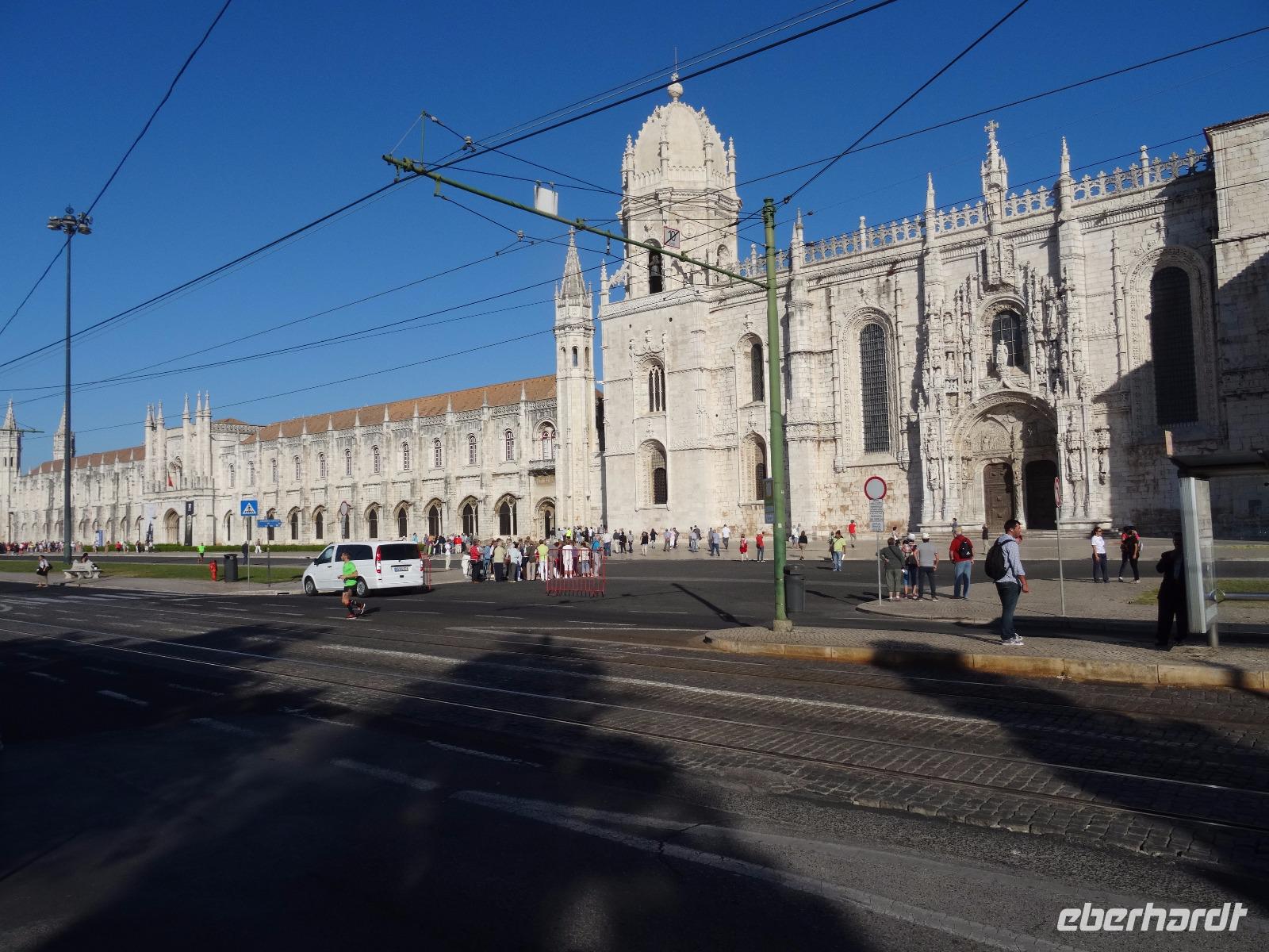 Gestärkt vom Frühstück, starteten wir bei herrlichem Sommerwetter zum ersten Teil der Stadtrundfahrt durch die portugiesische Hauptstadt. Ein erster Halt am Park Edward des VII bot uns bereits einen beeindruckenden Blick auf die Stadt. Weiter ging es mit dem Bus in den Stadtteil Belem, stets versorgt mit Informationen über Lissabon von Rute. Hier besichtigten wir das berühmte Hieronynimus-Kloster, welches nicht nur von außen betrachtet sehr faszinierend ist, sondern auch innen einen wahnsinnig tollen Innenhof zu bieten hat. Rute führte uns durch das Kloster und erklärte uns alles über den Bau und die Besonderheiten der Architektur und Geschichte... Von soviel Kultur hungrig gemacht, verkosteten wir anschließend nahe dem Torre de Belem eine Köstlichkeit Lissabons - "Pasteis de Nada". An diese leckeren Puddingtörtchen "kann man sich gewöhnen". Einer schönen Tradition von Eberhardt Travel folgend nutzten wir die Gelegenheit, vor dem wunderschönen kleinen Turm am Ufer des Tejo ein erstes Gruppenfoto "zu schießen". Nach einem weiteren Fotostopp am Entdeckerdenkmal, vorbei an der Brücke des 25. April (ein Hauch von San Fransisco war zu spüren), erreichten wir die Altstadt (Baixa), um am Rossio - dem Zentrum von Lissabon - für heute weitere Erkundigungen auf eigene Faust zu unternehmen.