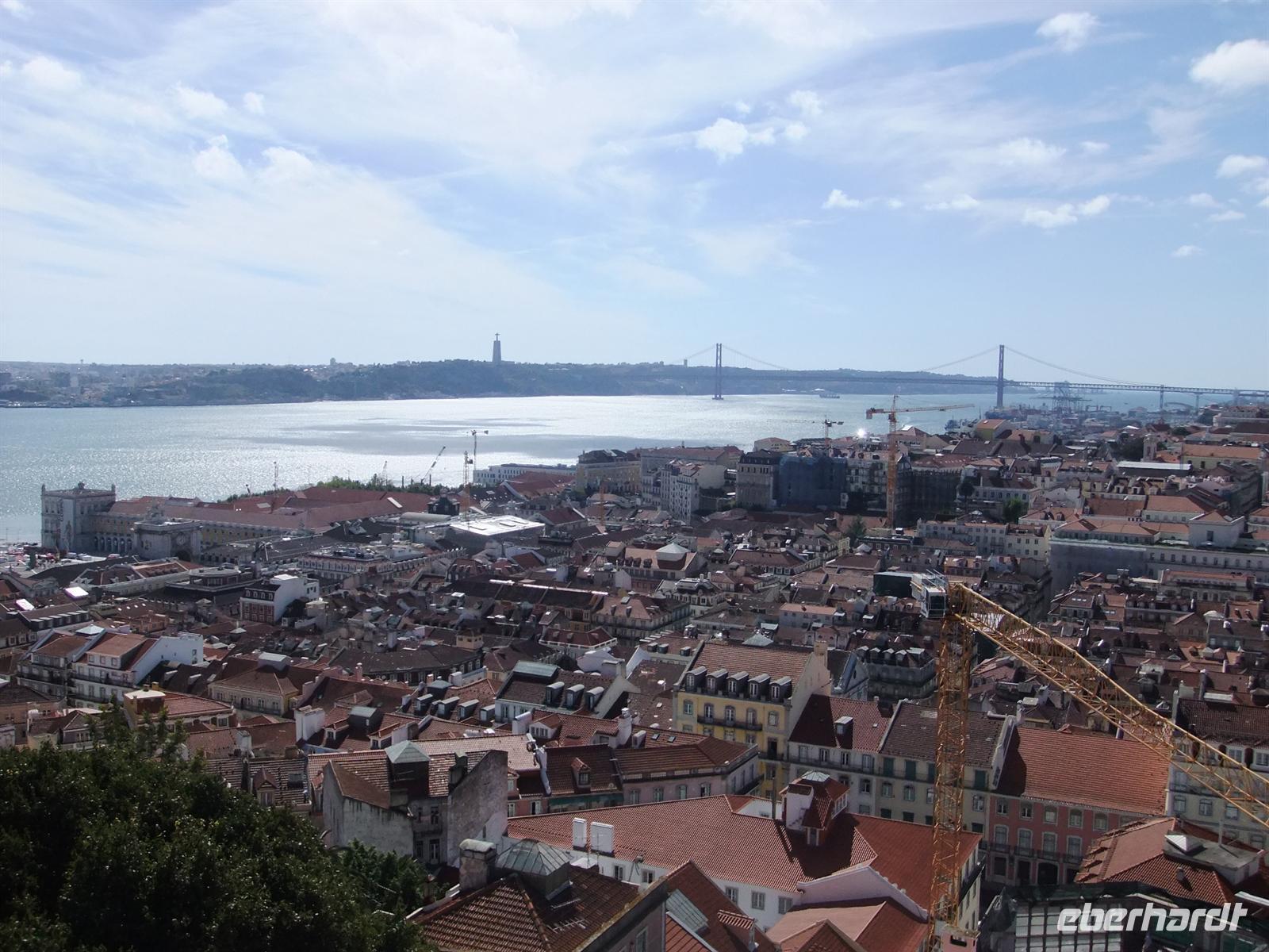 Nun hieß es aber erst mal Pause machen. Nach diesen vielen Eindrücken führte uns Margarida mit dem Bus in die Unterstadt Baixa. Dort entließ sie uns für knapp 2 Stunden, sodass alle genügend Zeit hatten sich etwas Leckeres fürs Mittagessen zu suchen oder noch eigene Erkundungen zu machen. Die Baixa bietet hierfür vieles um sich die Zeit angenehm zu vertreiben. Nachdem alle Gäste gestärkt waren hieß für uns der nächste Programmpunkt die Burg São Jorge. Wir fuhren erst bis zur Sé Catedral, in der gerade eine Trauung stattfand. Die letzten Meter bis zur Burg führten uns durch die engen Gassen der Alfama. Auf der Burg angekommen, hatten alle Freizeit den Ausblick über die Stadt auf eigenen Wegen zu genießen. Denn wo man auch steht, man gewinnt immer wieder einen anderen Blick auf die Stadt. Der größte Teil der Gruppe unternahm anschließend ein Spaziergang durch die Alfama. Da hierbei viel zu laufen war, fuhr ich mit zwei Gästen dem Bus zum Praça da Figueira, wo wir auf den Rest der Gruppe und dem Bus schließlich warteten.
