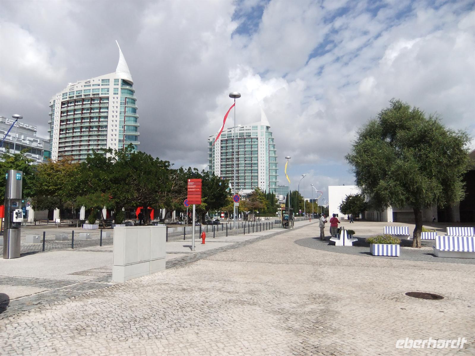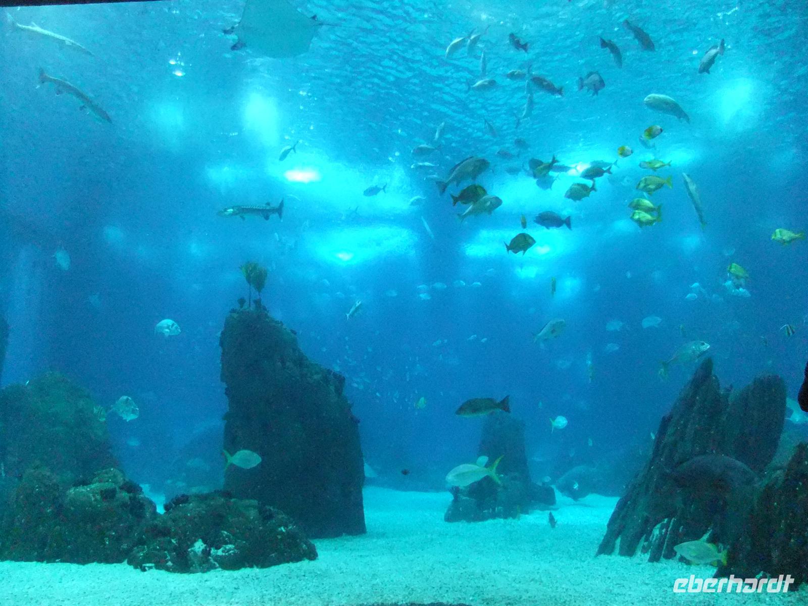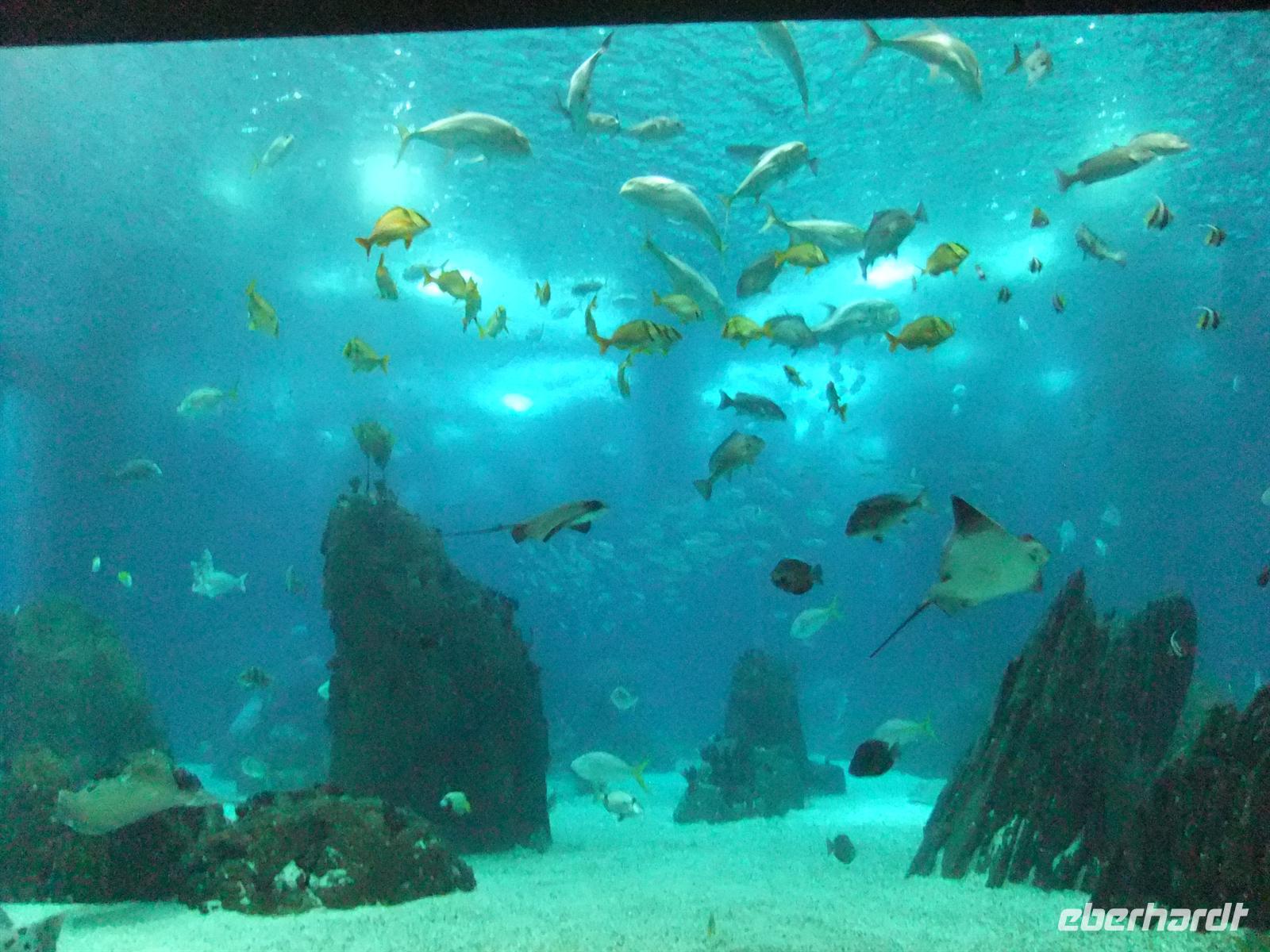 Wir erreichten schließlich die Station Martim Moniz der Electrico 28. Leider passten nicht alle Gäste in eine Bahn, sodass wir uns auf 2 aufteilten. Ich stieg mit in die erste ein, um den Gästen in der zweiten Bahn beim Ausstieg zu winken. Wir erlebten eine rasante Fahrt durch die hügelige Stadt. Manchmal waren es nur Zentimeter, die uns von der Mauer eines Hauses trennten. Trotzdem waren wir wieder froh endlich am Lago do Chiado, einem belebten Platz in der Oberstadt, aussteigen zu können. Wir warteten noch auf die restlichen Gäste in der zweiten Bahn und gemeinsam nutzen wir gleich den Metrozustieg am besagten Platz. Hier stiegen wir sodann in die Grüne Linie ein, die uns bis zur Haltestelle Alameda führte, wo wir dann in die Rote Linie wechselten. Mit dieser fuhren wir dann bis zur Haltestelle Oriente, wo das Expogelände ist. Hier gab ich den Gästen Freizeit um das Gelände auf eigene Faust zu entdecken. Ich ging mit ein paar Gästen zum Ozeanarium wo wir uns das wunderschöne Aquarium anschauten. Gäste die hier älter als 65 waren und entsprechend den Ausweis mithatten kamen hier für den halben Preis rein. Mit einem Fassungsvermögen von insgesamt 5000m³ beeindruckte uns das riesige Wasserbecken in der Mitte des Gebäudes am meisten. Dort sah man vielerlei Fische, wie zum Beispiel Haie, Thunfische, Rochen und vieles mehr. Es herrschte auf jeden Fall immer rege Bewegung in dem Becken. Aber es gab auch noch anderes zu sehen. So gab es einen Seeotter und Pinguine zu bestaunen, genauso wie Papageientaucher.