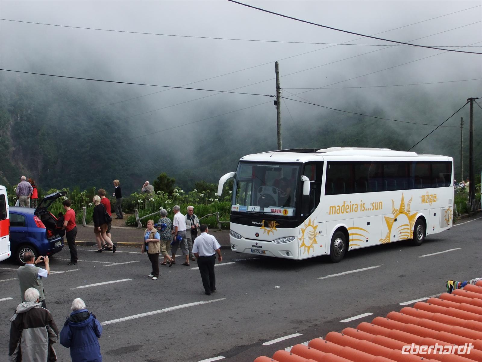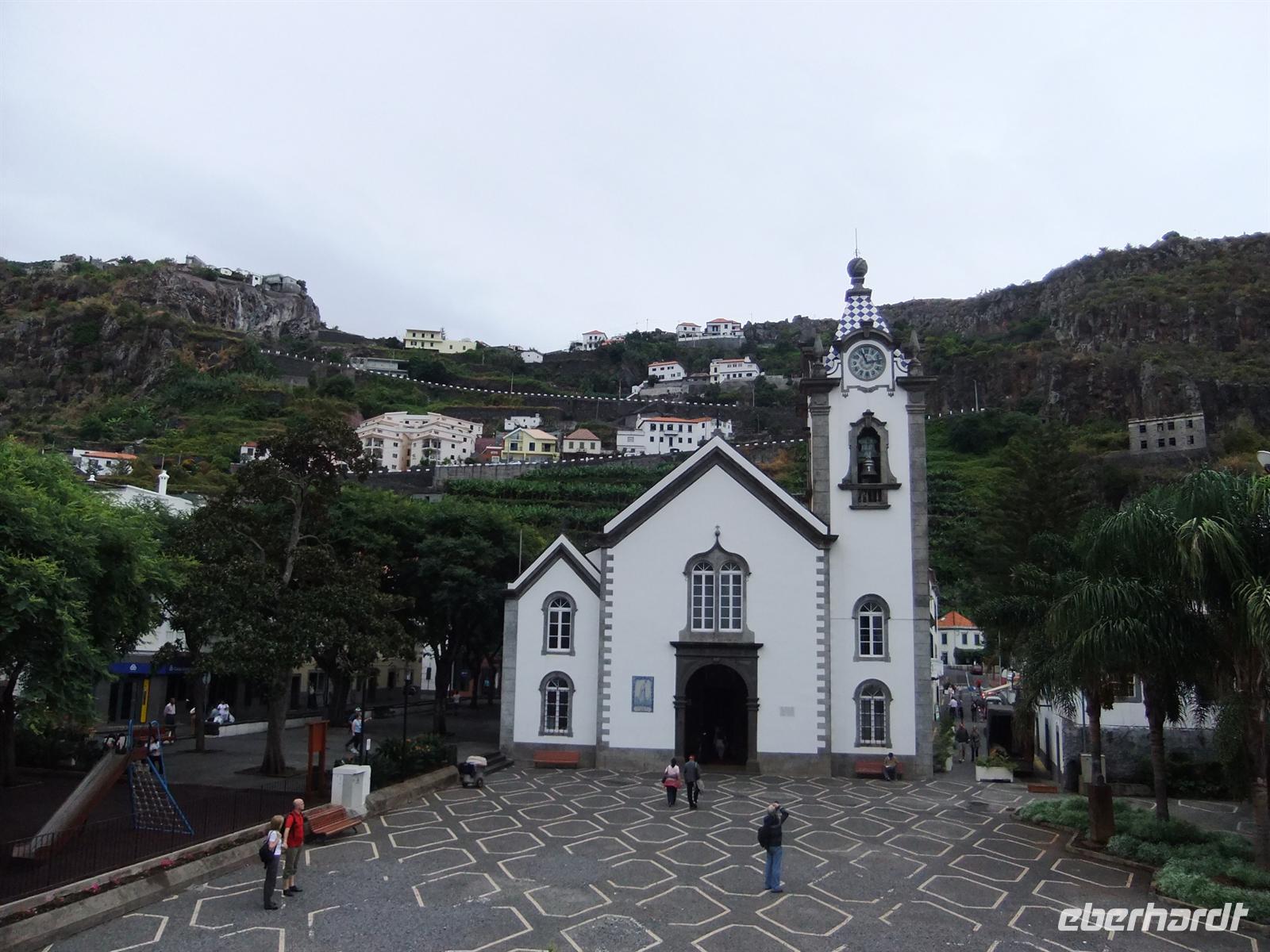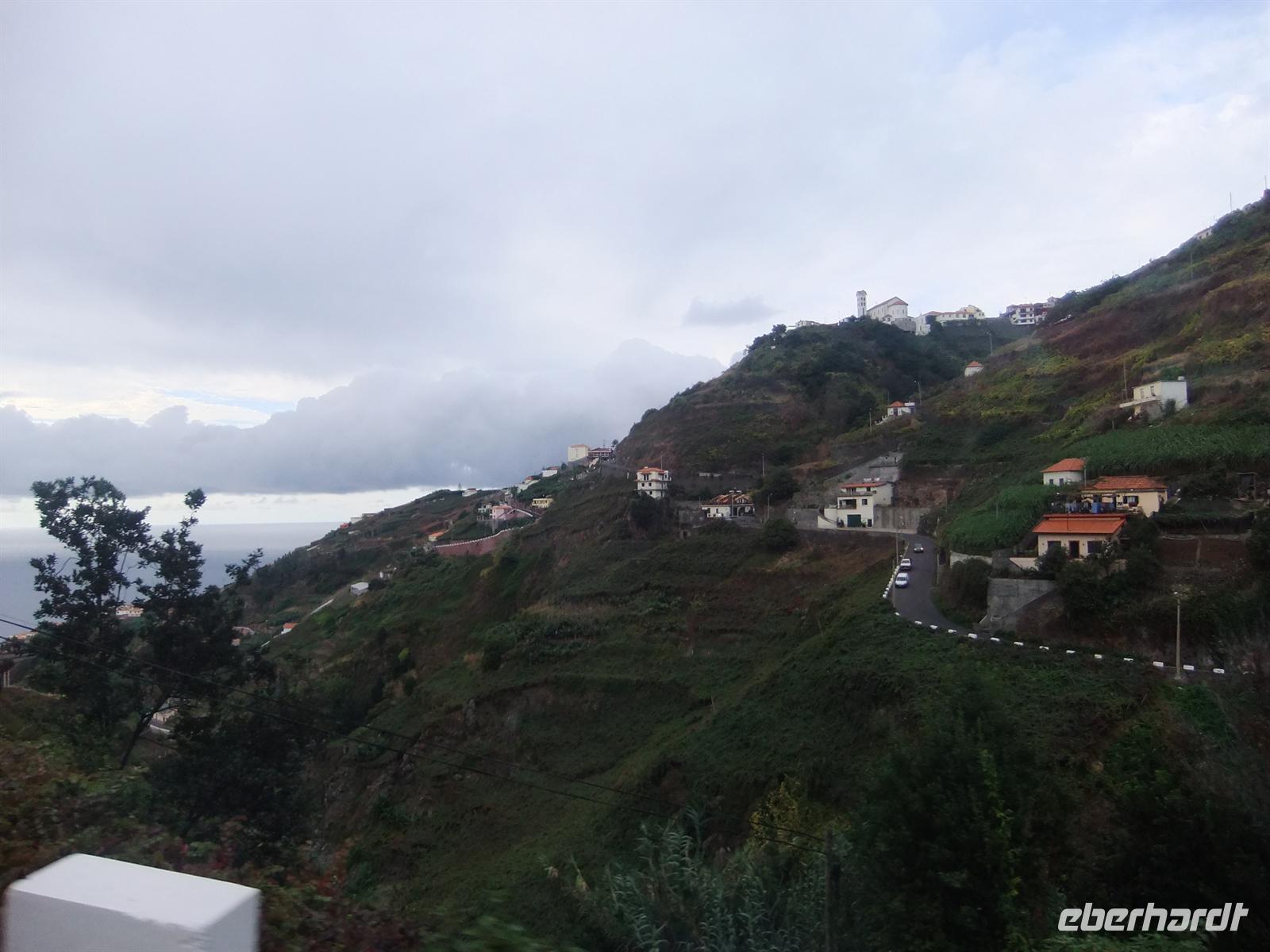 So fuhren wir nach dieser ausgedehnten Pause (1,5 h) weiter nach São Vicente, unsere letzte Station für heute. Ein kleiner Ort, noch recht ursprünglich mit einer niedlichen Kirche im Zentrum. Das Wetter spielte uns zum Abschluss des Tages noch einen kleine Streich, denn auf einmal begann es kräftig zu regnen. Die meisten Gästen schafften es noch in den Bus, andere jedoch verschanzten sich regelrecht in einem kleinen Cafe. Mit Regenschirmen unter dem Arm, begannen Steve und ich die restlichen Gäste in den trockenen Bus zu holen, doch gerade in dem Moment als alle endlich saßen, hörte es auf. Dies ist eben sehr typisch für Madeira.