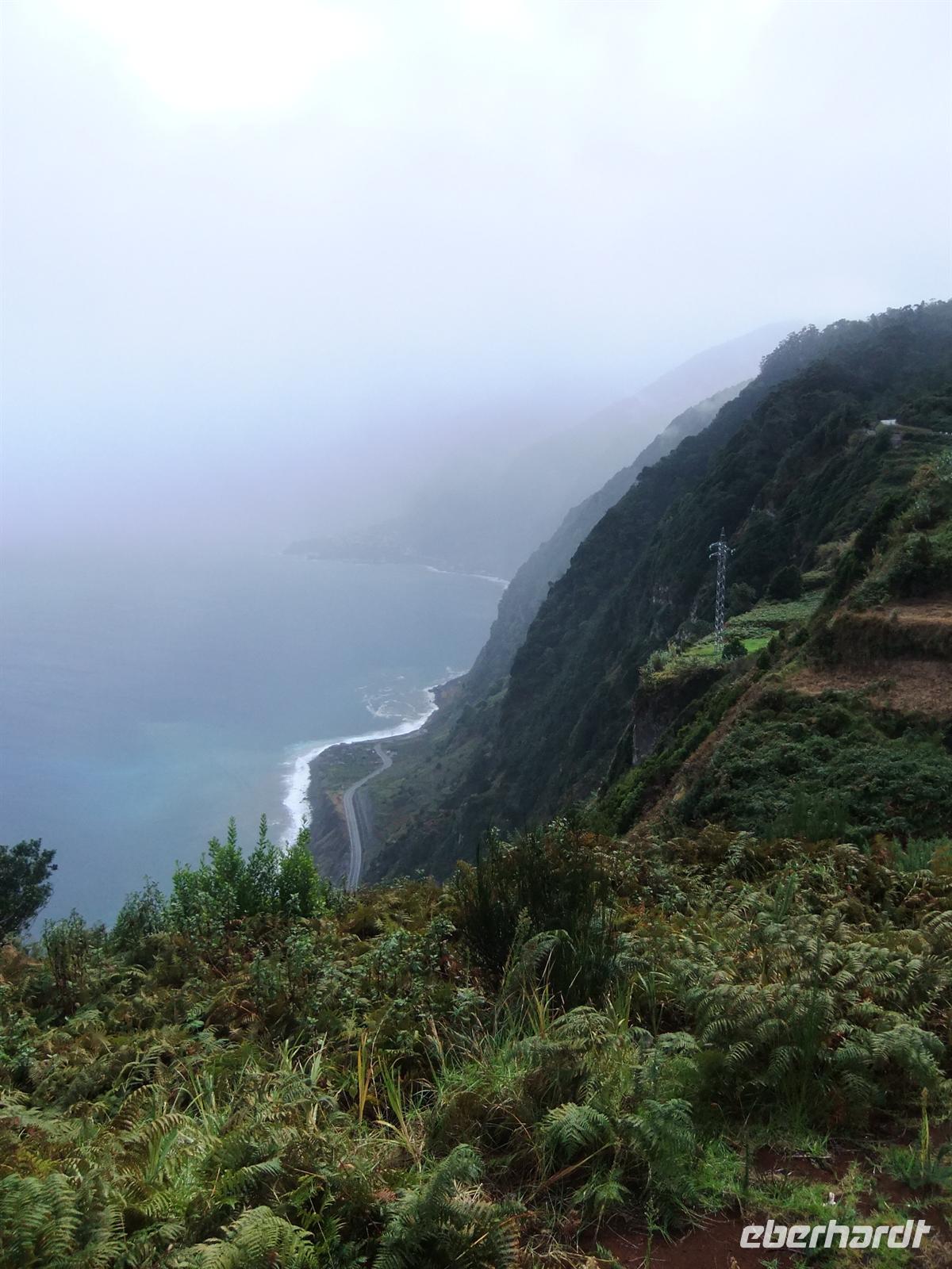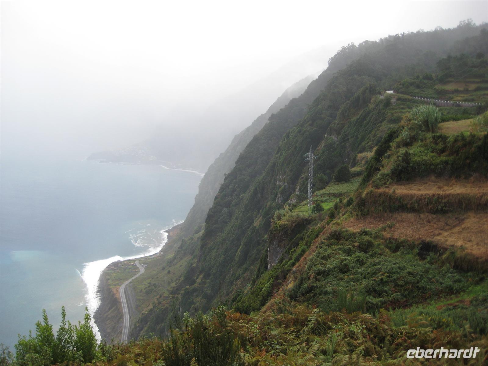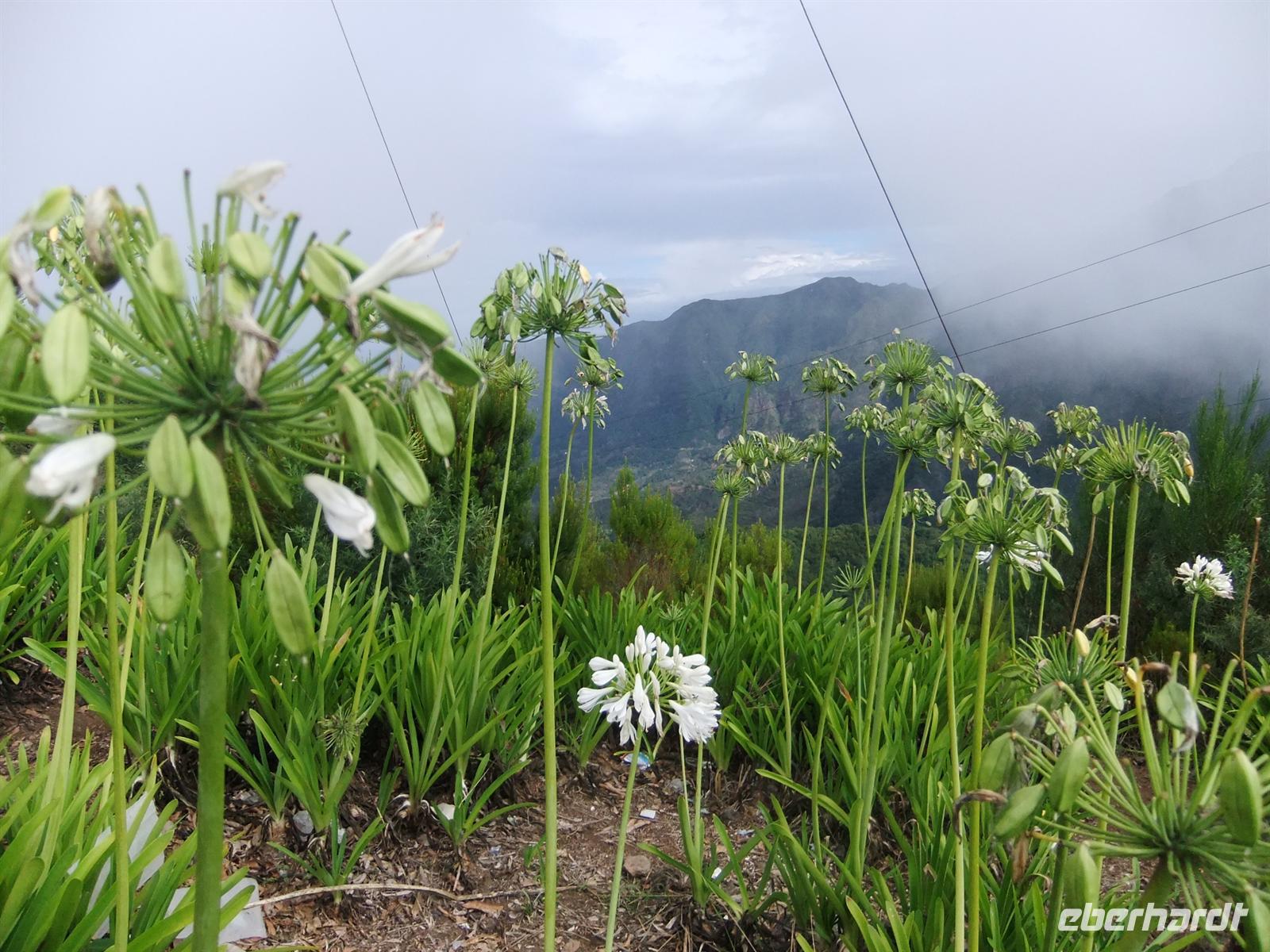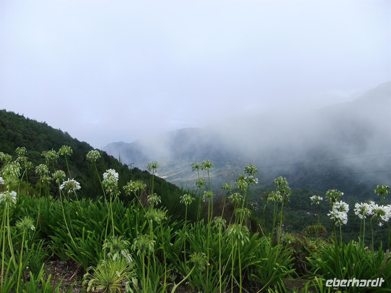 Gut gestärkt fuhren wir also weiter ins Landesinnere. Wir durchquerten die Serra de Aqua - ein Tal, welches vom Unwetter im Februar stark betroffen war und auch noch ist. Man kann noch heute an einigen Stellen sehen, wie der Schlamm von den Hängen rutschte und Häuser mit sich riss. Am Ende der Serra de Aqua erwartete und der Encumeada Pass auf 1007 Metern Höhe. Bei schönem Wetter und keinem Nebel, hätten wir hier vermutlich eine wunderbare Aussicht gehabt, aber leider war dem nicht so. Zumindest konnten wir aber die ersten Agapanthus, die afrikanischen Liebesblumen, bewundern. Unser nächstes Ziel sollte Ribiera da Janela sein. Auf dem Weg dahin durchfuhren wir die Hochebene von Paul da Serra. Aber leider war auch hier starker Nebel, sodass uns keine schöne Sicht gegönnt war. In Ribiera da Janela gibt es nicht viel, sondern lediglich der Fels im Meer mit einem Fenster (=Janela), sodass wir unserer Mittagspause entgegen strebten. Teresa organisierte ein Restaurant, wo man super Degenfisch essen konnte. Uns schien es eher eine Massenabfertigung zu sein, aber geschmeckt hatte es trotzdem und für 12,- €, inklusive Getränke und Dessert, ein unschlagbarer Preis.Dieses Restaurant befand sich in Porto Moniz, welches durch das schöne Meeresschwimmbecken bekannt ist. Leider war das Meer so stürmisch, dass die rote Flagge wehte und man somit nicht baden gehen konnte.
