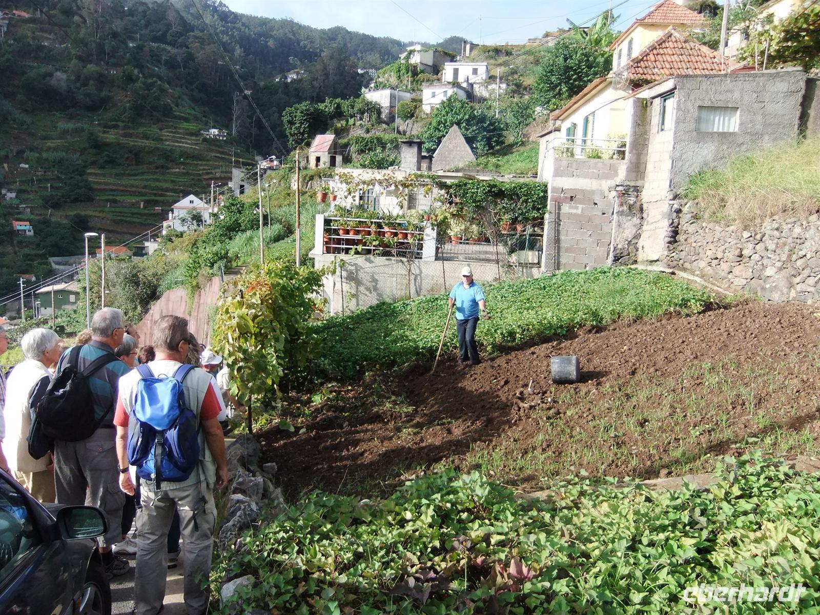 Teresa erzählte natürlich wieder sehr viel über die Flora. So brachte sie uns das Leben eines Bananenbaums näher und ließ uns auch leckere, uns unbekannte, Früchte kosten. Unterwegs trafen wir auch auf einen Bauern, der gerade Batatas, Süßkartoffeln, erntete sowie auf den Herrn José Rodriguez. Dieser Herr war einer der Ersten der die Levadas erbaute und somit schon über 90 Jahre alt. Er trug die typische madeirensische Wollmütze, über die einige Geschichten bestehen. Eine der Geschichten lautet so: Wenn die Ohrenklappen nach oben gestülpt sind hat der Mann von seiner Frau nichts zu befürchten. Sollten jedoch die Ohrenklappen nach untern gestülpt sein, so hatte der Mann zu viel getrunken und erwartete viel Mecker von seiner Frau, welche er durch die Ohrenklappen einfach überhören wollte. Nach mehr als 4 Stunden erreichten wir das Ziel. Manche gönnten sich am nahegelegenen Café ein Eis bevor es wieder zurück zum Hotel ging.