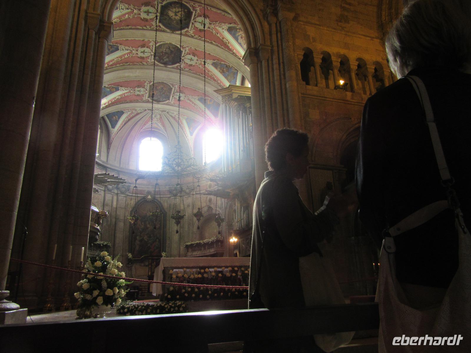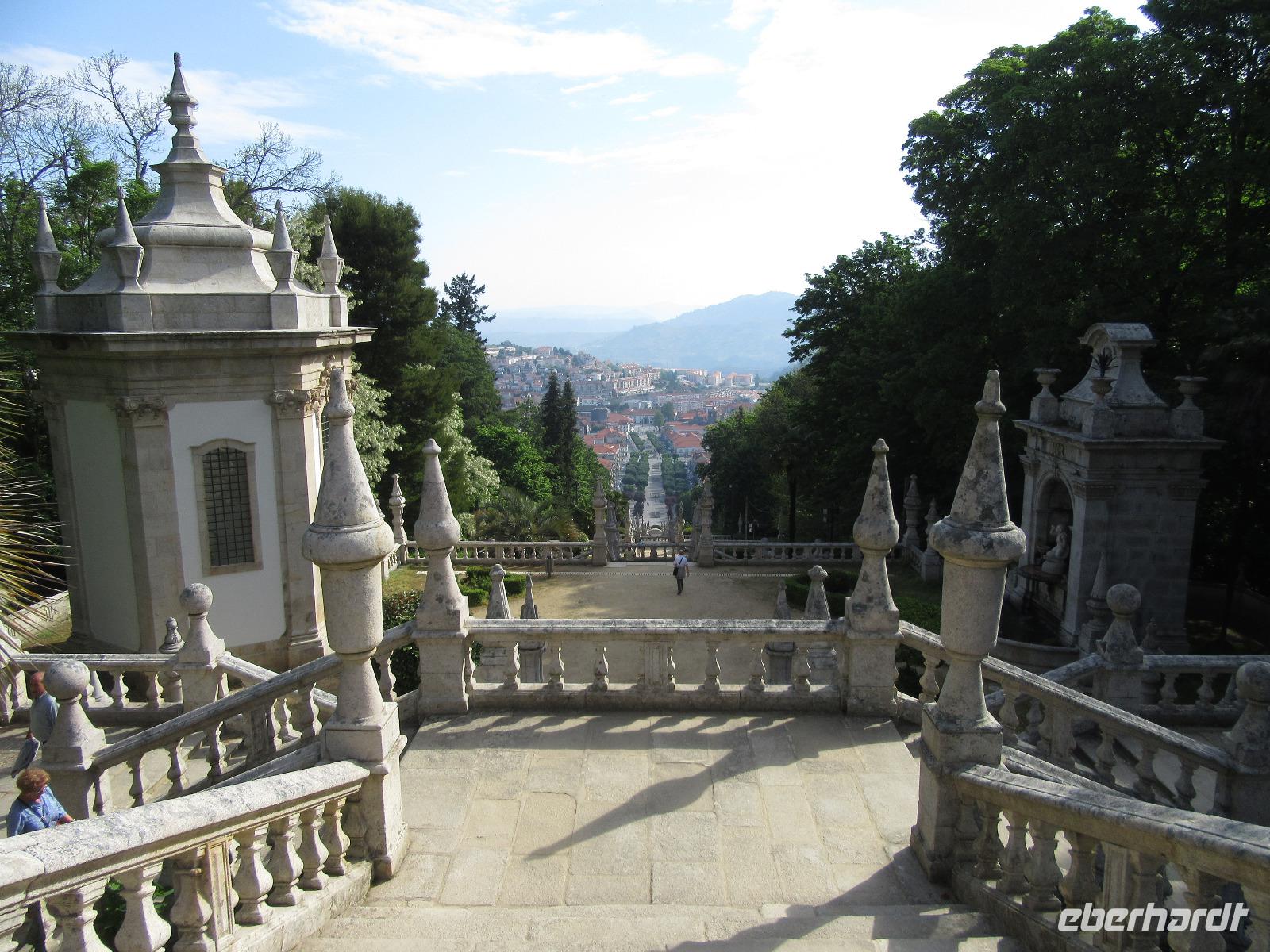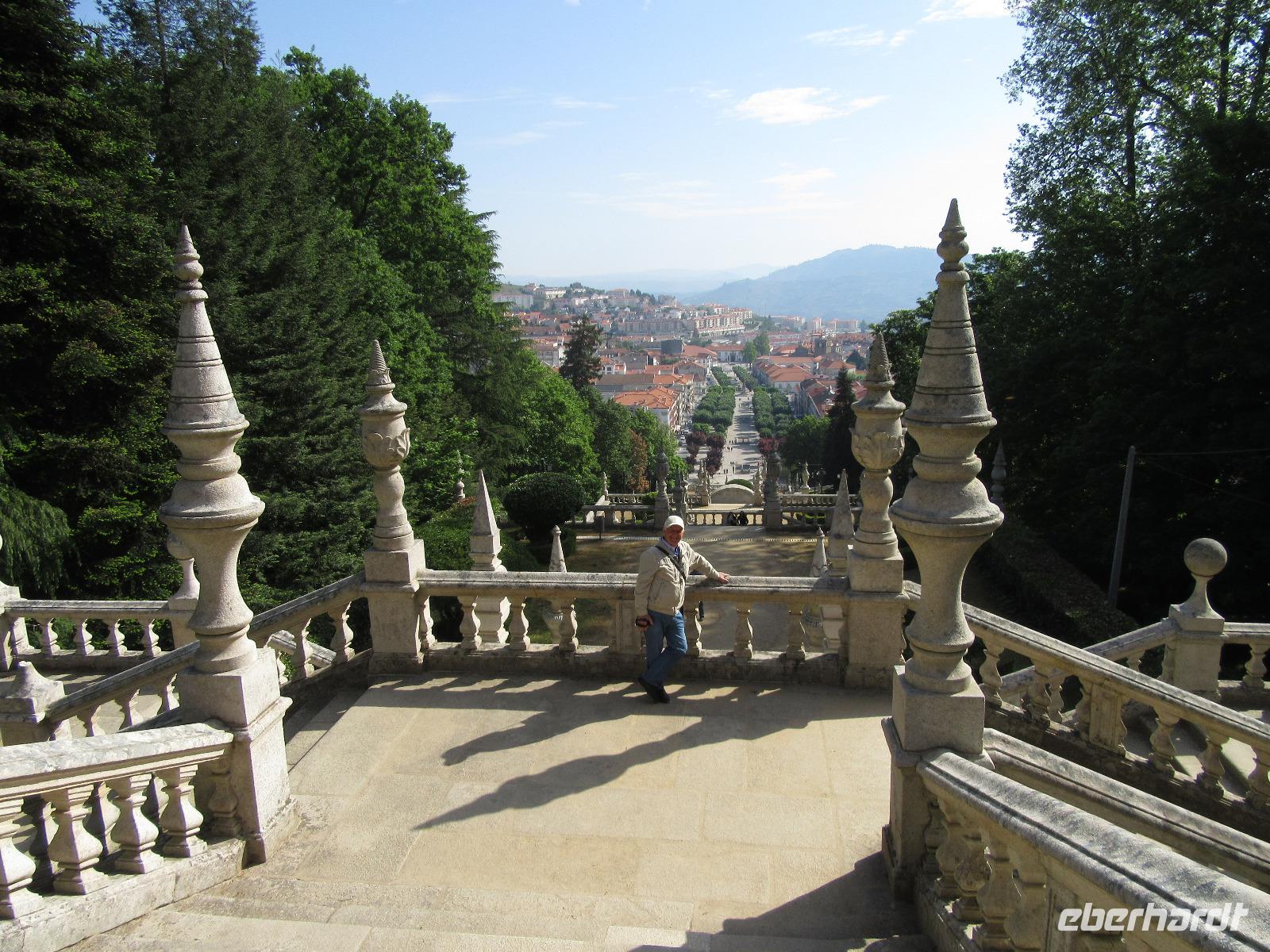 Zu unserem letzten Ausflug fuhren wir wieder mit unserem deutsch-englischen Bus und Paolo in den Ort Lamego. Unser erster Halt war an der Wallfahrtskirche, die Nossa Senhora dos Remedios gewidmet wurde und von der man einen guten Blick über die Stadt erhalten konnte. Noch imposanter aber war die barocke Treppenanlage, die hinab in die Stadt führte. Über 680 Stufen mit schön verziert mit Statuen und Brunnenmusste man hinab steigen, um zum zentralen Platz Lamegos zu kommen. Wir stiegen ungefähr drei/viertel der Stufen hinab zum Bus. Im Stadtzentrum angekommen, erzählte Paolo über die Enstehung und die zahlreichen Kirchen. In der Kathedrale Sé lief bereits der singende Gottesdienst, daher besichtigten wir sie von ausßen. Paolo gab uns genügend Zeit, den Ort auf eigene Faust zu erkunden, einen kleinen Kaffee zu trinken oder den für die Gegend typischen Schinken zu probieren. Anschließend versuchten wir ein zweites Mal in das Innere der Kathedrale zu gelangen, leider war der singende Gottesdienst noch nicht beendet. So erkundeten wir den anschließenden Kreuzgang und hingen zum Bus zurück. In Regua angekommen, verabschiedeten wir uns von Paolo und unser letzter Teil der Flusskreuzafhrt auf dem Douro konnte fortgesetzt werden.