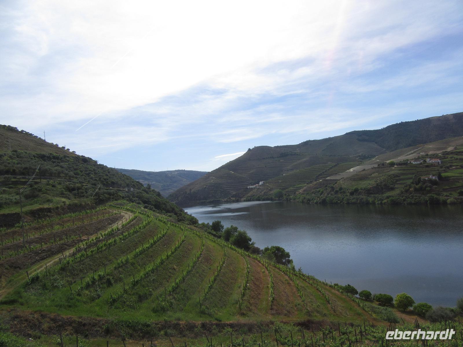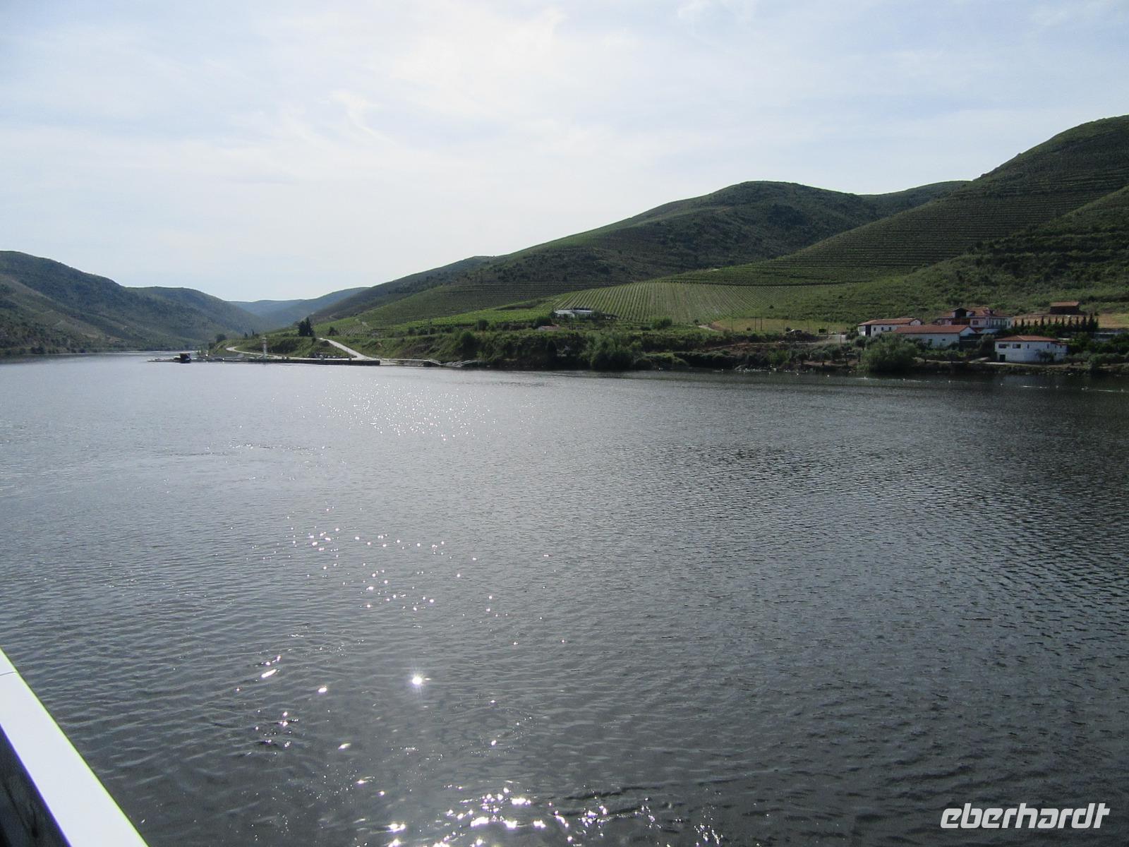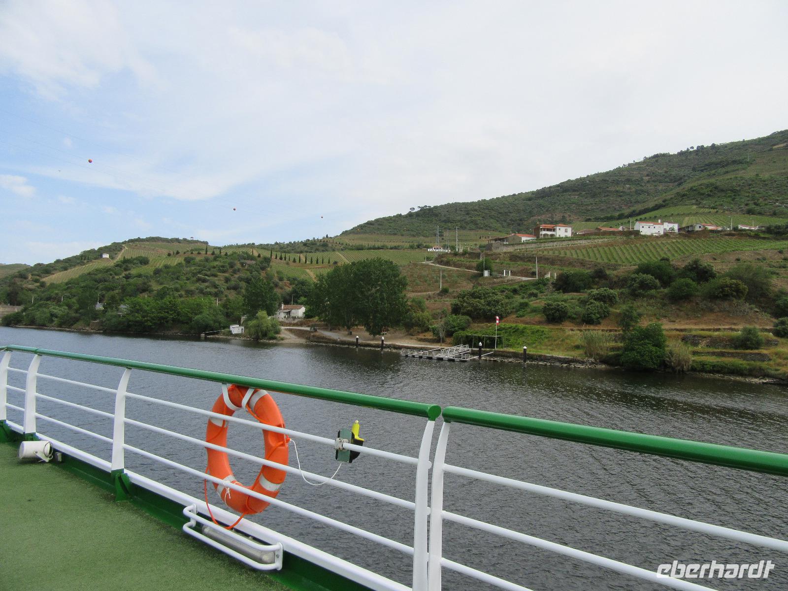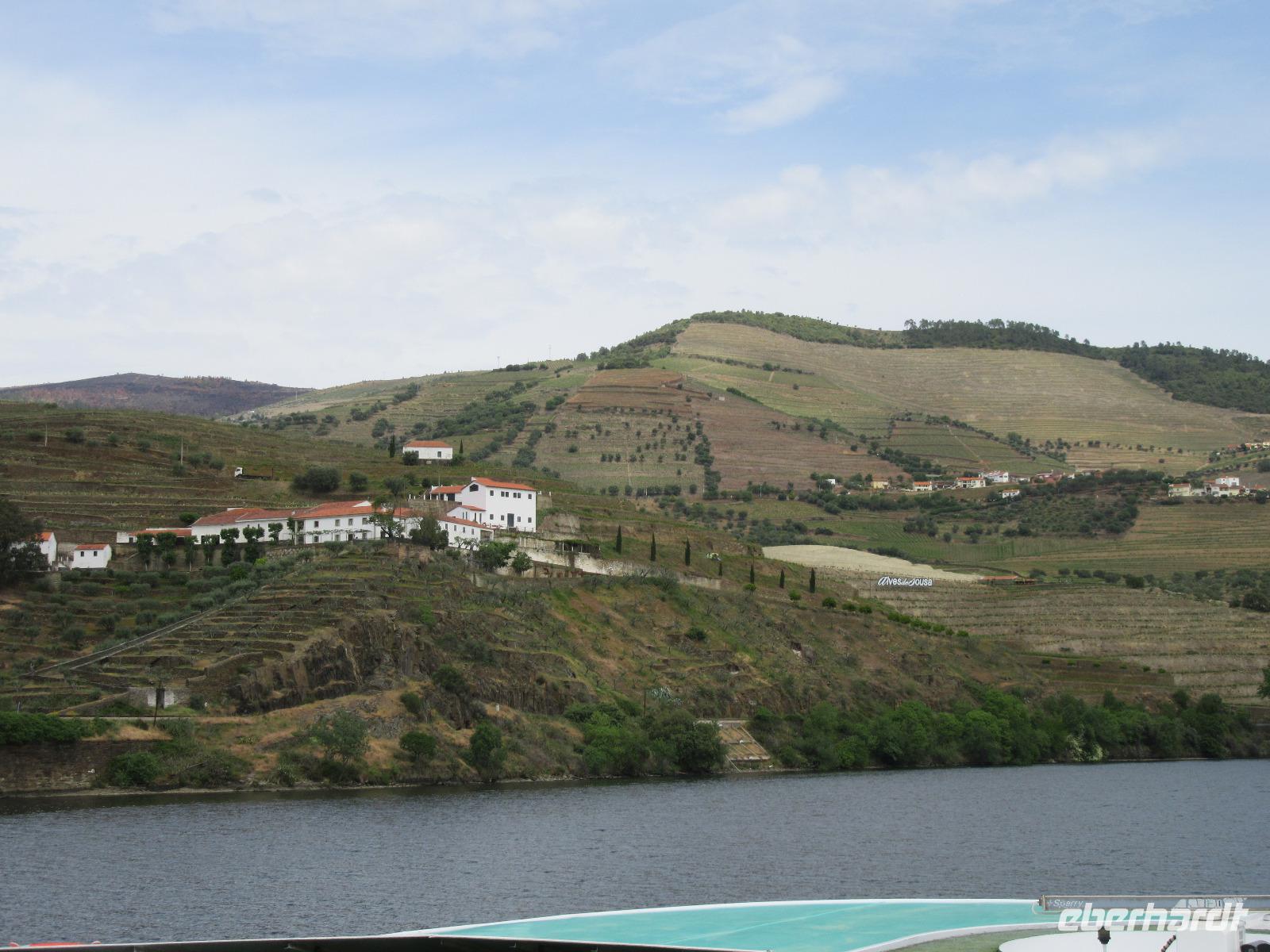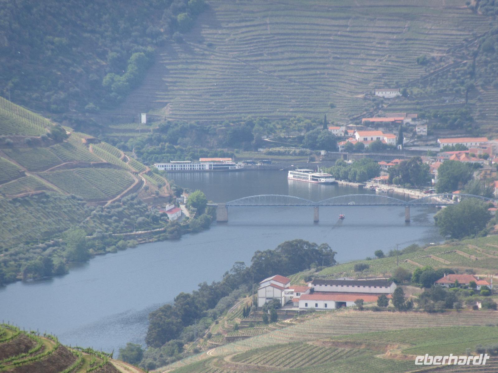 Noch während des Frühstücks legte unser Schiff ab und fuhr den morgendlich ruhenden Douro flussabwärts Richtung Ferradosa. Wir trafen uns zum Frühsport auf dem Sonnendeck und genossen anschließend bei doch recht windigem Wetter die vorbeiziehenden terrassenförmig angelegten Weinhänge. Nach dem Mittagsmenü wurden wir von Paolo abgeholt, der unser Guide für die nächsten zwei Tage sein sollte und wir fuhren durch das Weinanbaugebiet Alto Douro, der seit 1756 ersten herkunftsgeschützten Weinbauregion der Welt. Bei einem ersten Halt bei den zehn kleinen Wallfahrtskapellen von Sao Salvador do Mundo konnten wir in der ferne das Schiff und den Staudamm erkennen, außerdem einen grandiosen Panoramablick über die Region Cachao da Valeira. Weiter ging die Fahrt entlang kurvenreicher Serpentinenstraßen nach Sao Joao da Pesqueira. Bei sonnigem Wetter bummelten wir zum Ortszentrum und begutachteten die Kirche Igreja da Misericordia, die wie so viele andere Kirchen mit den blauen Kacheln (Azulejos) verkleidet war. Bei der anschließenden Freizeit erkundeten wir die kleinen engen Gassen, unter anderem die Travessa dos Gatos - die Katzenstraße. Die Häuser waren mit Schieferplatten verkleidet, was ihnen einen urigen Charme verlieh. Im Anschluss ging unsere Busfahrt weiter durch das fantastische Weinanbaugebiet des Douros. Bei einem weiteren Fotostopp konnten wir die wunderschöne Landschaft mit den wellenförmigen Terrassen der Weinhänge ausgiebig bewundern. Auch unser Kreuzfahrtschiff ganz in der Ferne konnten wir im Hafen von Pinhao erkennen. Da sollten wir also noch hinfahren. Vorher jedoch hielten wir in der Quinta do Tedo, einer Portweinkellerei die sich im Naturschutzgebiet zwischen den Flüssen Douro und Tedo befand. Nach einer ausgiebigen Führung erhielten wir die dort hergestellten Spezialitäten zum Kosten. Zurück an Bord in Pinhao machten wir uns für den Gala-Abend fein und genossen den Abend in geselliger Runde, fantastischem Mehr-Gang-Menü, schickem Zwirn und natürlich Portwein :-