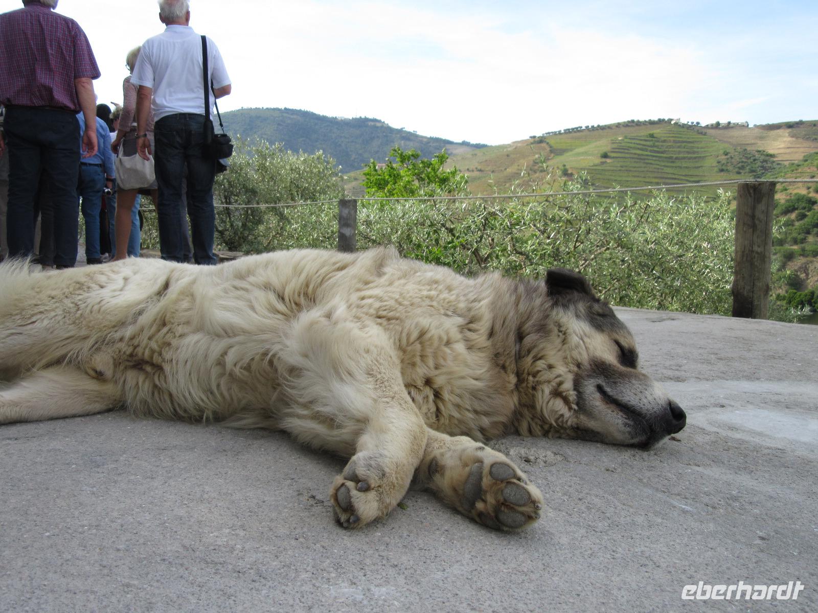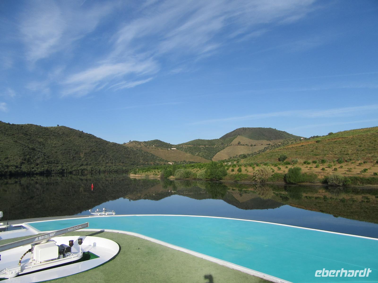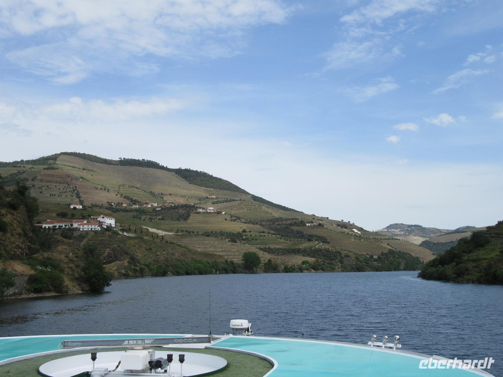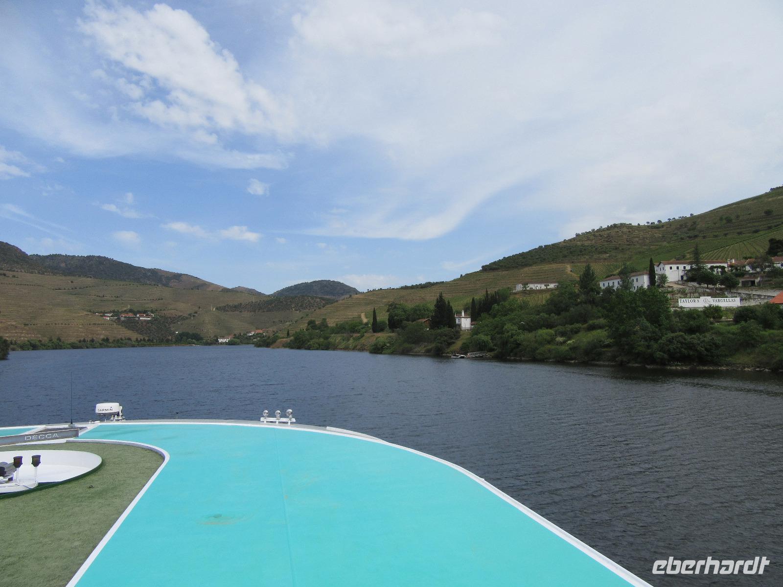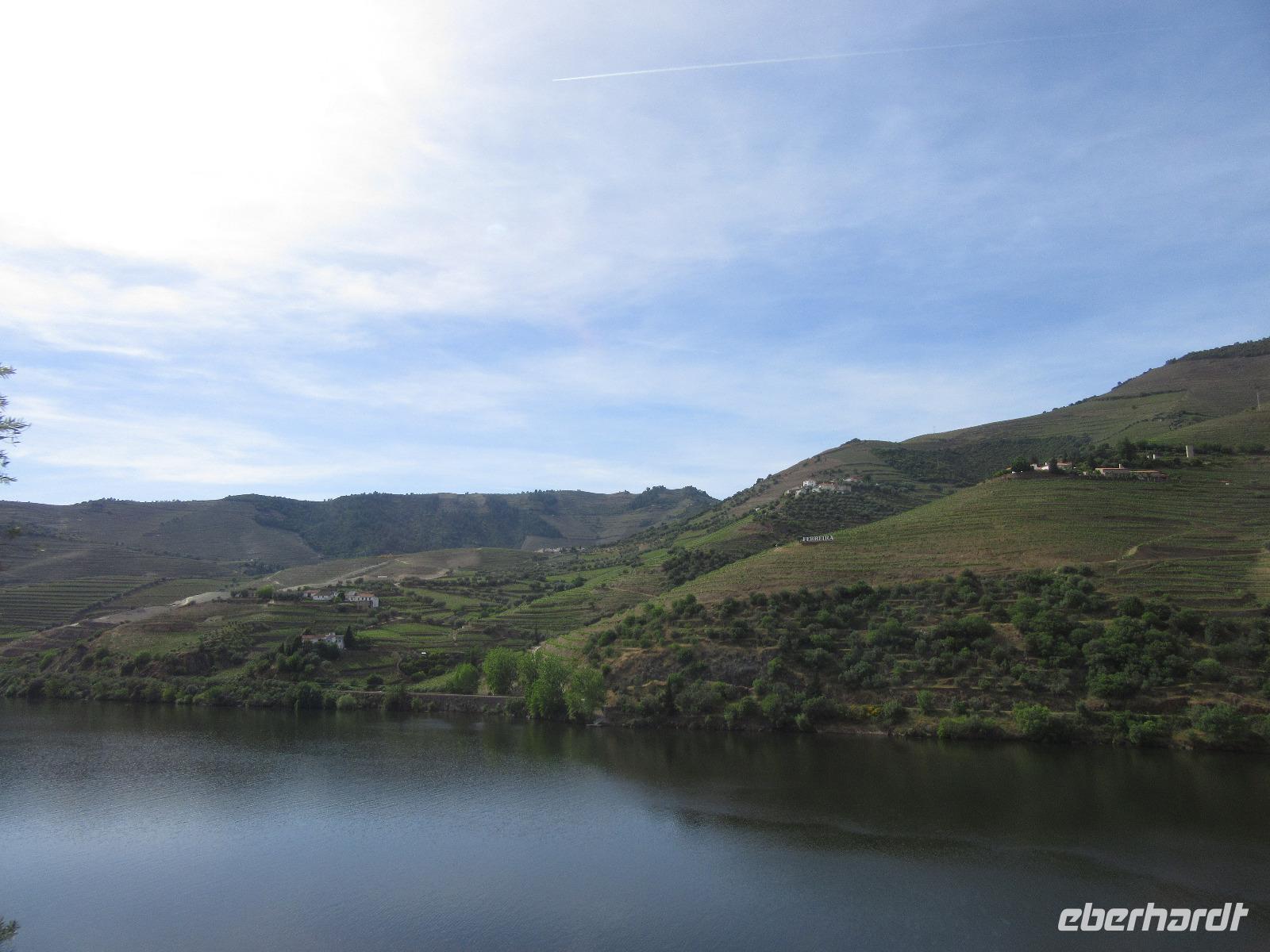 Noch während des Frühstücks legte unser Schiff ab und fuhr den morgendlich ruhenden Douro flussabwärts Richtung Ferradosa. Wir trafen uns zum Frühsport auf dem Sonnendeck und genossen anschließend bei doch recht windigem Wetter die vorbeiziehenden terrassenförmig angelegten Weinhänge. Nach dem Mittagsmenü wurden wir von Paolo abgeholt, der unser Guide für die nächsten zwei Tage sein sollte und wir fuhren durch das Weinanbaugebiet Alto Douro, der seit 1756 ersten herkunftsgeschützten Weinbauregion der Welt. Bei einem ersten Halt bei den zehn kleinen Wallfahrtskapellen von Sao Salvador do Mundo konnten wir in der ferne das Schiff und den Staudamm erkennen, außerdem einen grandiosen Panoramablick über die Region Cachao da Valeira. Weiter ging die Fahrt entlang kurvenreicher Serpentinenstraßen nach Sao Joao da Pesqueira. Bei sonnigem Wetter bummelten wir zum Ortszentrum und begutachteten die Kirche Igreja da Misericordia, die wie so viele andere Kirchen mit den blauen Kacheln (Azulejos) verkleidet war. Bei der anschließenden Freizeit erkundeten wir die kleinen engen Gassen, unter anderem die Travessa dos Gatos - die Katzenstraße. Die Häuser waren mit Schieferplatten verkleidet, was ihnen einen urigen Charme verlieh. Im Anschluss ging unsere Busfahrt weiter durch das fantastische Weinanbaugebiet des Douros. Bei einem weiteren Fotostopp konnten wir die wunderschöne Landschaft mit den wellenförmigen Terrassen der Weinhänge ausgiebig bewundern. Auch unser Kreuzfahrtschiff ganz in der Ferne konnten wir im Hafen von Pinhao erkennen. Da sollten wir also noch hinfahren. Vorher jedoch hielten wir in der Quinta do Tedo, einer Portweinkellerei die sich im Naturschutzgebiet zwischen den Flüssen Douro und Tedo befand. Nach einer ausgiebigen Führung erhielten wir die dort hergestellten Spezialitäten zum Kosten. Zurück an Bord in Pinhao machten wir uns für den Gala-Abend fein und genossen den Abend in geselliger Runde, fantastischem Mehr-Gang-Menü, schickem Zwirn und natürlich Portwein :-