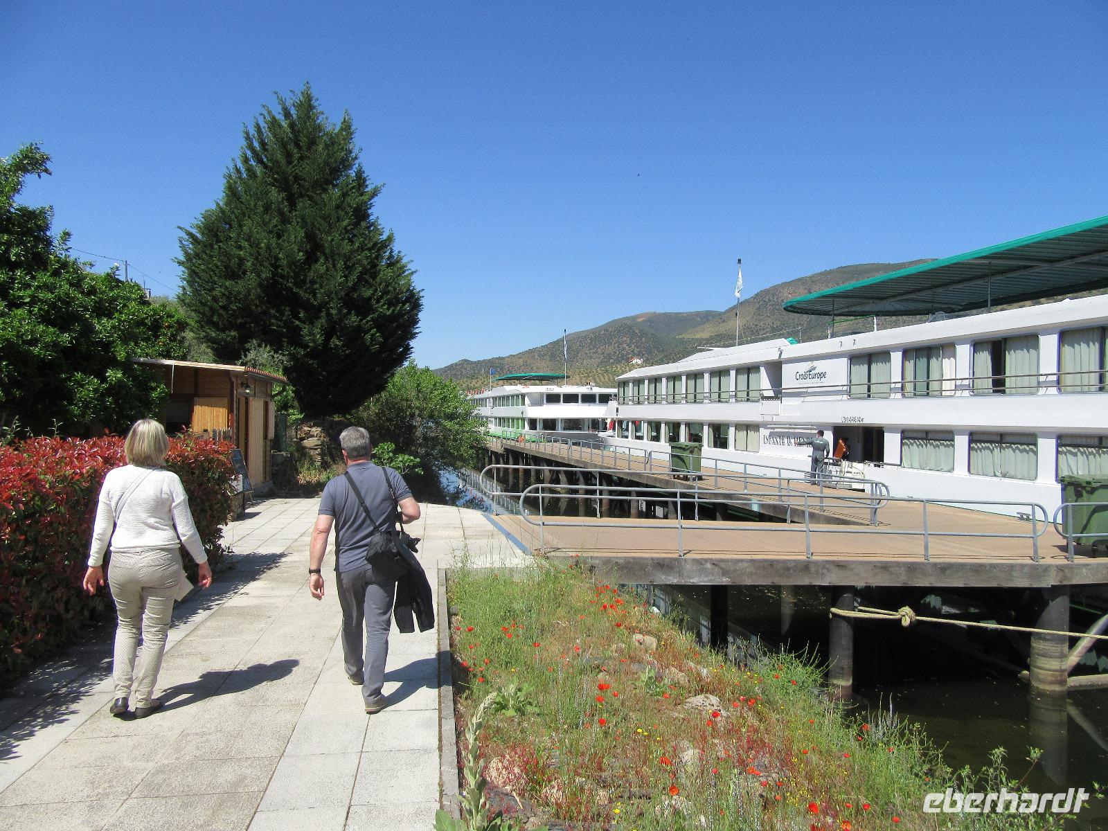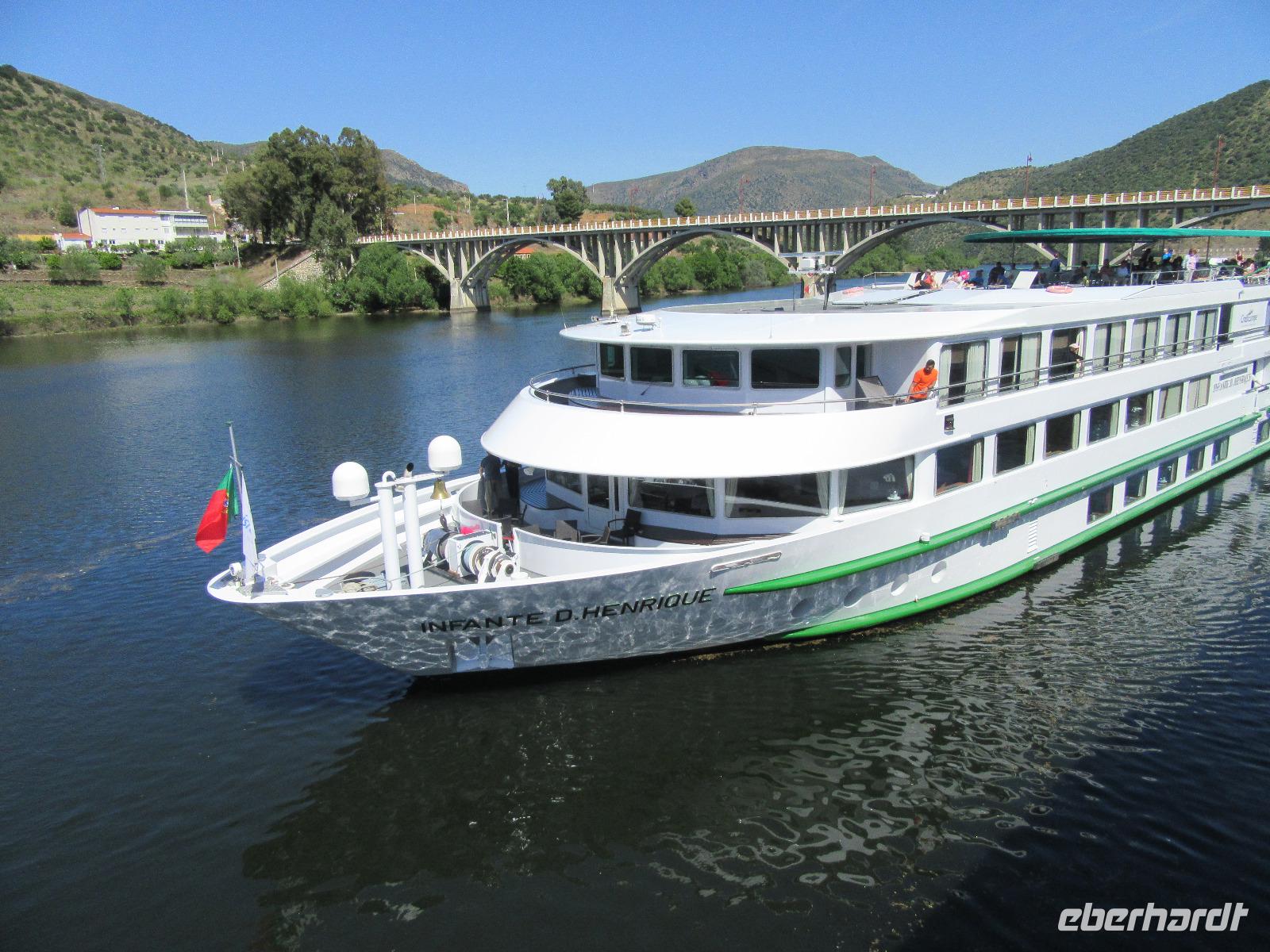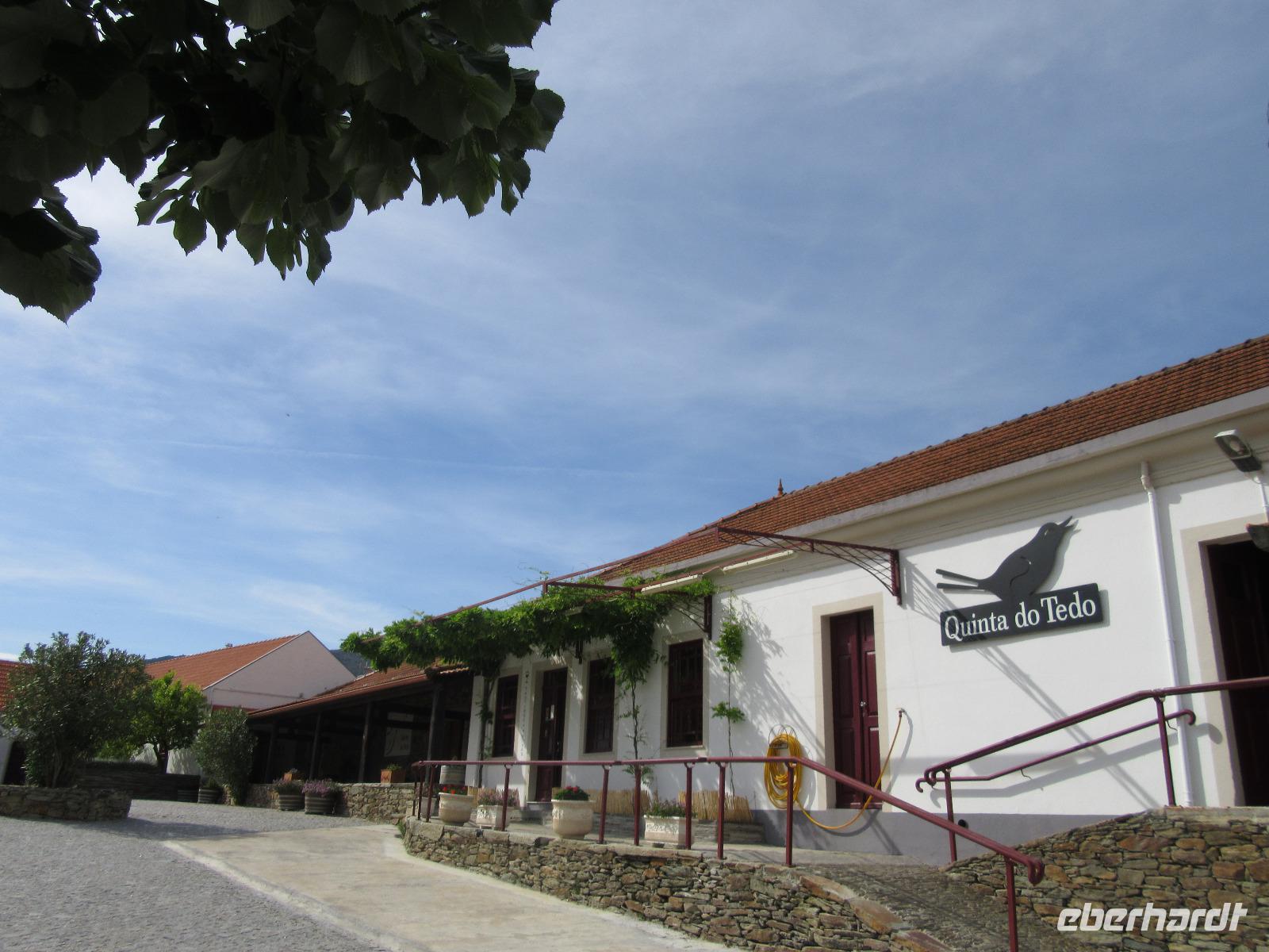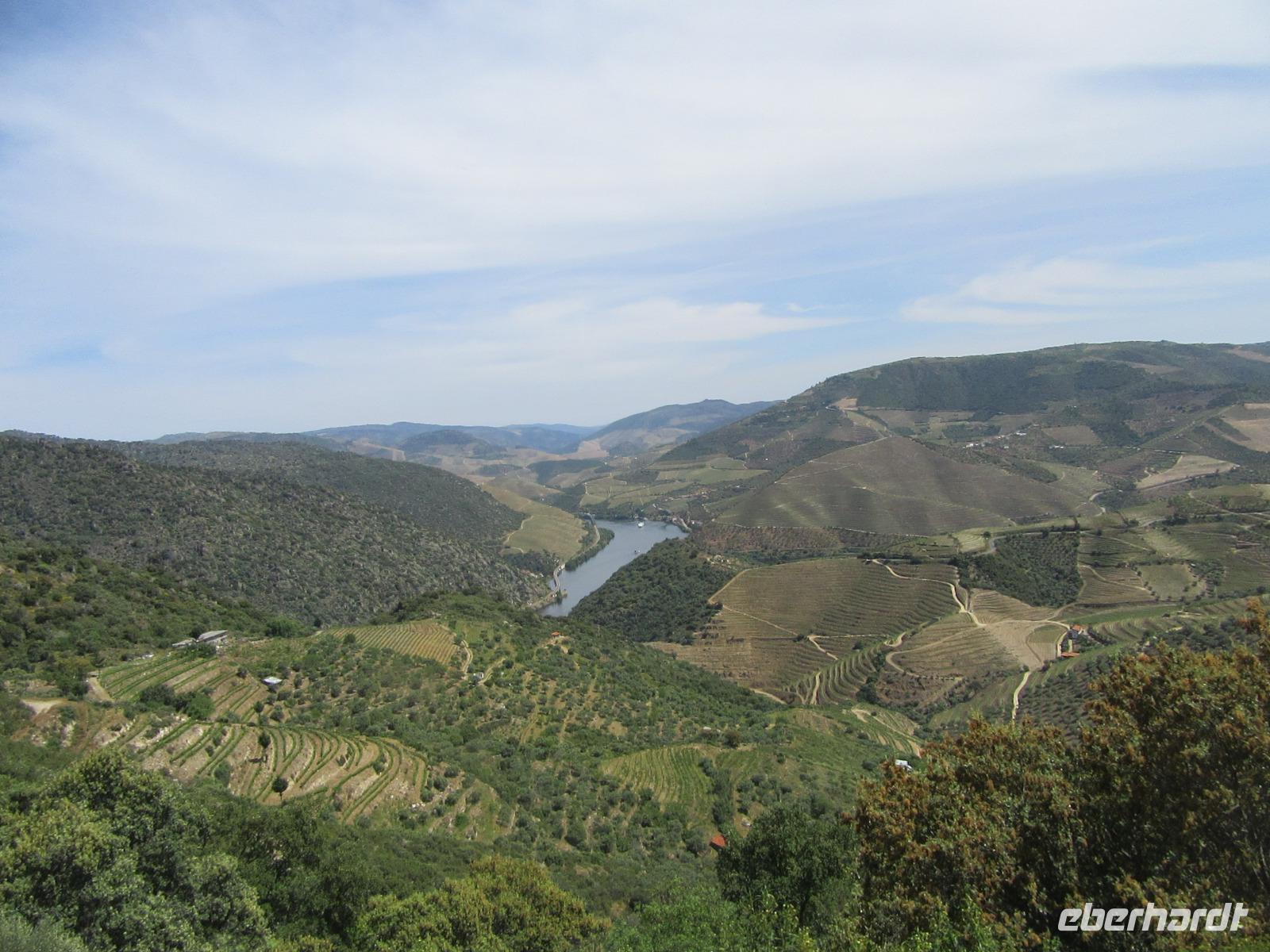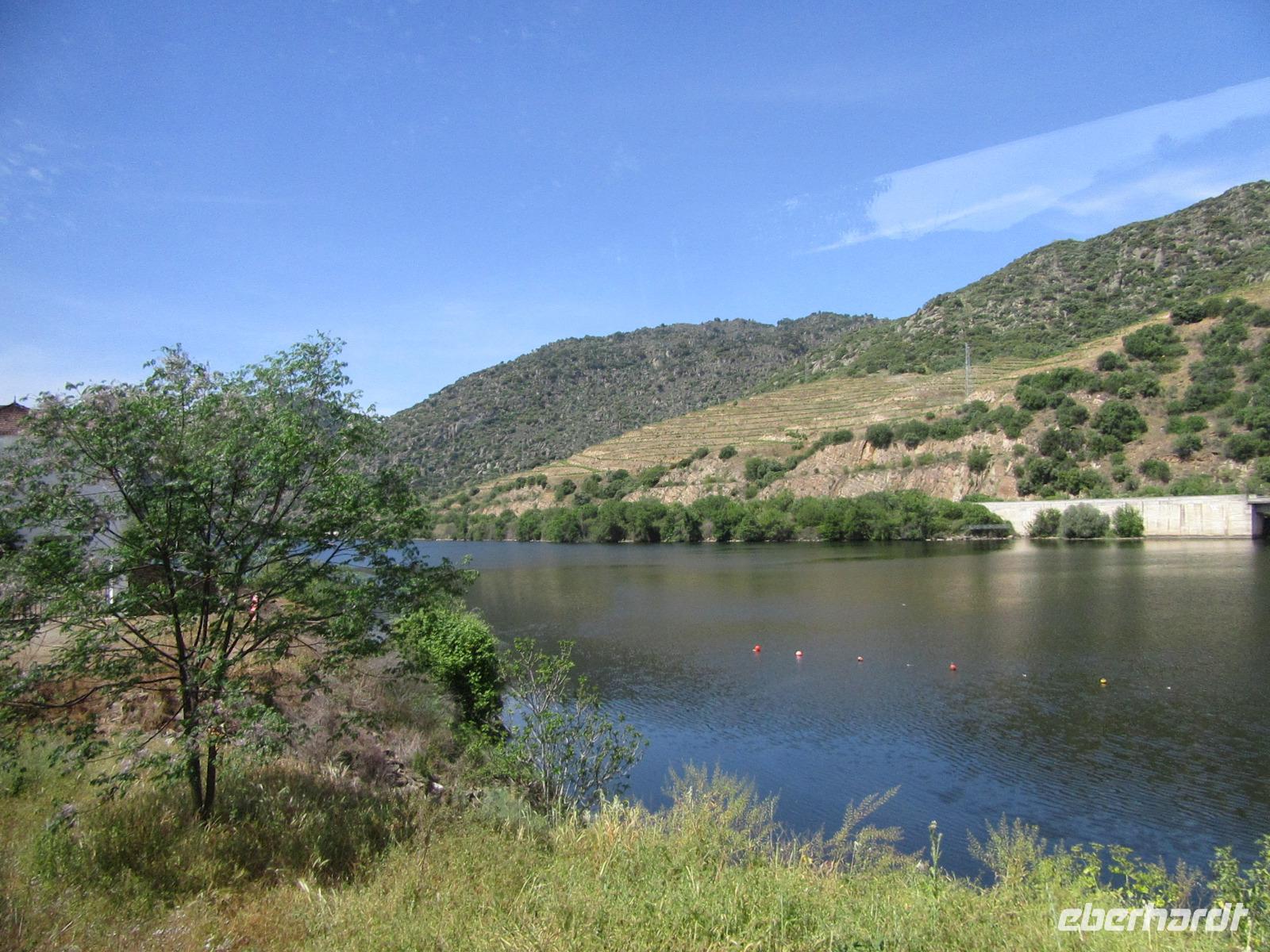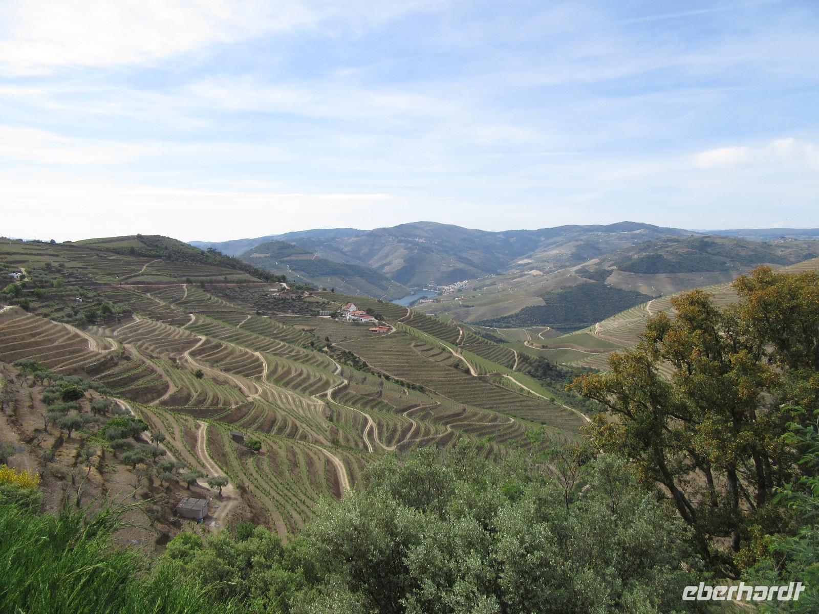 Noch während des Frühstücks legte unser Schiff ab und fuhr den morgendlich ruhenden Douro flussabwärts Richtung Ferradosa. Wir trafen uns zum Frühsport auf dem Sonnendeck und genossen anschließend bei doch recht windigem Wetter die vorbeiziehenden terrassenförmig angelegten Weinhänge. Nach dem Mittagsmenü wurden wir von Paolo abgeholt, der unser Guide für die nächsten zwei Tage sein sollte und wir fuhren durch das Weinanbaugebiet Alto Douro, der seit 1756 ersten herkunftsgeschützten Weinbauregion der Welt. Bei einem ersten Halt bei den zehn kleinen Wallfahrtskapellen von Sao Salvador do Mundo konnten wir in der ferne das Schiff und den Staudamm erkennen, außerdem einen grandiosen Panoramablick über die Region Cachao da Valeira. Weiter ging die Fahrt entlang kurvenreicher Serpentinenstraßen nach Sao Joao da Pesqueira. Bei sonnigem Wetter bummelten wir zum Ortszentrum und begutachteten die Kirche Igreja da Misericordia, die wie so viele andere Kirchen mit den blauen Kacheln (Azulejos) verkleidet war. Bei der anschließenden Freizeit erkundeten wir die kleinen engen Gassen, unter anderem die Travessa dos Gatos - die Katzenstraße. Die Häuser waren mit Schieferplatten verkleidet, was ihnen einen urigen Charme verlieh. Im Anschluss ging unsere Busfahrt weiter durch das fantastische Weinanbaugebiet des Douros. Bei einem weiteren Fotostopp konnten wir die wunderschöne Landschaft mit den wellenförmigen Terrassen der Weinhänge ausgiebig bewundern. Auch unser Kreuzfahrtschiff ganz in der Ferne konnten wir im Hafen von Pinhao erkennen. Da sollten wir also noch hinfahren. Vorher jedoch hielten wir in der Quinta do Tedo, einer Portweinkellerei die sich im Naturschutzgebiet zwischen den Flüssen Douro und Tedo befand. Nach einer ausgiebigen Führung erhielten wir die dort hergestellten Spezialitäten zum Kosten. Zurück an Bord in Pinhao machten wir uns für den Gala-Abend fein und genossen den Abend in geselliger Runde, fantastischem Mehr-Gang-Menü, schickem Zwirn und natürlich Portwein :-