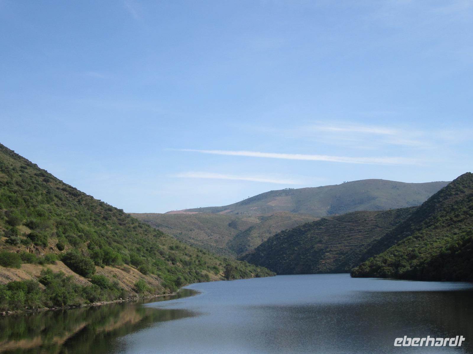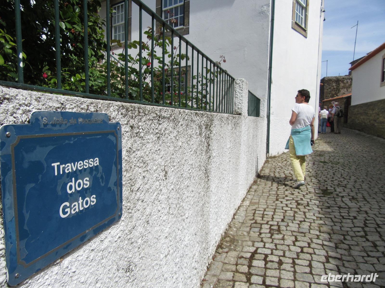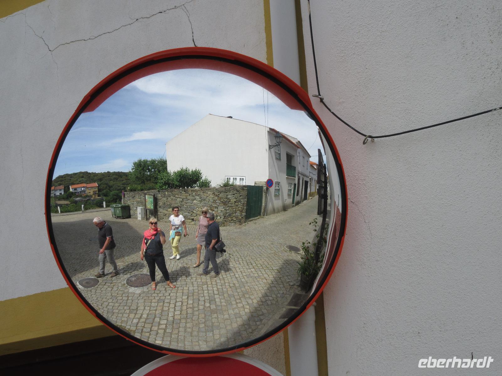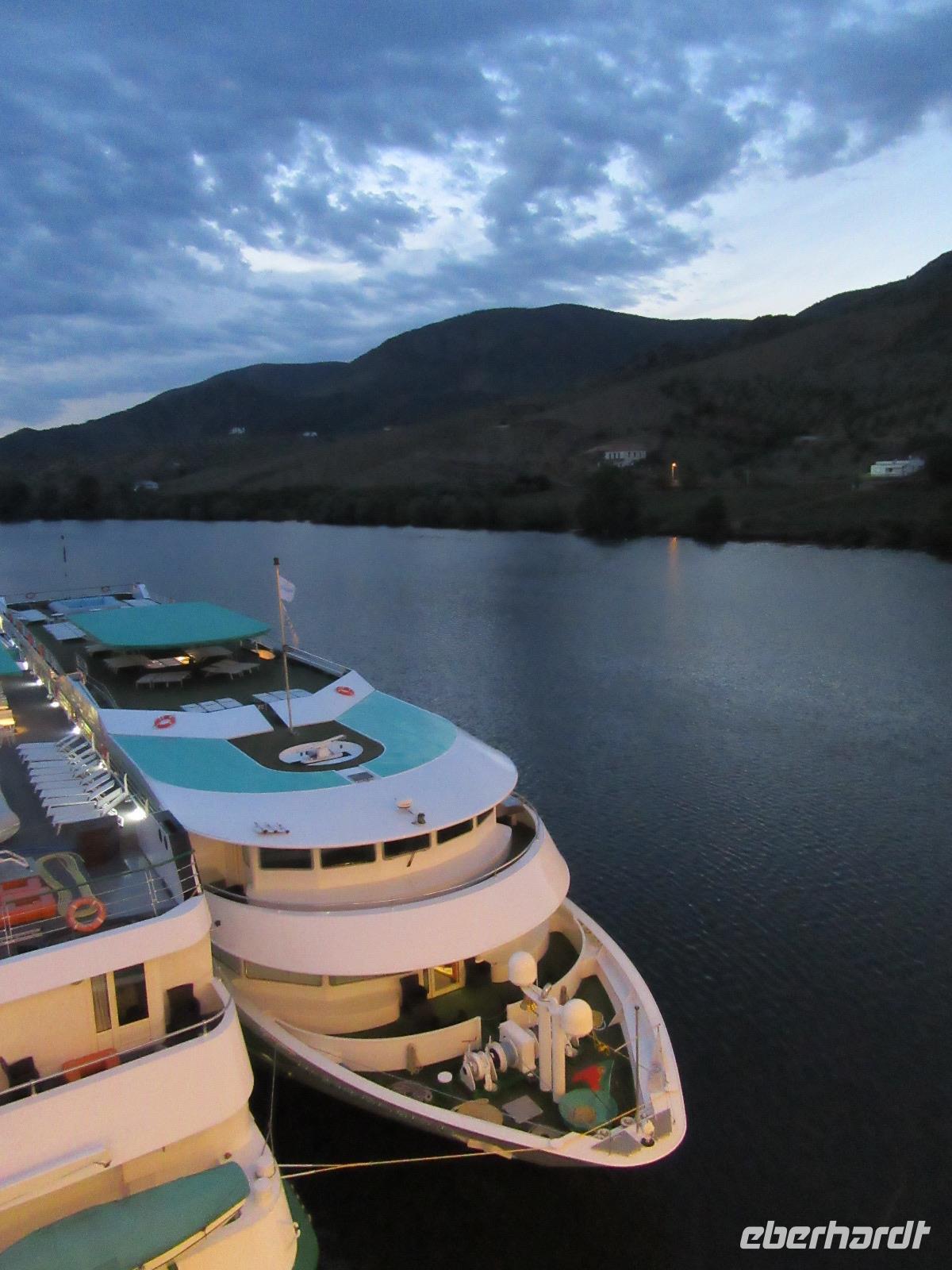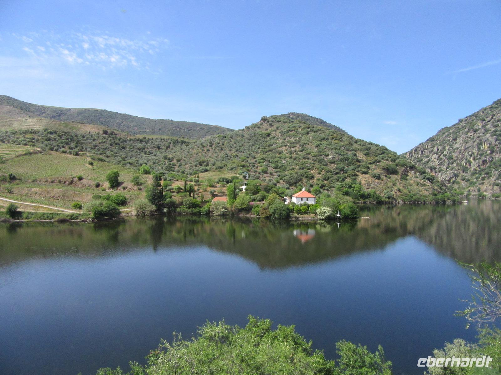 Noch während des Frühstücks legte unser Schiff ab und fuhr den morgendlich ruhenden Douro flussabwärts Richtung Ferradosa. Wir trafen uns zum Frühsport auf dem Sonnendeck und genossen anschließend bei doch recht windigem Wetter die vorbeiziehenden terrassenförmig angelegten Weinhänge. Nach dem Mittagsmenü wurden wir von Paolo abgeholt, der unser Guide für die nächsten zwei Tage sein sollte und wir fuhren durch das Weinanbaugebiet Alto Douro, der seit 1756 ersten herkunftsgeschützten Weinbauregion der Welt. Bei einem ersten Halt bei den zehn kleinen Wallfahrtskapellen von Sao Salvador do Mundo konnten wir in der ferne das Schiff und den Staudamm erkennen, außerdem einen grandiosen Panoramablick über die Region Cachao da Valeira. Weiter ging die Fahrt entlang kurvenreicher Serpentinenstraßen nach Sao Joao da Pesqueira. Bei sonnigem Wetter bummelten wir zum Ortszentrum und begutachteten die Kirche Igreja da Misericordia, die wie so viele andere Kirchen mit den blauen Kacheln (Azulejos) verkleidet war. Bei der anschließenden Freizeit erkundeten wir die kleinen engen Gassen, unter anderem die Travessa dos Gatos - die Katzenstraße. Die Häuser waren mit Schieferplatten verkleidet, was ihnen einen urigen Charme verlieh. Im Anschluss ging unsere Busfahrt weiter durch das fantastische Weinanbaugebiet des Douros. Bei einem weiteren Fotostopp konnten wir die wunderschöne Landschaft mit den wellenförmigen Terrassen der Weinhänge ausgiebig bewundern. Auch unser Kreuzfahrtschiff ganz in der Ferne konnten wir im Hafen von Pinhao erkennen. Da sollten wir also noch hinfahren. Vorher jedoch hielten wir in der Quinta do Tedo, einer Portweinkellerei die sich im Naturschutzgebiet zwischen den Flüssen Douro und Tedo befand. Nach einer ausgiebigen Führung erhielten wir die dort hergestellten Spezialitäten zum Kosten. Zurück an Bord in Pinhao machten wir uns für den Gala-Abend fein und genossen den Abend in geselliger Runde, fantastischem Mehr-Gang-Menü, schickem Zwirn und natürlich Portwein :-