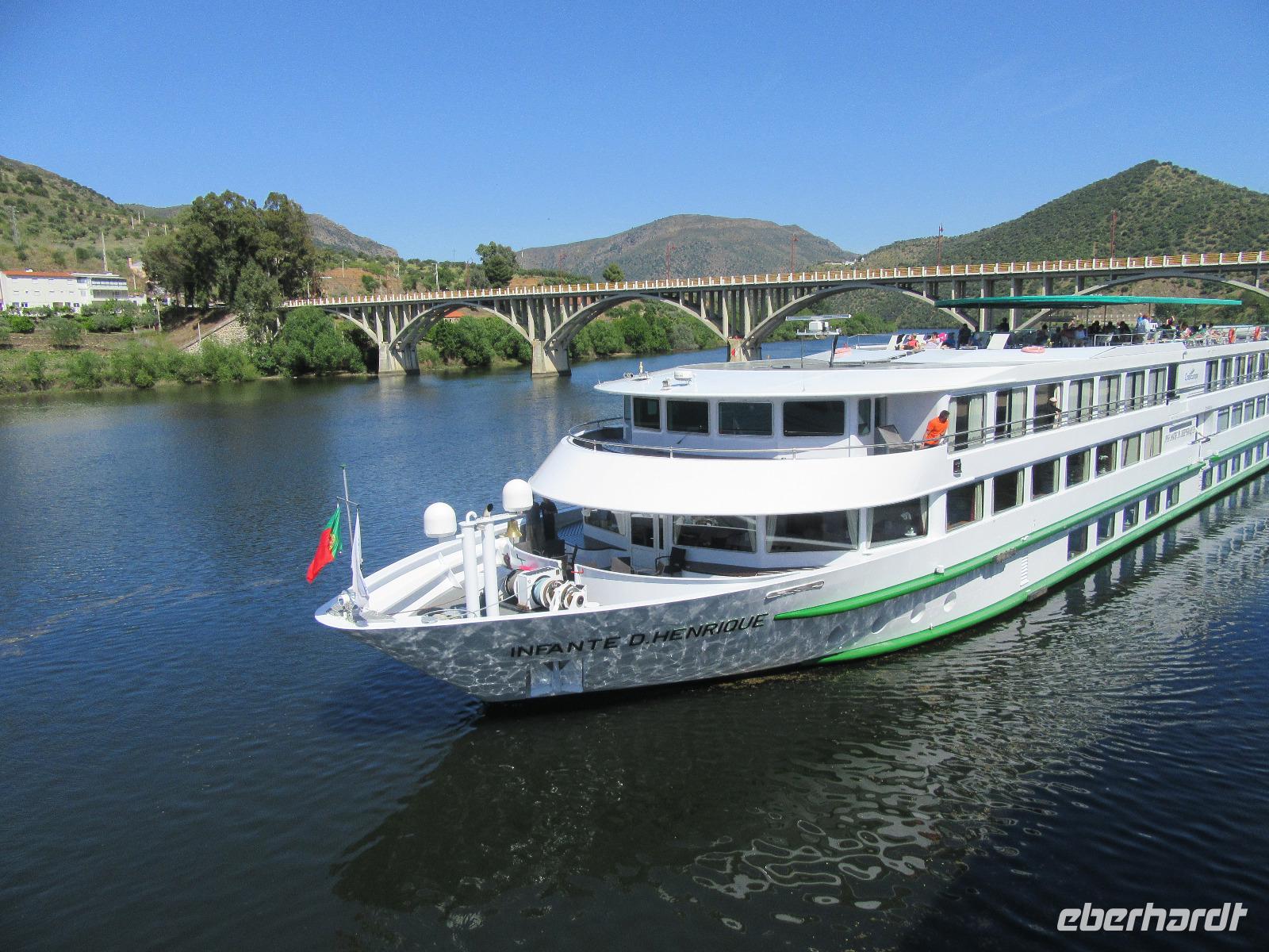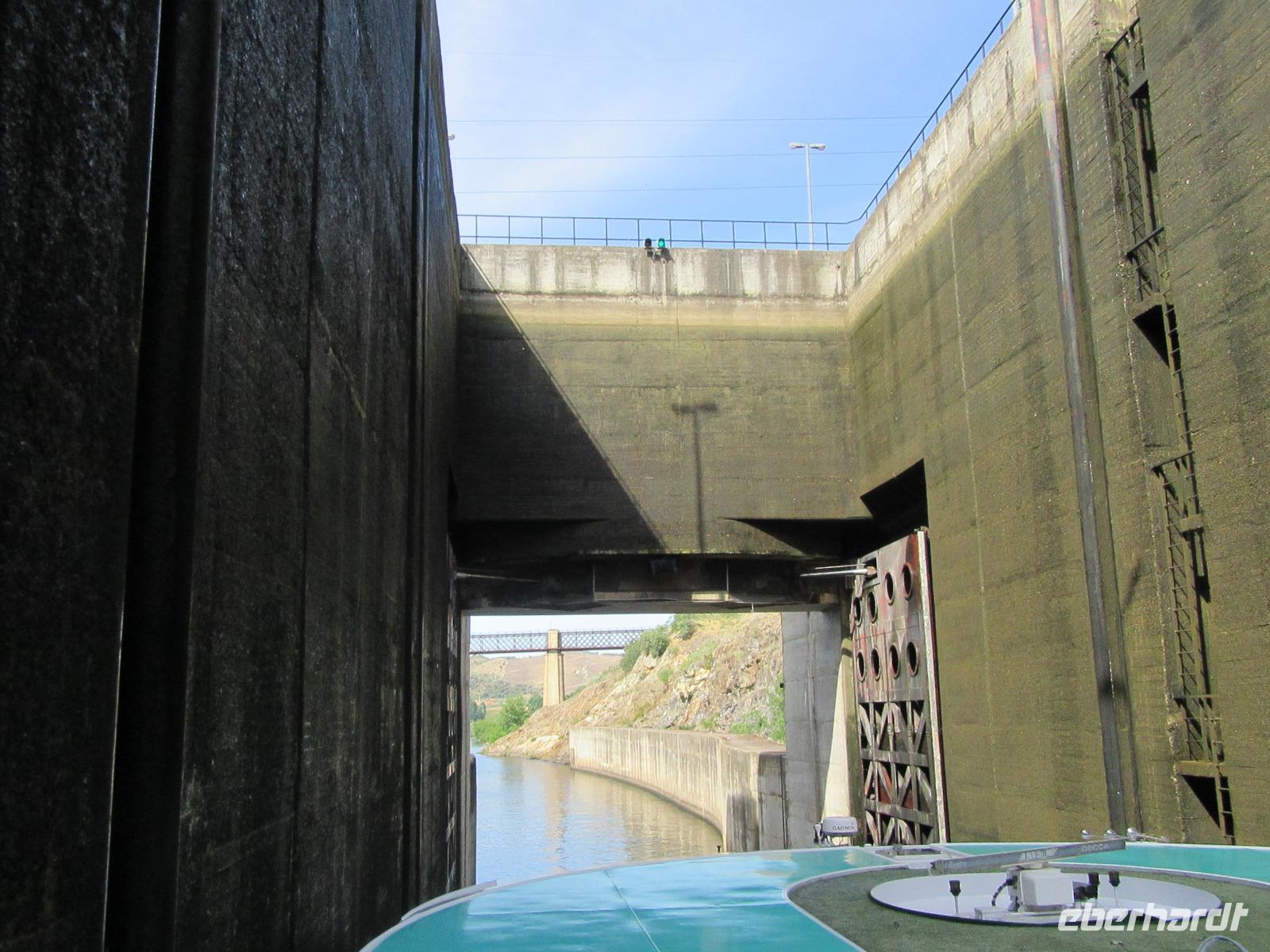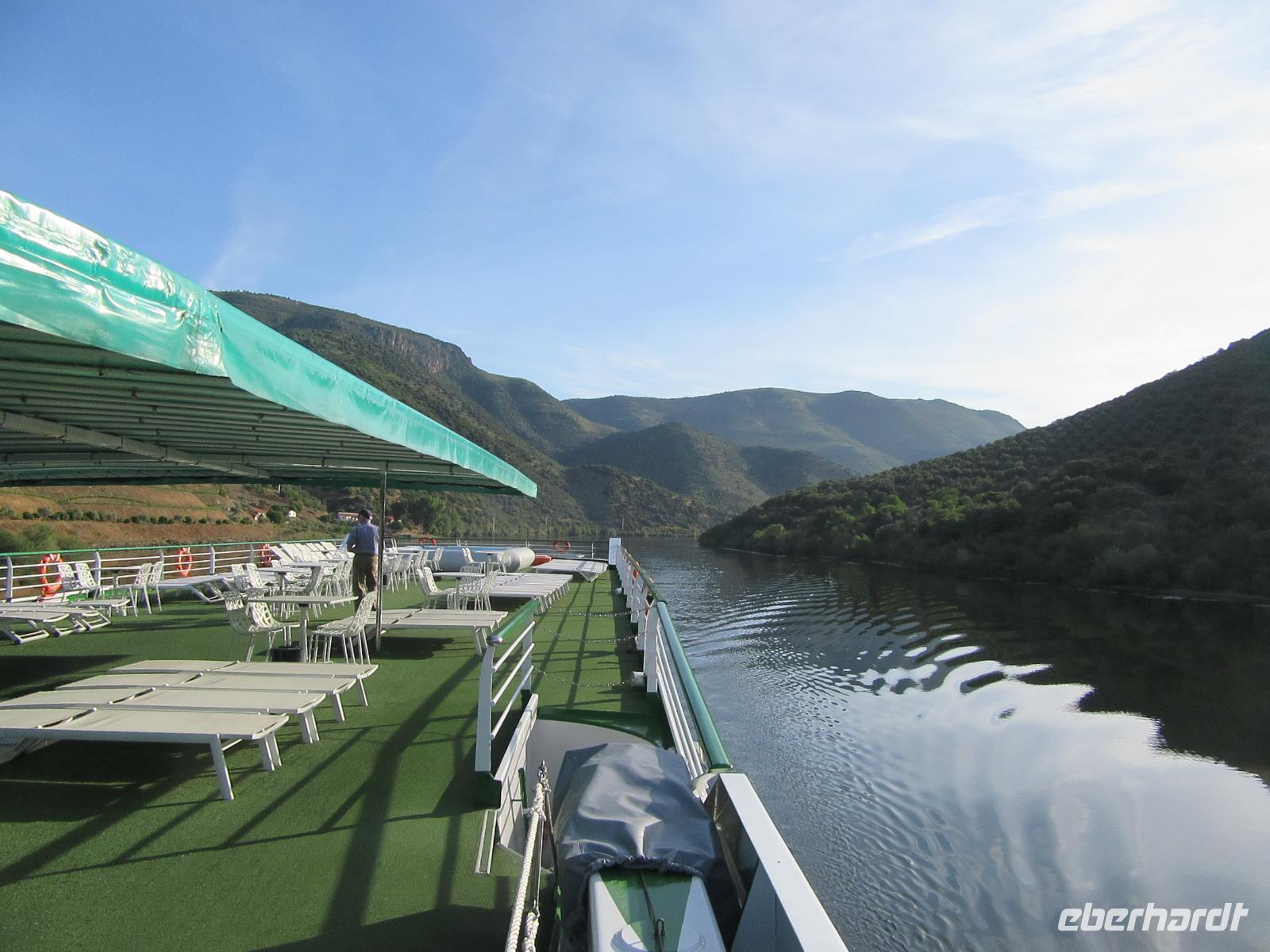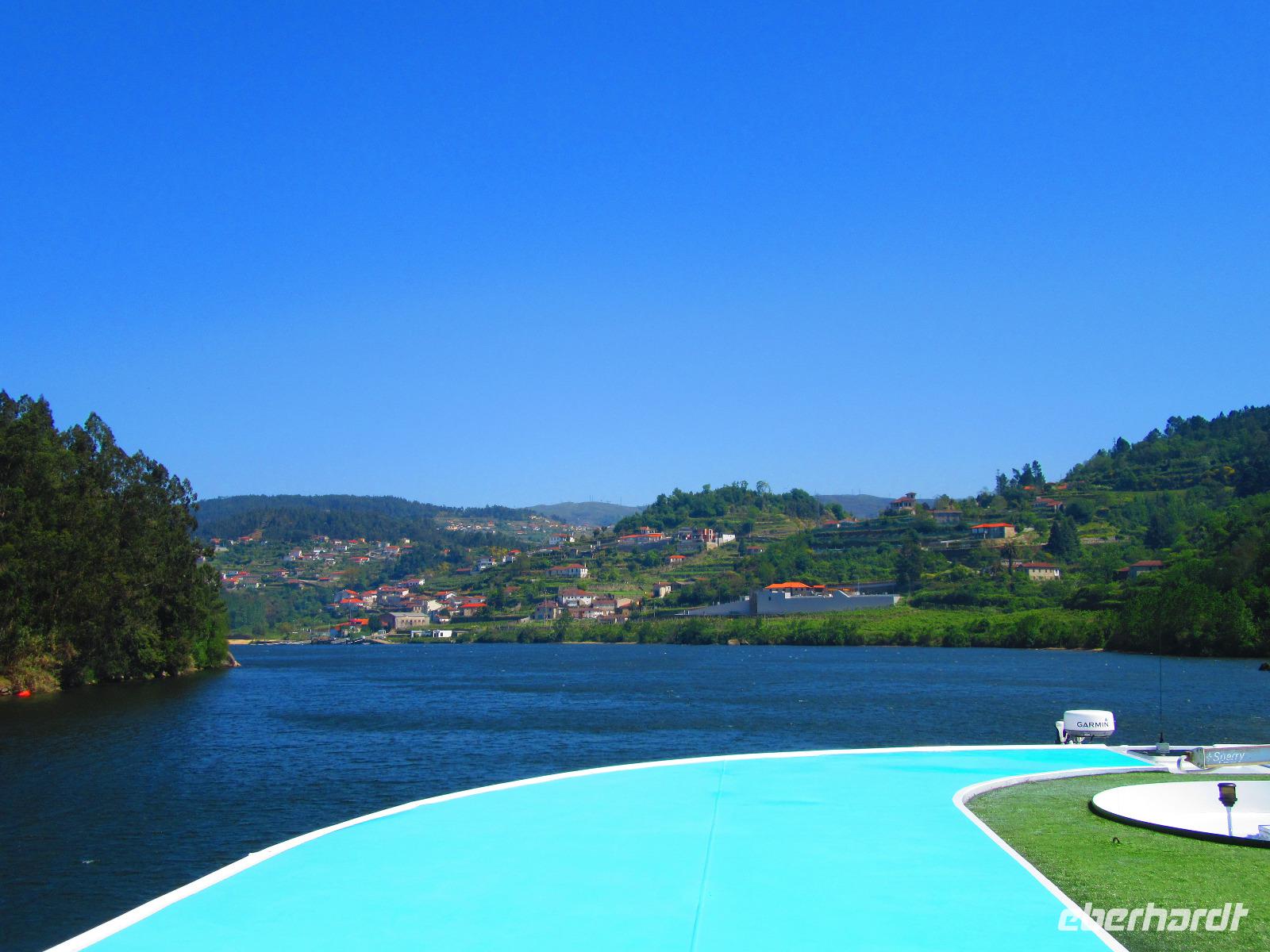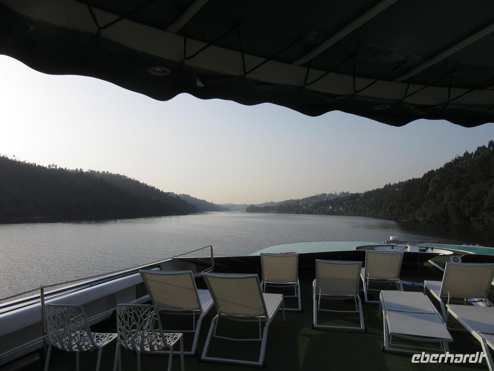 Der Vormittag empfing uns wieder mit einem kühlen grauen Wetter, aber das war nicht so schlimm. Schließlich wussten wir bereits, dass wir ab der Mittagszeit mit Sonne und blauem Himmel rechnen konnte. Wir fuhren wieder mit den englischsprechenden Gästen und unserer Reiseleiterin Adelia Richtung Guimares, um dem Geburtsort Portugals einen Besuch abzustatten. Wir besuchten den Palast der Herzöge von Braganza, welcher seit 2001 zum Welkulturerbe gehört. Das Wetter verschlechterte sich, was uns in den sicheren riesigen Hallen aber nicht störte. Wir sahen herzögliche Gemächer, wundervolle Wandteppiche, und riesige Hallen, deren Deckengewölbe einem alten Bootsrumpf nachempfunden wurden. Anschließend schlenderten wir durch die hübsche Innenstadt von Guimares, in der der erste König Portugals Alfons I. geboren sein soll, weshalb sie als Wiege der Nation Portugals gilt. Wieder zurück an Bord genossen wir ein leckeres Mittagsmenü und anschließend die vorbeiziehenden Landschaften des Dourotals. Als wir eine der zahlreichen Schleusen erreichten, mussten wir das Sonnendeck verlassen, da der Douro zu viel Wasser führte. Wir vertrieben uns die Zeit beim Kartenspielen. Danach konnten wir wieder auf das Sonnendeck gehen und eine der tiefsten Brücken beim Vorbeiziehen fast berühren. Abends erreichten wir den Ort Regua und nutzten nach dem Abendessen die Möglichkeit für einen kleinen Spaziergang und einen kleinen Tanz beim Tanzabend.