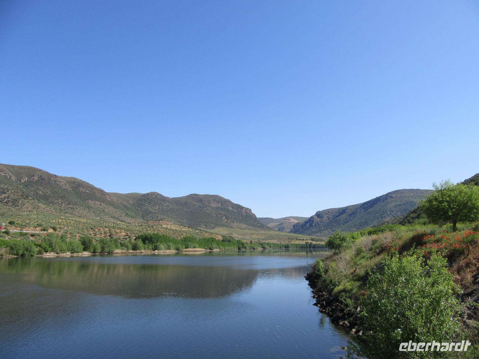 Nach einem guten Frühstück trafen wir uns zum Ausflug nach Vila Real. Vorher stoppten wir an dem Schloss Mateus, dessen barocke Fassade von den Etiketten des berühmten Mateus-Weins bekannt war. Wir schlenderten durch den üppig aber sehr korrekt angelegten Garten. Überall herrlich blühende Sträucher, Bäume und ein kleiner Weinhang vollendeten das Bild. Im Schloss selber durften wir bei einer kleiner Führung die alten ehrwürdigen Räume mit außergewöhnlichen Möbeln und einer interessanten Bibliothek bewundern. Zurück zum Bus geschlendert, ging die Fahrt weiter nach Vila Real. Wir spazierten gemeinsam durch die Stadt bis zum Café "Christas de Galo", wo wir das für den Ort typische Gebäck in Form eines Hahnenkamms bei einem Pinca (kleiner Kaffee mit Milch) probierten. Während der anschließenden Freizeit konnte jeder nach seinen Wünschen in den Straßen bummeln und die Häuser mit den typischen Azulejos (Kacheln) bewundern. In Tavora gingen wir wieder an Bord und konnten nach dem Mitagessen bei der Schifffahrt das imposante Dourotal vom Sonnendeck aus bewundern. Am Abend erreichten wir Barca d´Alva, kurz vor der spanischen Grenze.
