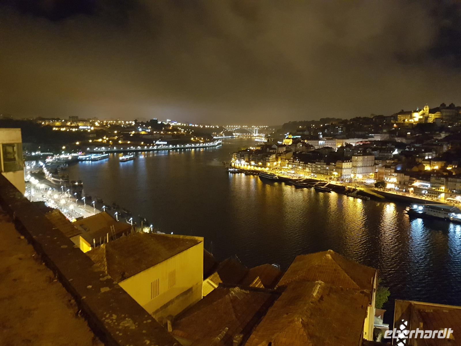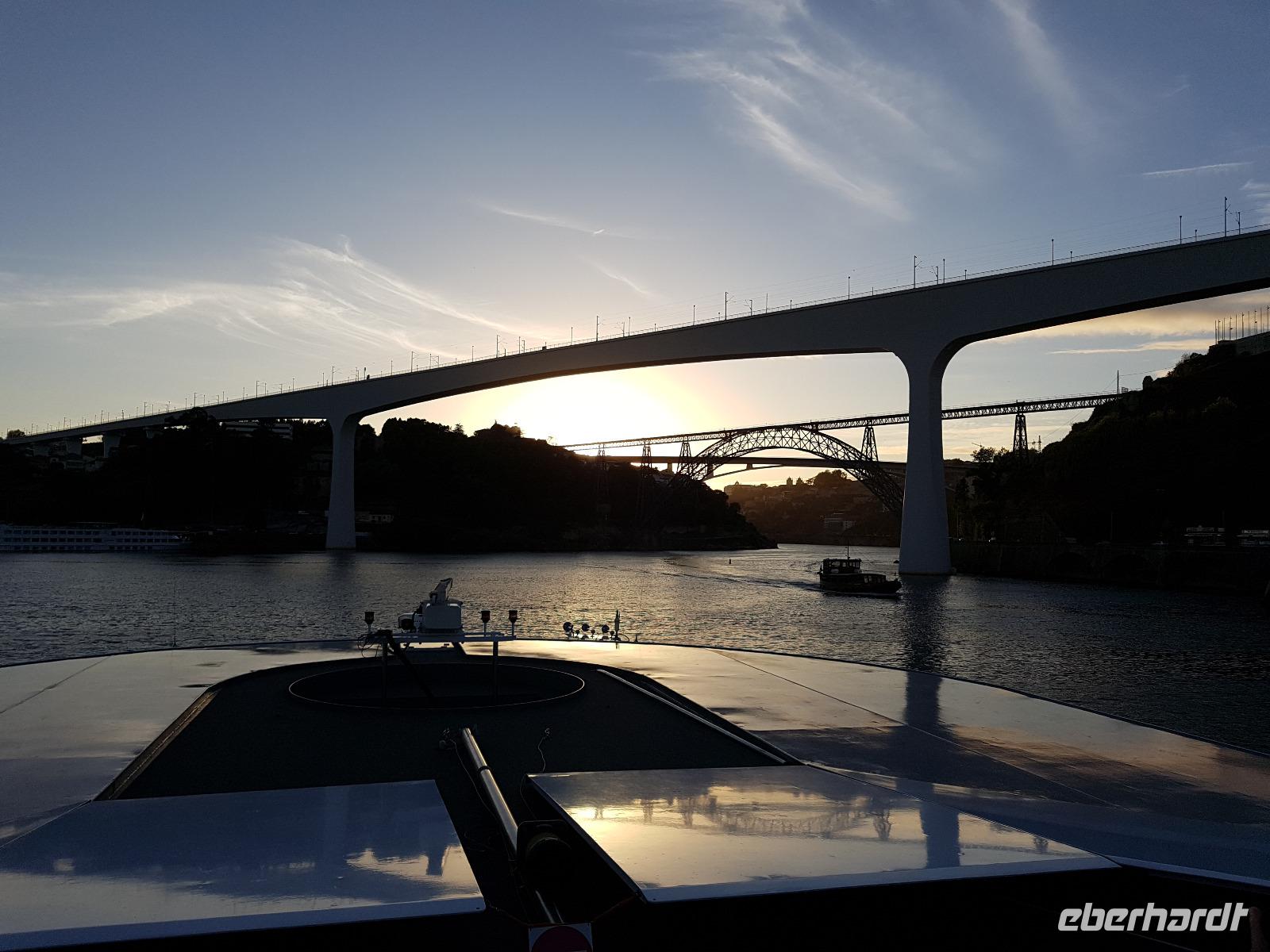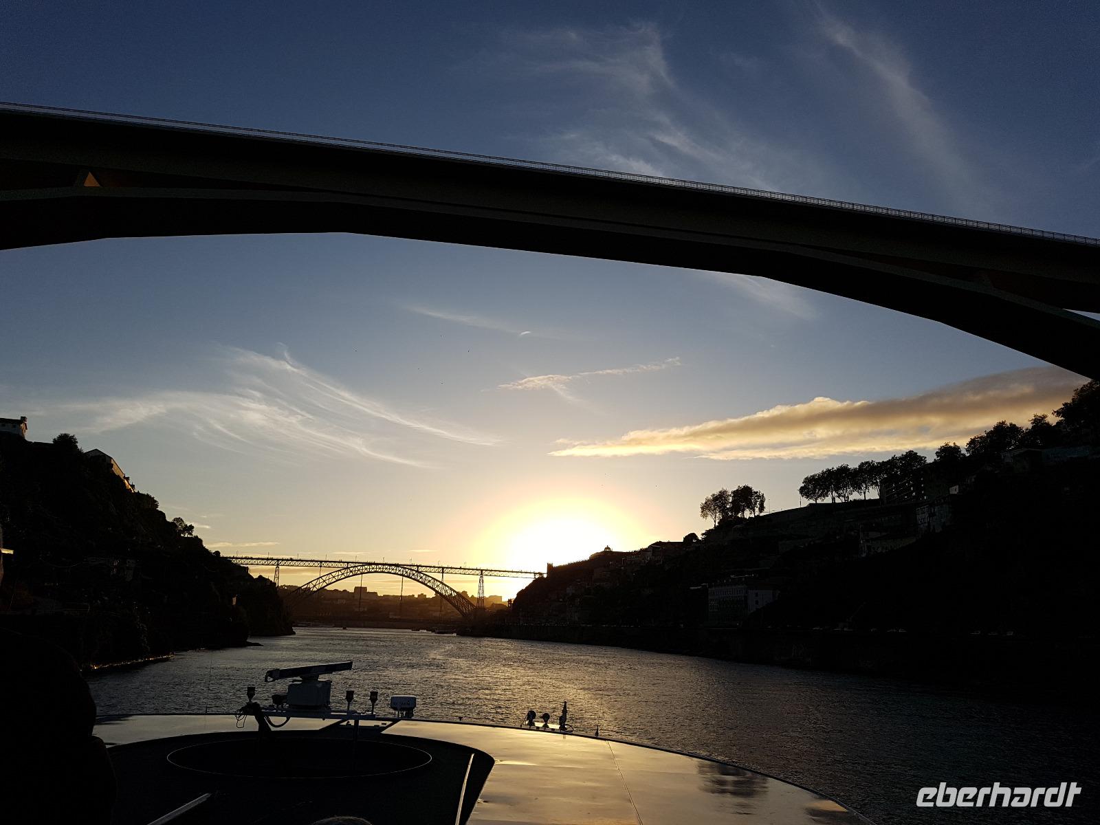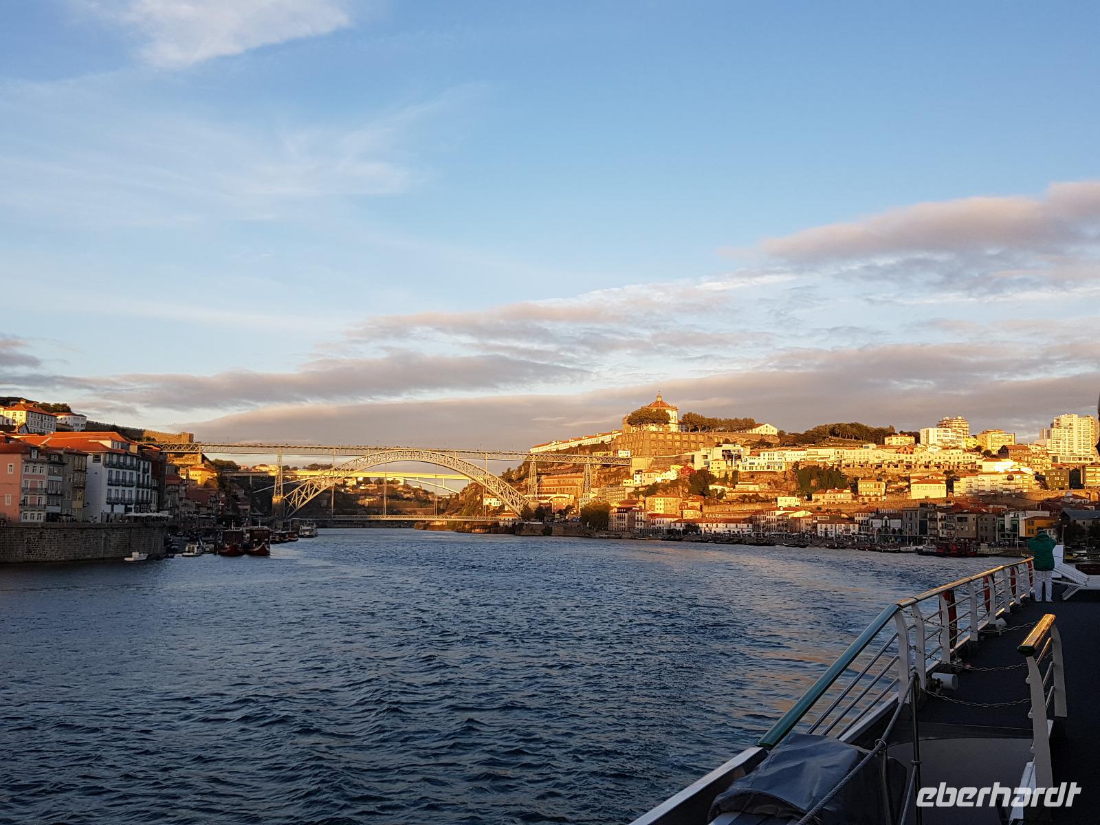 Dann fuhr unser Schiff weiter nach Porto. Der Kapitän hielt eine weitere Überraschung für uns bereit und fuhr durch Porto bis zur Mündung des Douro in den Atlantik. So sahen wir die Stadt noch einmal golden glänzend in der untergehenden Sonne. Beim letzten Abendessen verwöhnte uns die Crew noch einmal und danach trat in der Bar eine Folklore Gruppe auf.