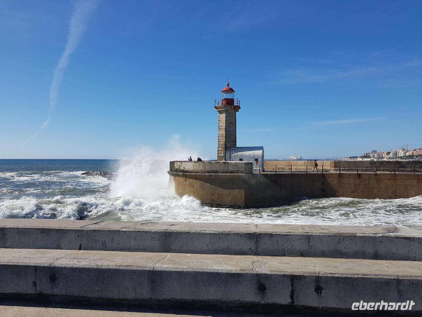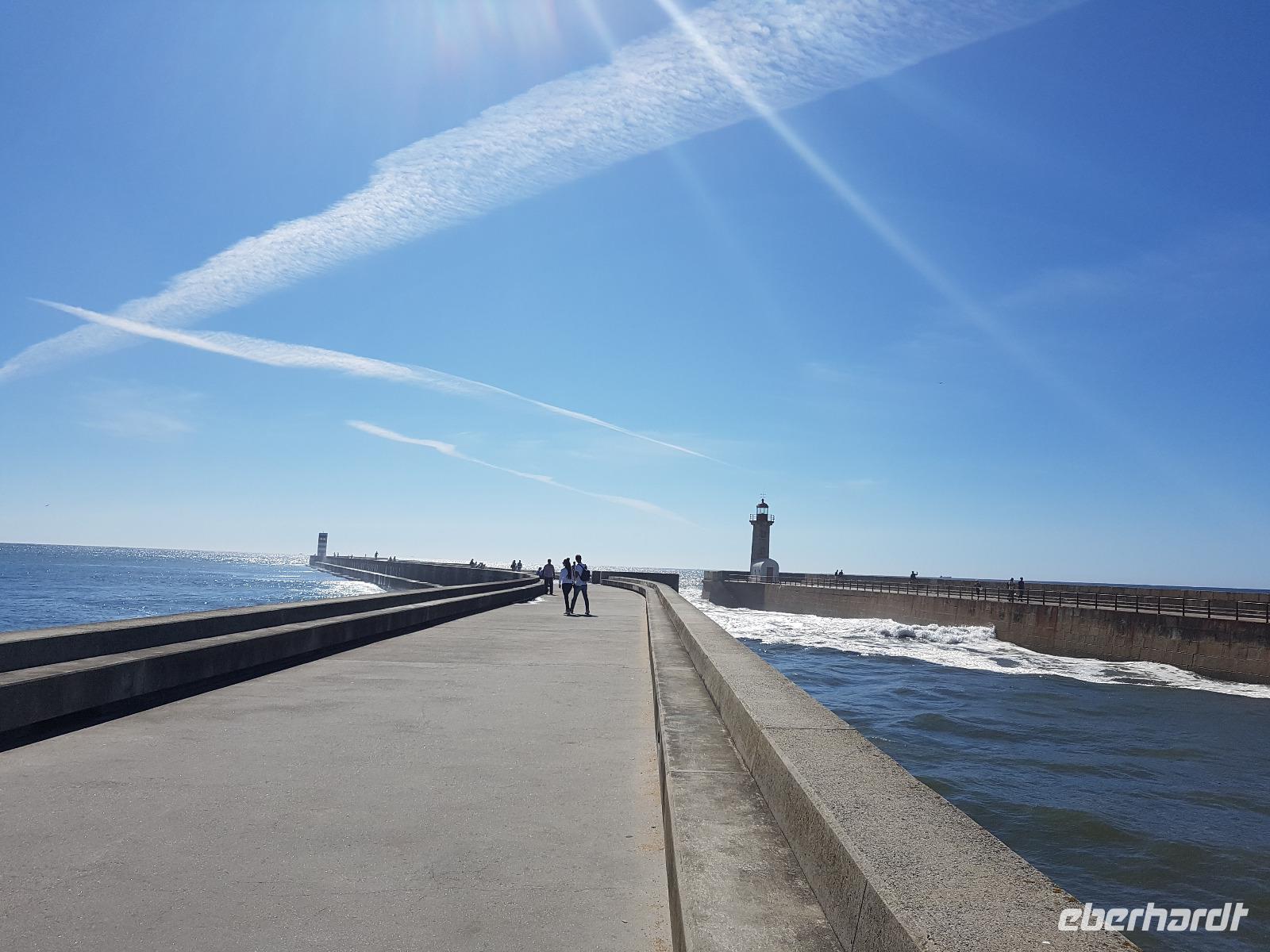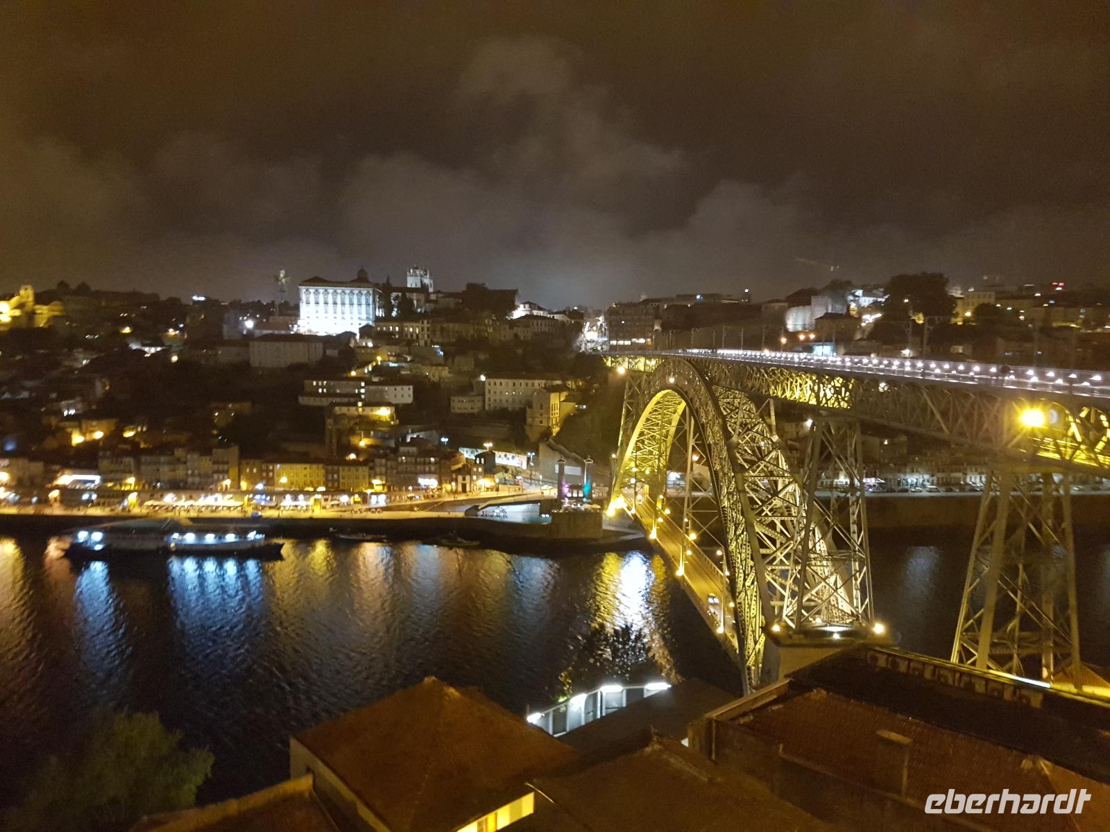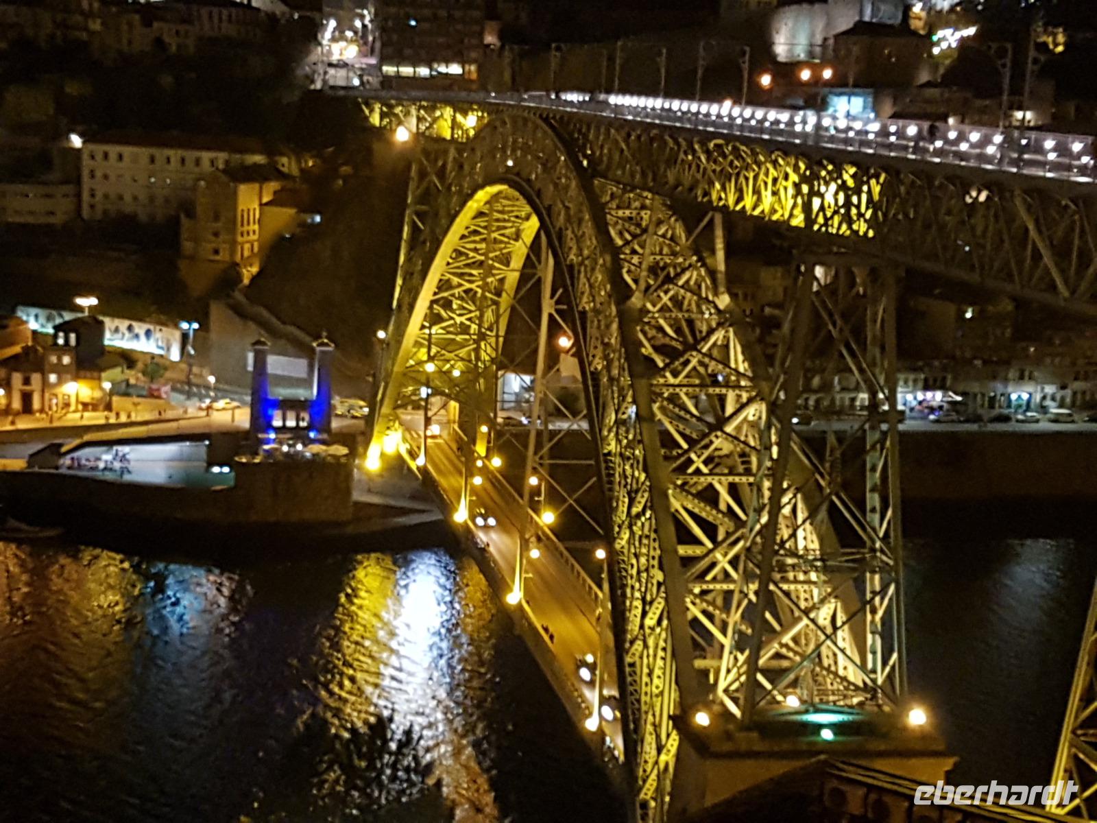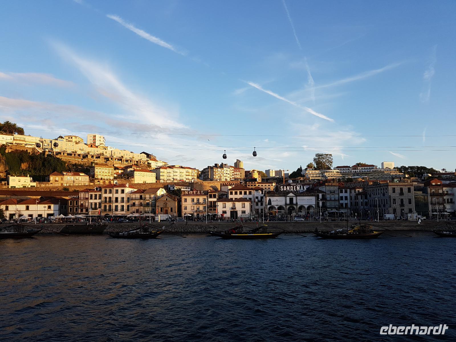 Dann fuhr unser Schiff weiter nach Porto. Der Kapitän hielt eine weitere Überraschung für uns bereit und fuhr durch Porto bis zur Mündung des Douro in den Atlantik. So sahen wir die Stadt noch einmal golden glänzend in der untergehenden Sonne. Beim letzten Abendessen verwöhnte uns die Crew noch einmal und danach trat in der Bar eine Folklore Gruppe auf.
