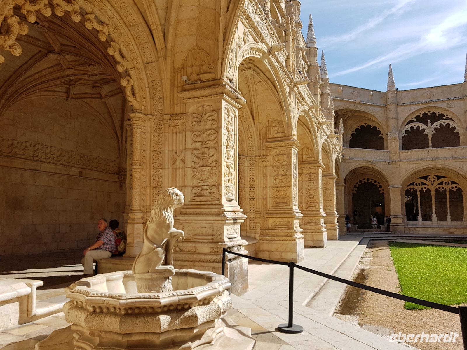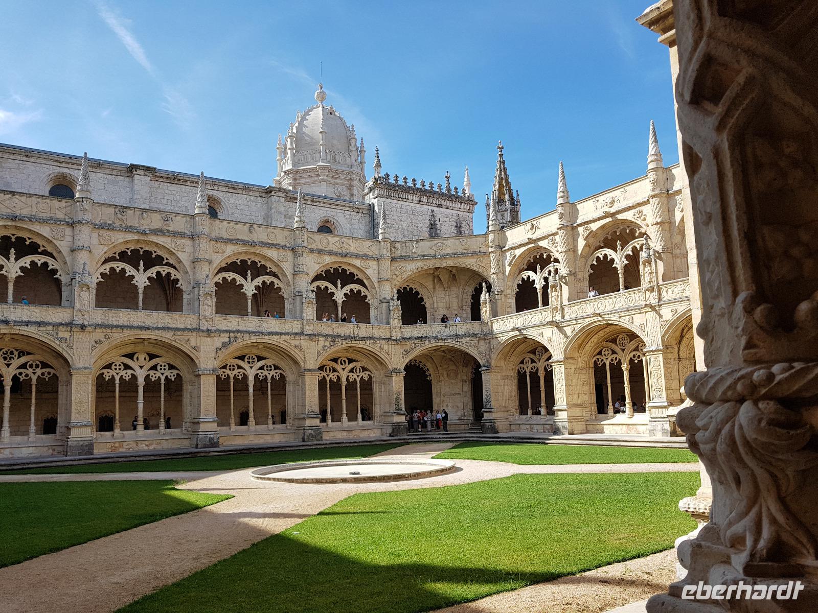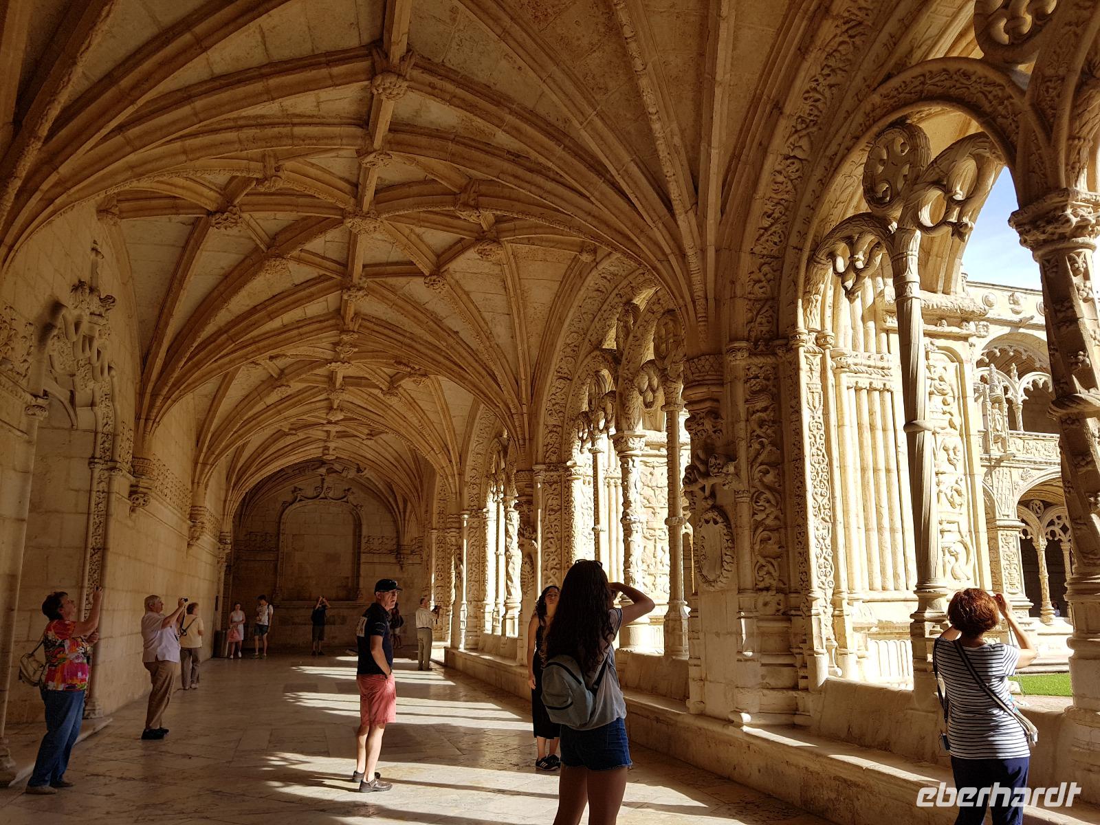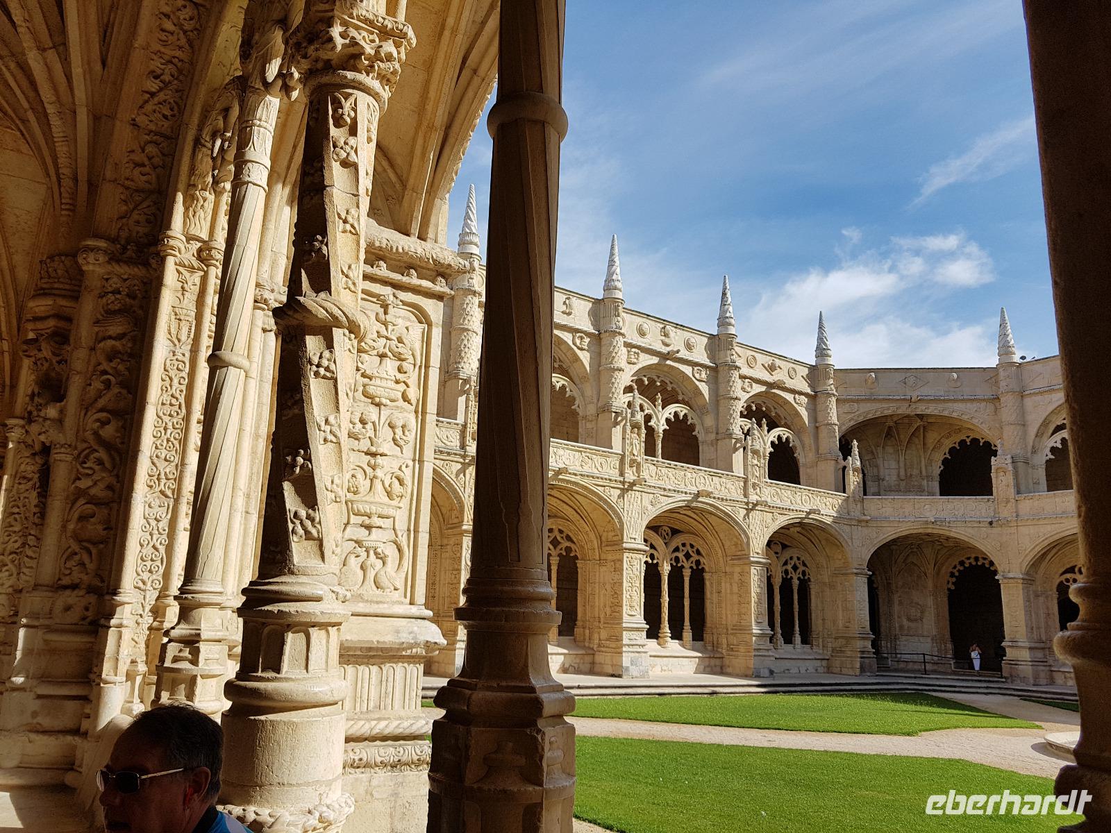 Nach einem guten Frühstück fuhren wir mit dem Bus durch die Außenbezirke zum Aussichtspunkt beim Park Eduard VII, mit Blick über Lissabon, und dann weiter nach Belem. In diesem einstigen Vorort wurden früher Schiffe gebaut, dort wartete man auf die richtige Strömung und es sammelten sich die Flotten für Entdeckungsfahrten. Heute erinnern der Turm von Belem und das Seefahrermonument an diese Zeit. Noch heute kommt an dieser Stelle ein Lotse an Bord, wenn Schiffe hinaus auf den Atlantik fahren. Beim verheerenden Erdbeben von 1755 wurde dieser Vorort zerstört bis auf das Hieronymuskloster. Das Kloster ist heute ein Wahrzeichen Lissabons und wir begannen mit der Besichtigung der Kirche und des Kreuzganges. Das in Belem kreierte Gebäck Pasteis de Belem bekam danach jeder Gast zum Probieren. Nach 2 Fotostopps am Tejo gings dann weoter ins Stadtzentrum zur Mittagspause.