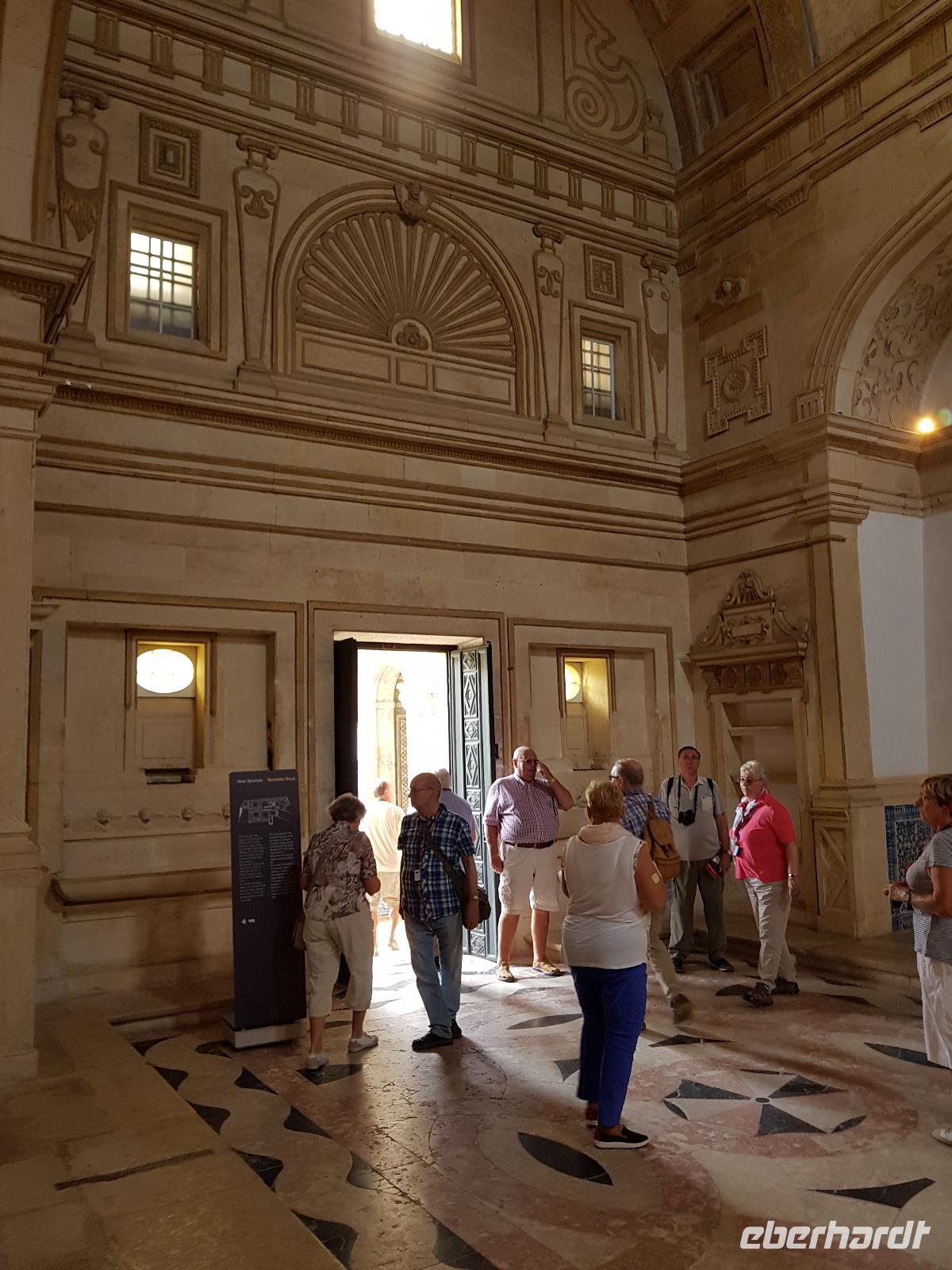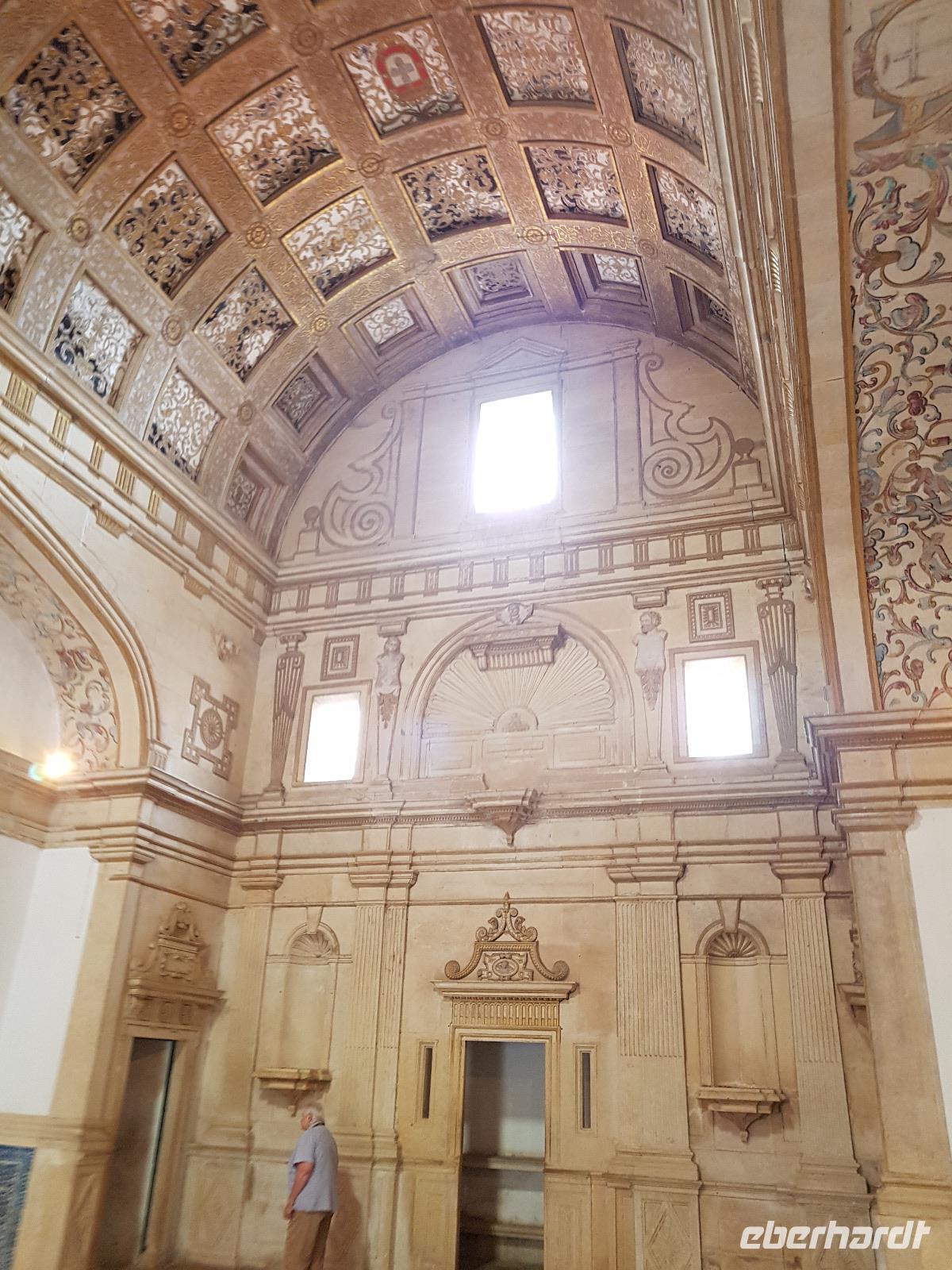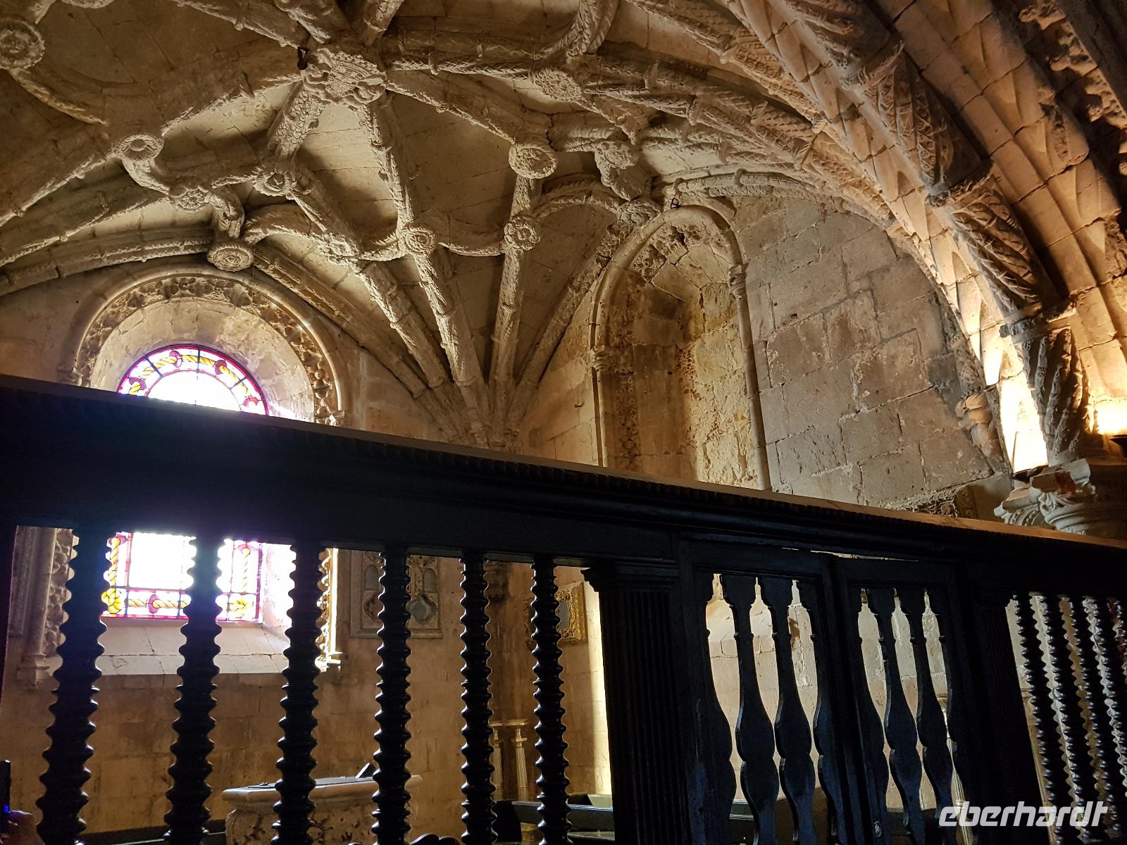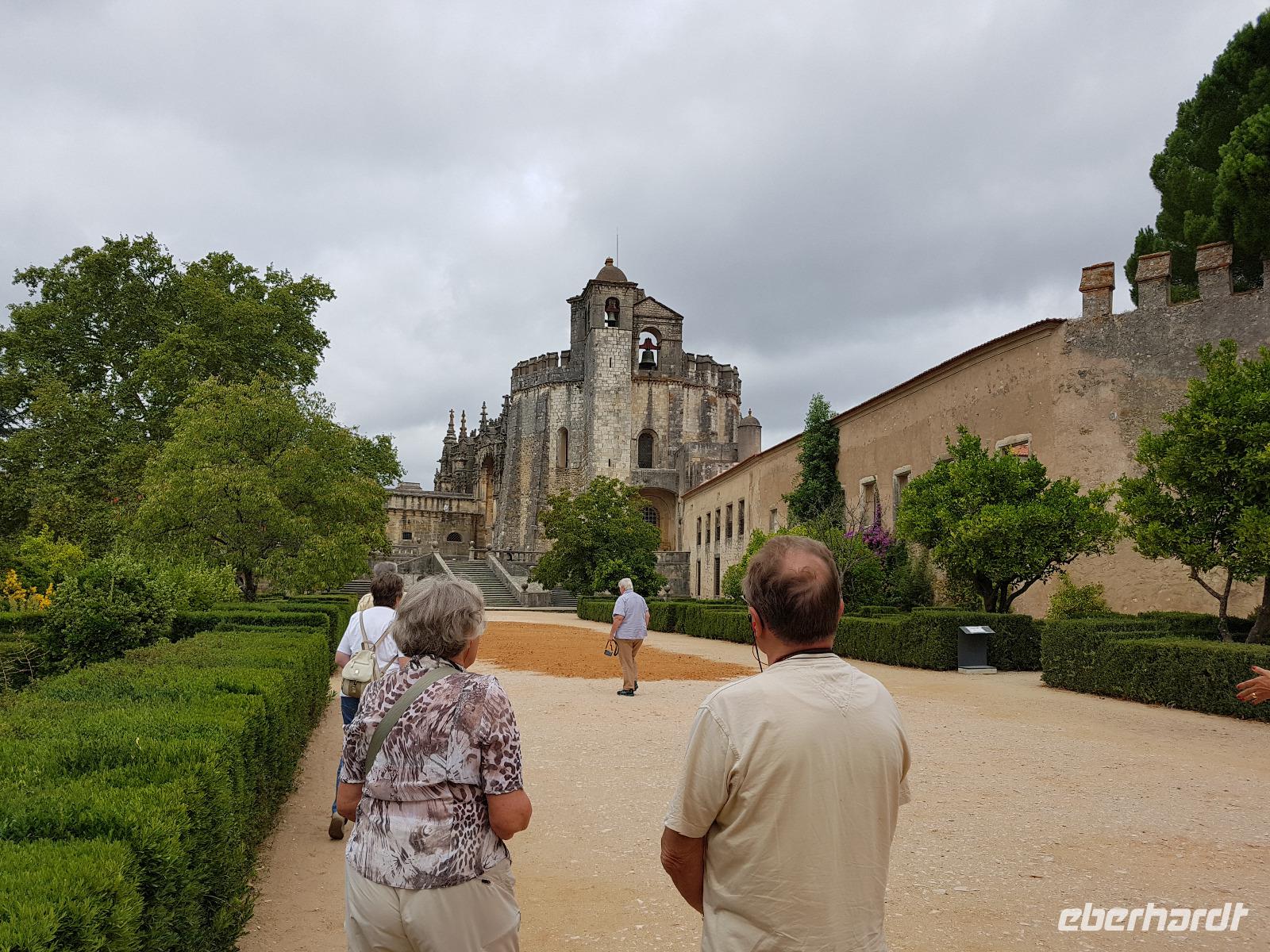 Unser Kurzaufenthalt in Lissabon war schon zu Ende. Mit unseren Koffern starteten wir zur Fahrt nach Tomar. Unterwegs berichtete Isabel über die Geschichte und das heutige Leben der Portugisen. Schulbildung, Arbeitsmarkt, Mehrwertsteuer, Gesundheitswesen, Renten uvm. wurden ausführlich erläutert. Zur Landwirtschaft wurde immer passend zum Anbau an der Autobahn informiert. In Tomar fuhren wir hinauf zur rießigen Anlage der ehemaligen Templer- und Christusritterburg. Nach der Rückeroberung von den Mauren Mitte des 12.Jahrhunderts baute der Templerorden ein Kloster, welches nach Auflösung des Ordens an den portugisischen Christusritterorden ging. Unter Heinrich dem Seefahrer erlangte es große Bedeutung im 15. Jahrhundert. Mit dem Wandel des Ordens von militärischen zu religiösen Aufgaben wurde in den Räumlichkeiten im 16. Jahrhundert ein Krankenhaus eingerichtet. Der monumentale Bau wurde aufwendig saniert und ist heute UNESCO Weltkulturerbe. Isabel bot uns eine fachkundige Innenführung und machte uns auf viele interessante Details aufmerksam. Vor dem Kloster wurden von Bauern Früchte aus der Region angeboten. Uns hatten es die frischen Feigen angetan.