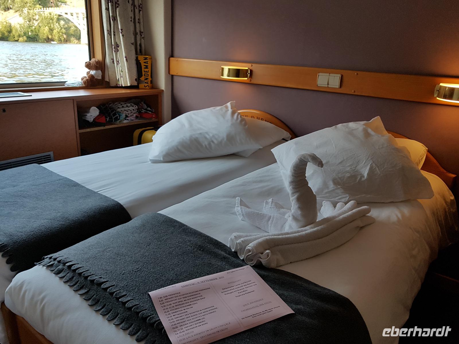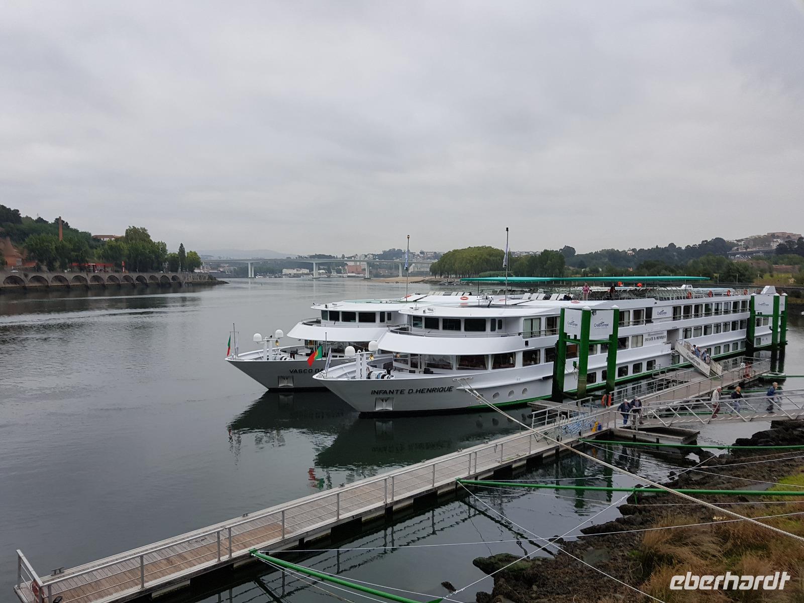 Gegen 17 Uhr erreichten wir unser Schiff, bekamen gleich die Kabinenschlüssel und ein Crew Mitglied geleitete jeden zur Kabine und erklärte alle wichtigen Details in der Kabine. 18 Uhr saßen wir alle schon wieder auf dem Sonnendeck bei einem Drink und bekamen erste wichtige informationen von Teresa. Danach wurden die Koffer ausgepackt und 19 Uhr lernten wir in der Bar beim nächsten Drink die gesamte Mannschaft mit dem Kapitän kennen. Im Anschluß nahmen wir im Speisesaal unser erstes leckeres Abendessen ein. Wir fühlten uns sofort wie zu Hause, denn die Kellner waren alle sehr freundlich und aufmerksam. Unsere Getränke waren inklusive und so wählte jeder sein Wunschgetränk zum Abendessen. Nach dem Abendessen brach noch ein Teil unserer Gruppe zum Ausflug "Porto bei Nacht" auf und so war dieser Tag randvoll gefüllt mit vielen Höhepunkten. Von einem Aussichtspunkt sahen wir die beleuchtete Stadt mit den gigantischen Brücken und im Zentrum von Porto besuchten wir einen Bahnhof, der mit wunderschönen blauweißen Kacheln geschmückt war. Dann durften wir endlich ins Bett.