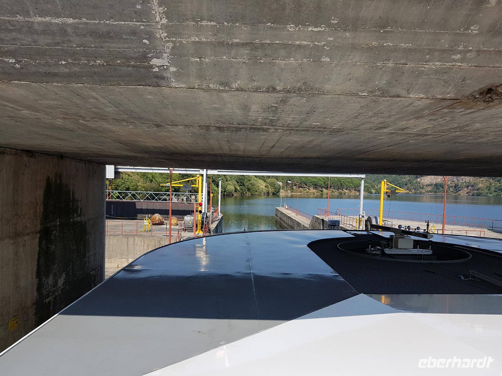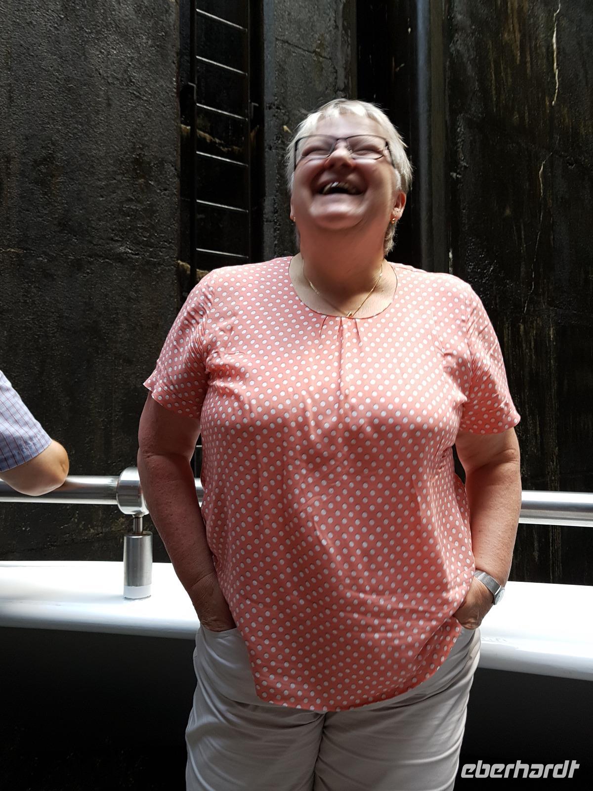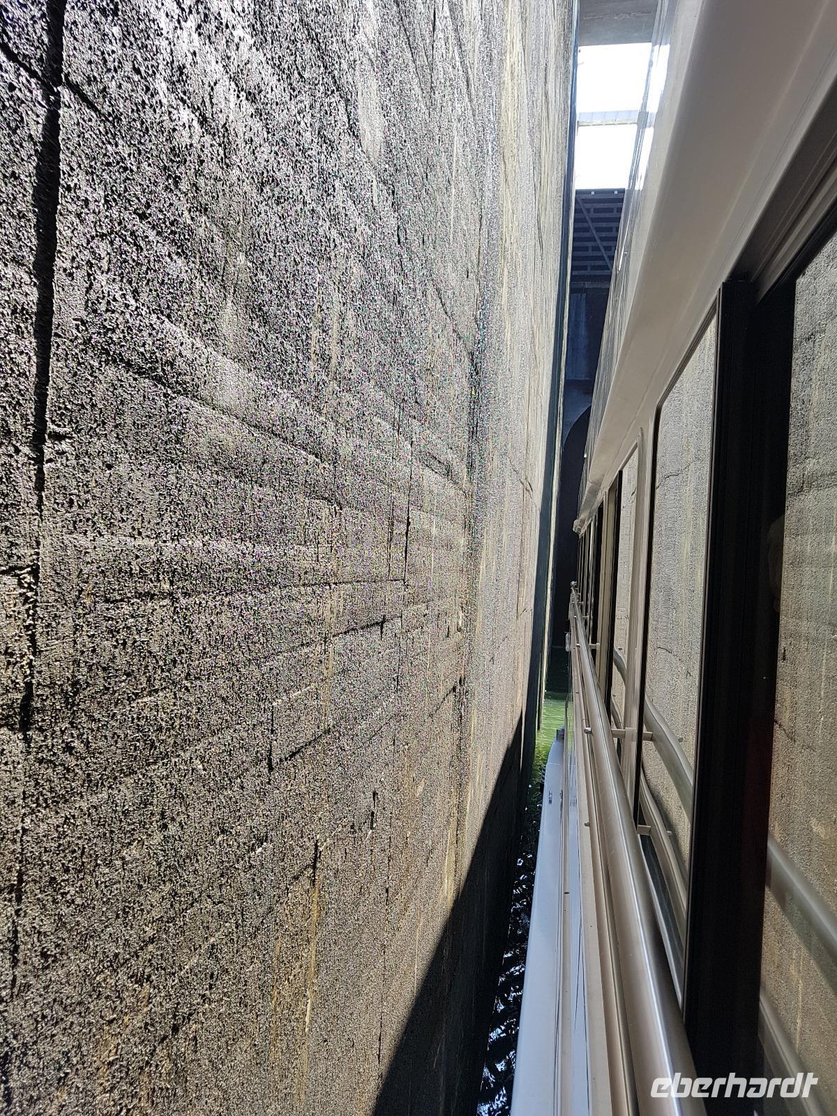 Die Besatzung hielt für uns eine Überraschung bereit - wir durften in kleinen Gruppen zum Kapitän auf die Brücke. Teresa begleitete die Eberhardt Gruppe und übersetzte. Da gerade die Einfahrt in eine Schleuse bevorstand, durften wir bleiben und vor der Brücke Platz nehmen. Ein grandioses Schauspiel begann, als das Wasser aus der Schleuse abfloß und wir ganz unten waren vor der riesigen Schleusentür.
