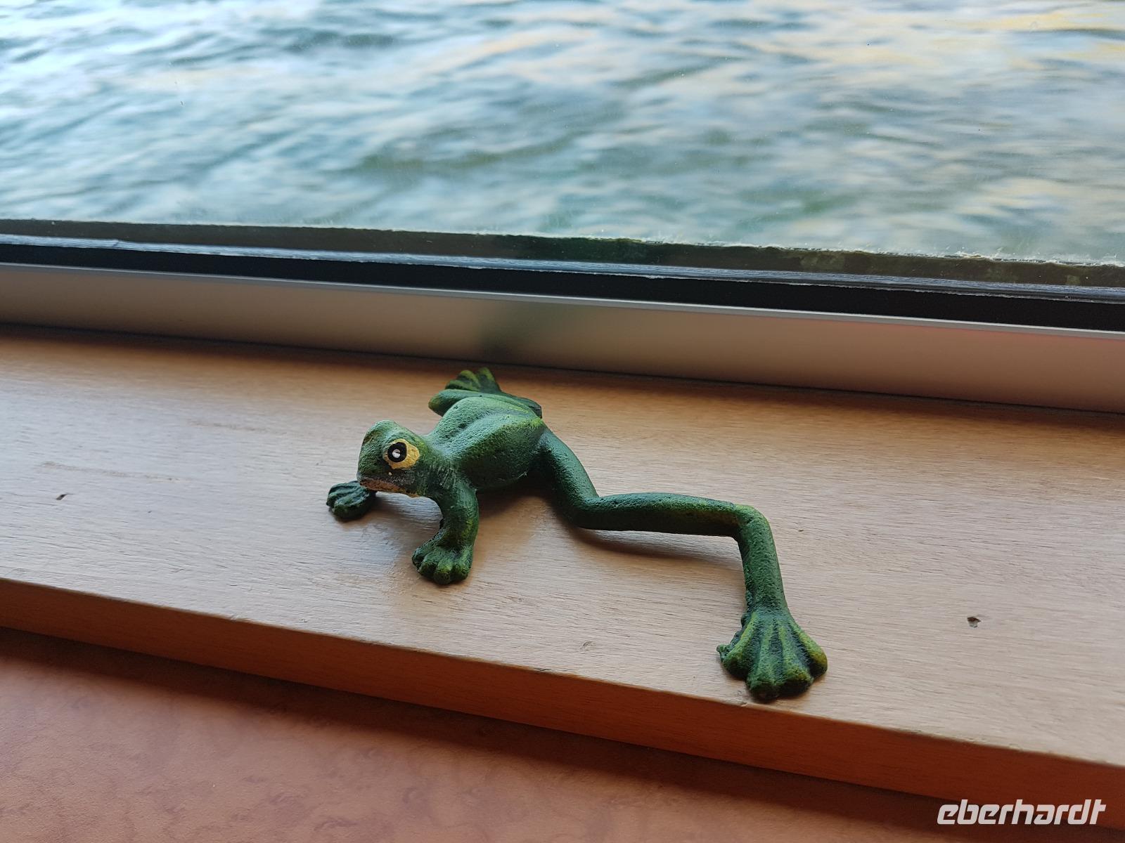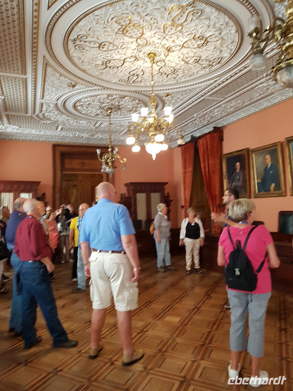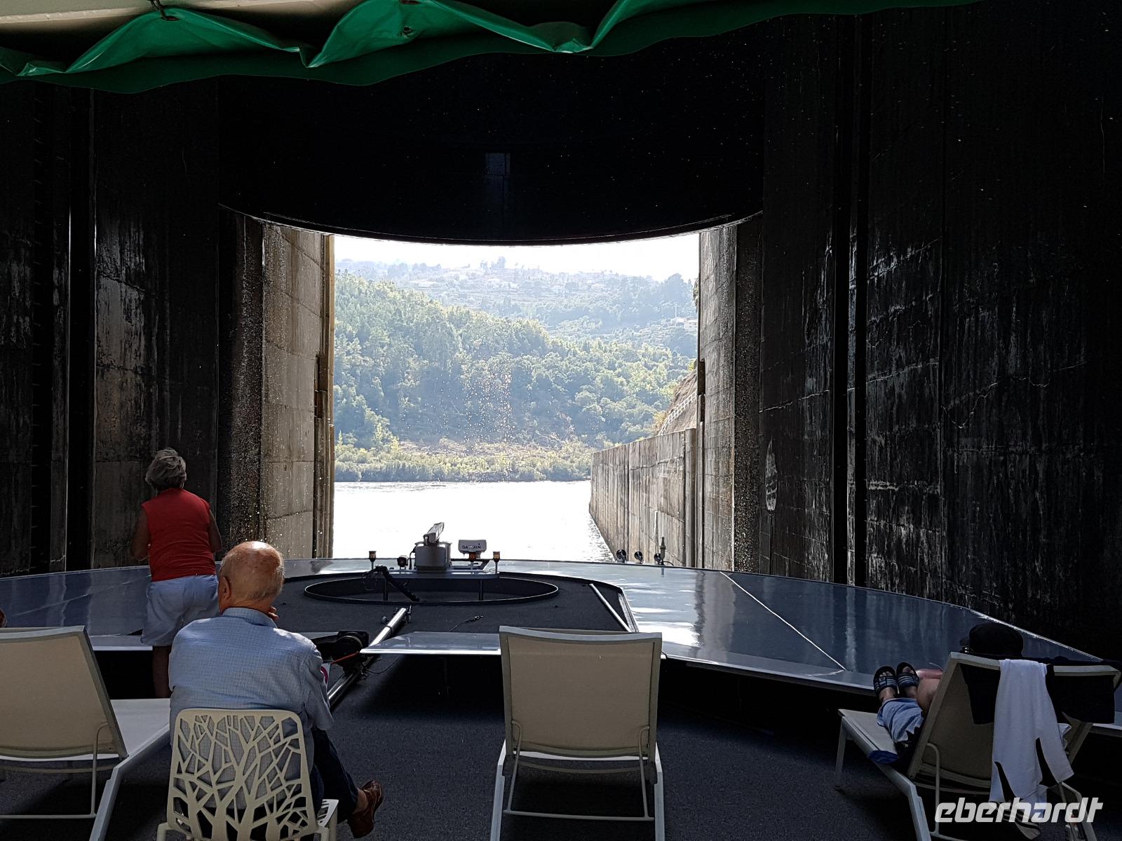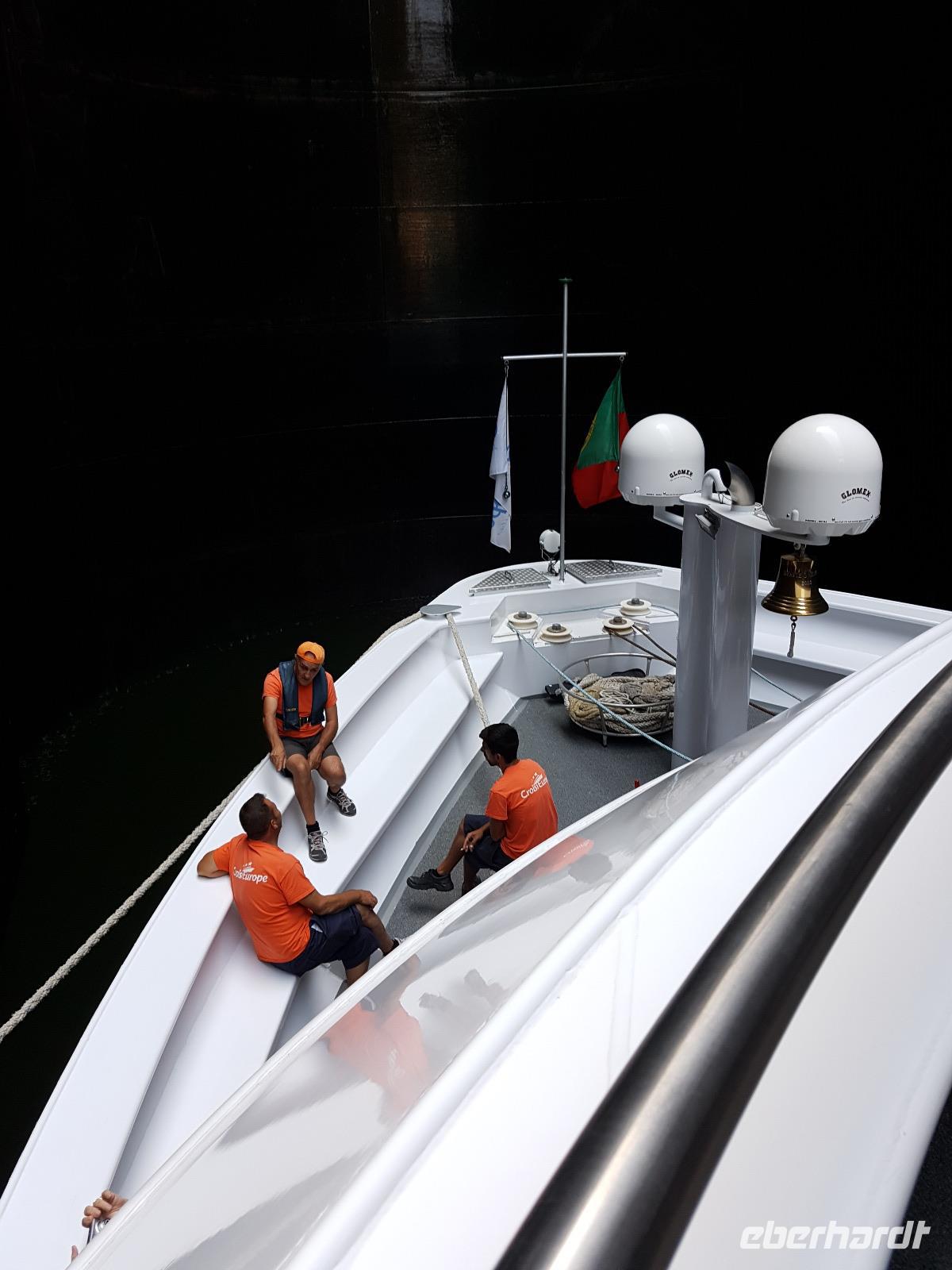 Die Besatzung hielt für uns eine Überraschung bereit - wir durften in kleinen Gruppen zum Kapitän auf die Brücke. Teresa begleitete die Eberhardt Gruppe und übersetzte. Da gerade die Einfahrt in eine Schleuse bevorstand, durften wir bleiben und vor der Brücke Platz nehmen. Ein grandioses Schauspiel begann, als das Wasser aus der Schleuse abfloß und wir ganz unten waren vor der riesigen Schleusentür.