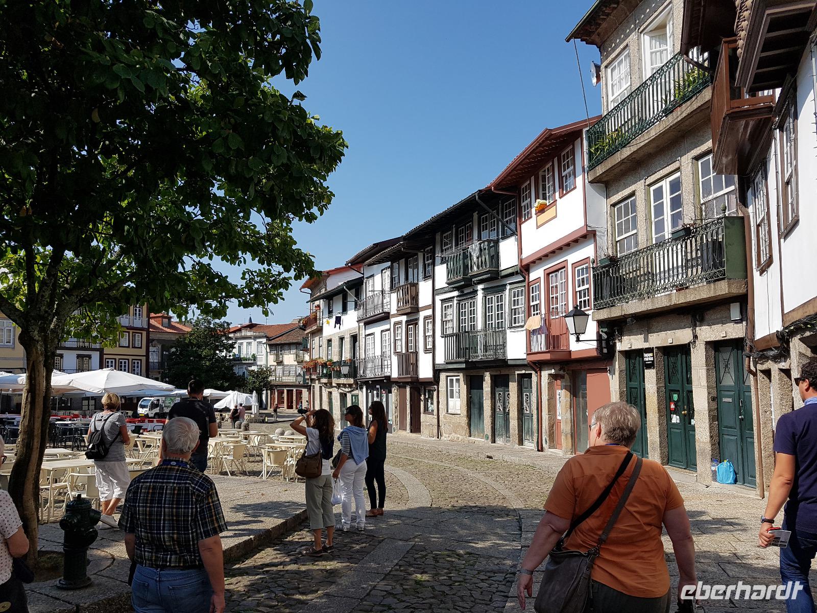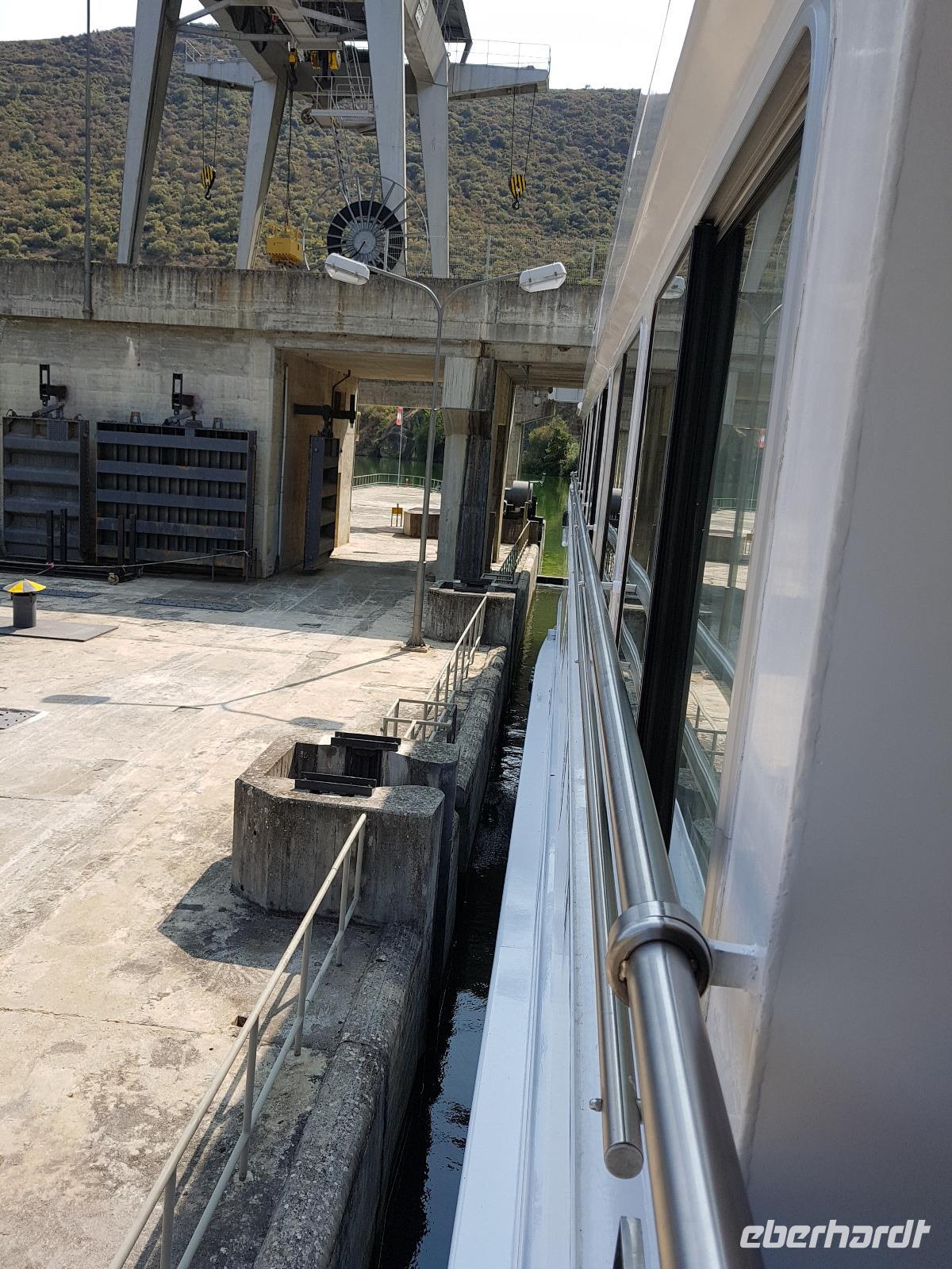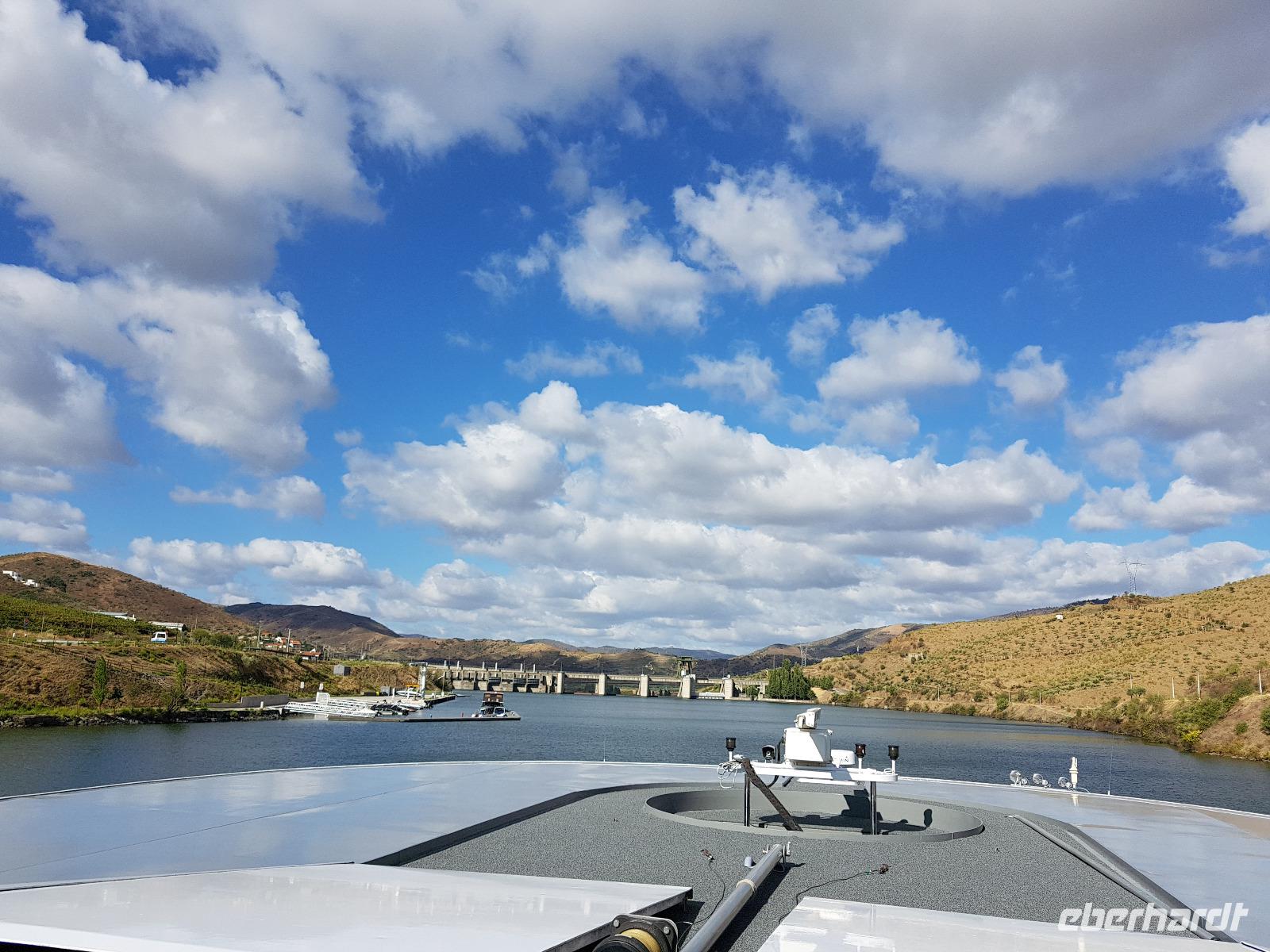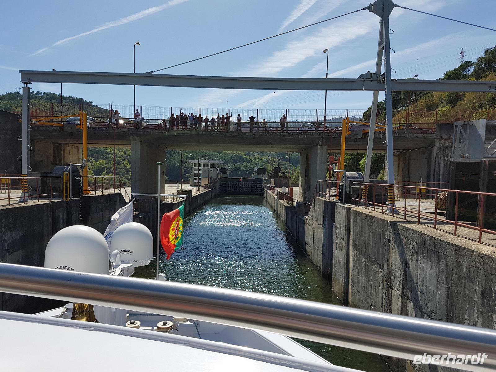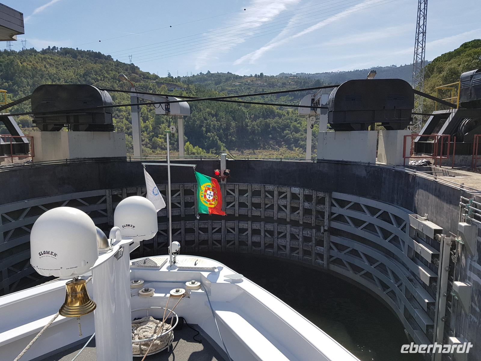 2012 war Guimaraes Europäische Kulturhauptstadt und so wurde der Spaziergang durch das Zentrum zu einem zweiten großen Erlebnis auf unserem Ausflug. Unser Schiff hatte inzwischen Porto verlassen und wir Ausflügler stiegen in Leverinho kurz vor dem Mittagessen wieder zu. Nach dem Mittagessen konnte dann auf dem Sonnendeck die Schleuseneinfahrt am Carrapatelo Staudamm beobachtet werden und unser Schiff wurde 36 m gehoben. Abends legte das Schiff in Regua an und so konnten wir nach dem Abendessen von Bord gehen und durch die Stadt bummeln.