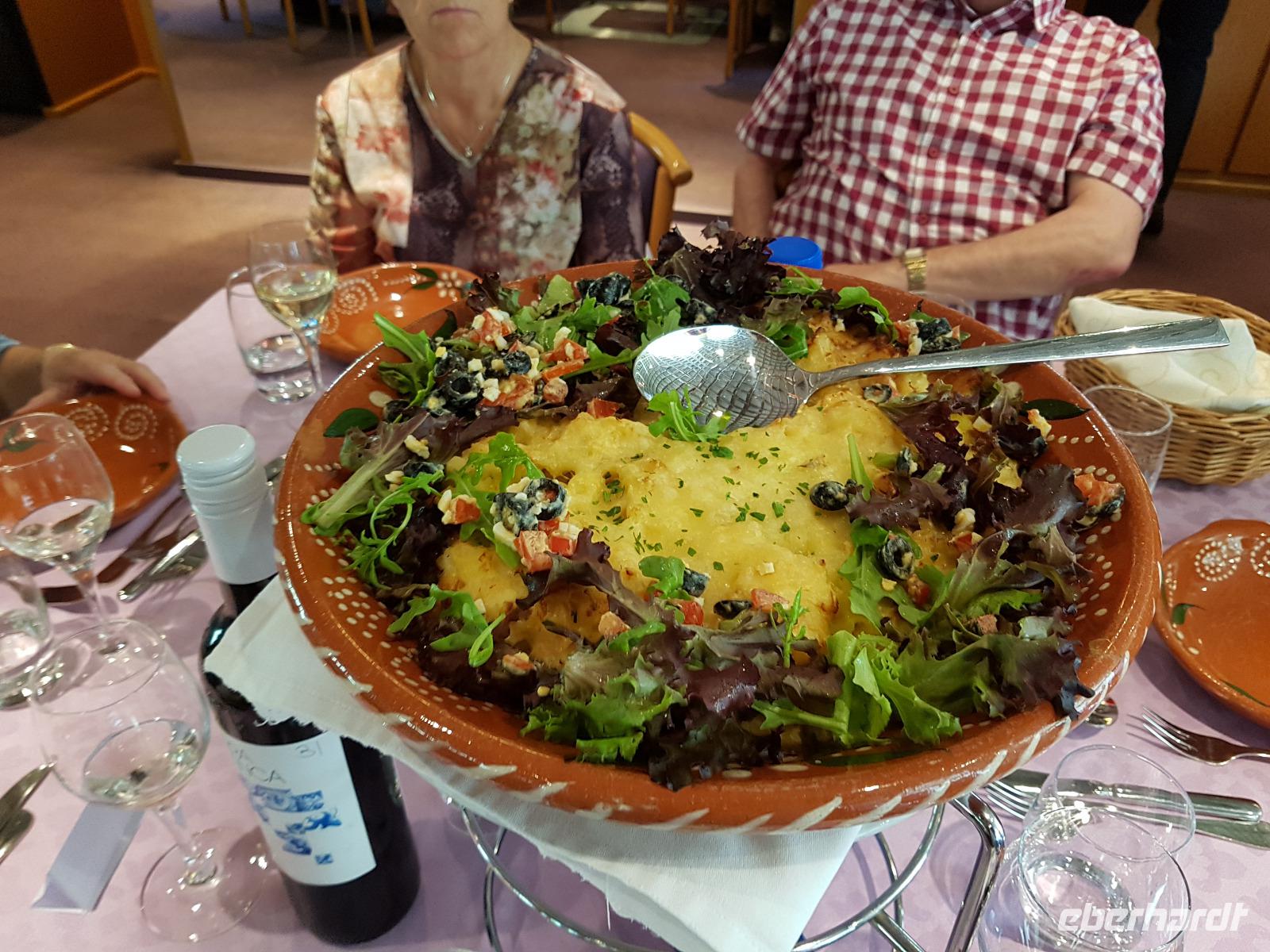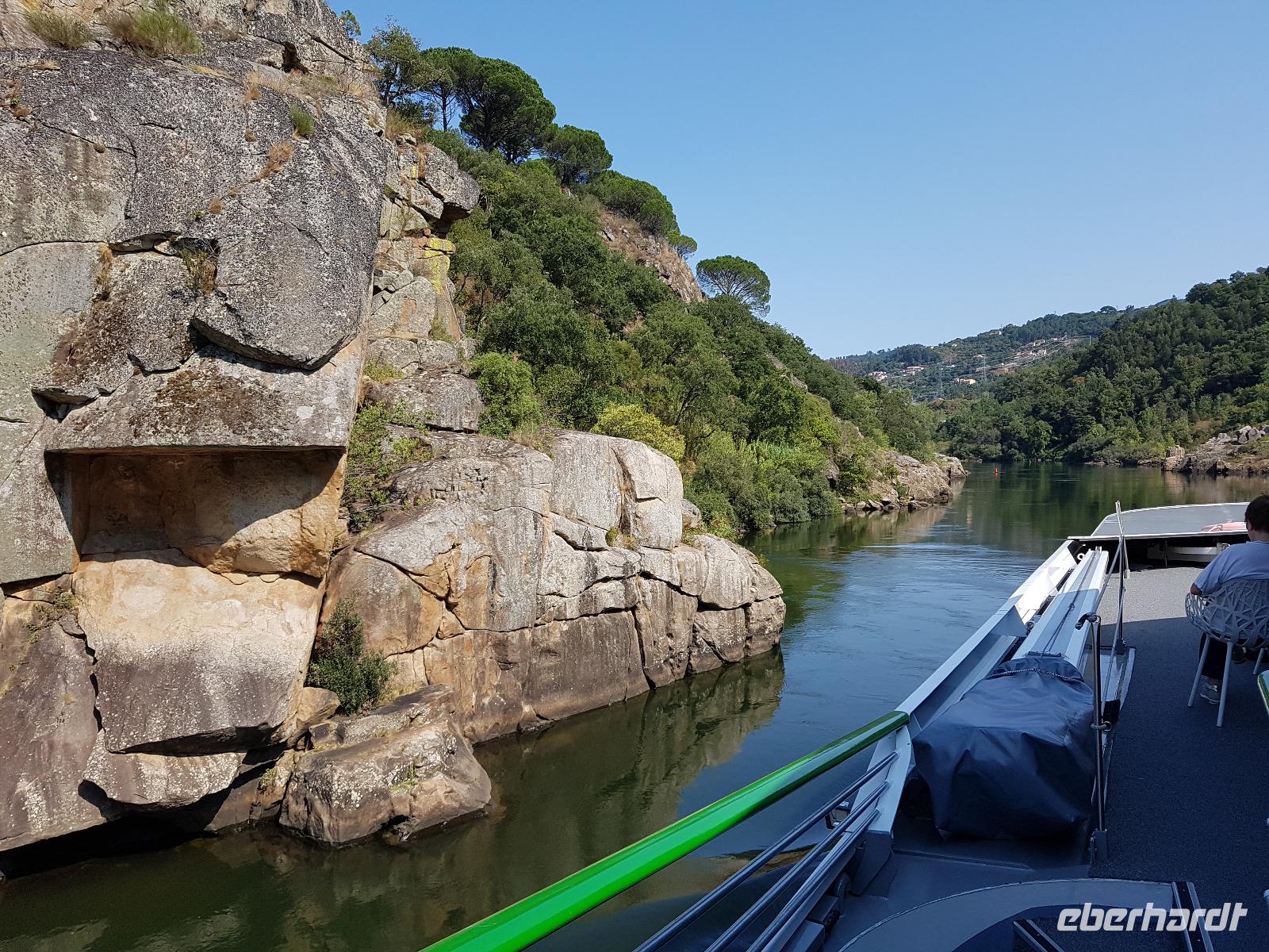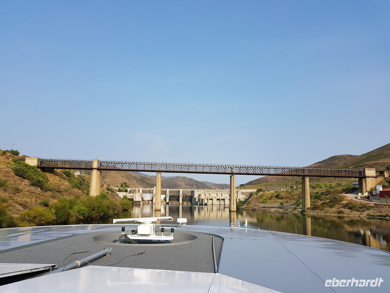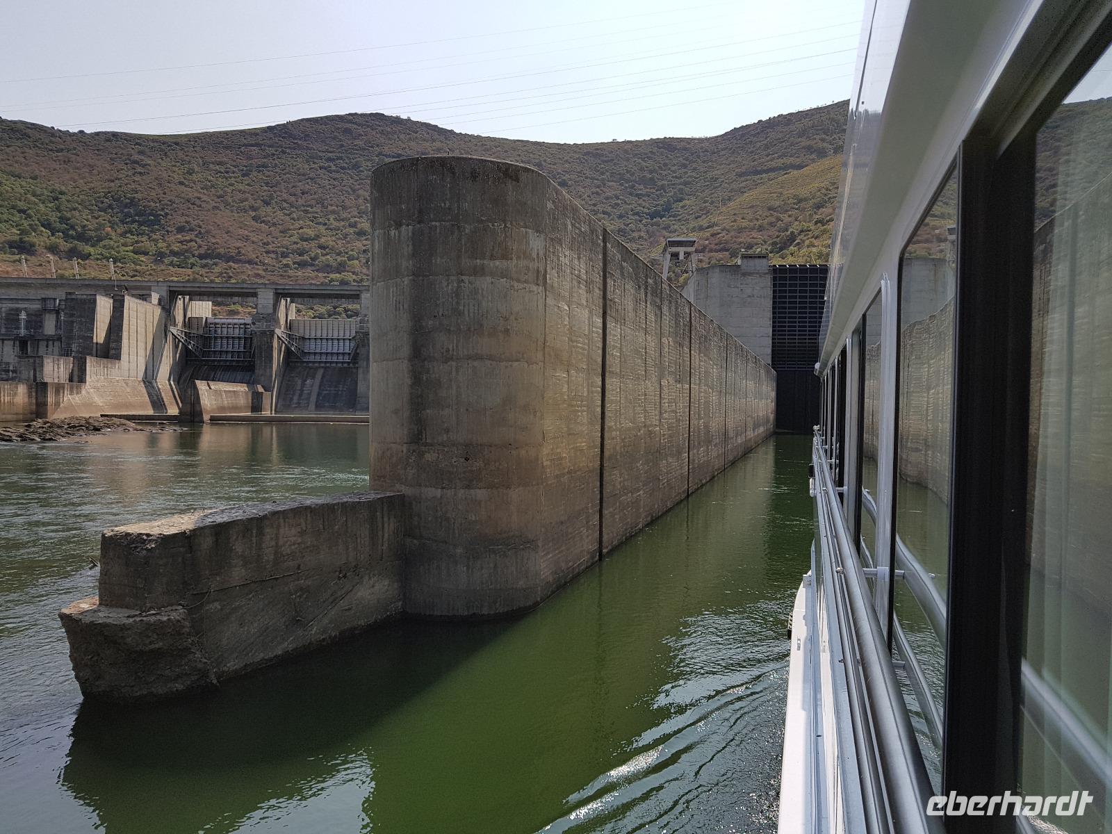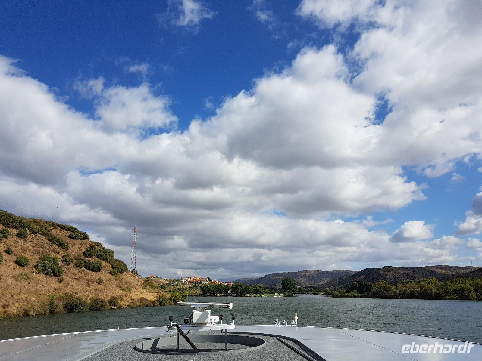 Weiter fuhren wir mit dem Bus nach Vila Real und dort lud man uns in ein Cafe ein, um die regionale Spezialität "Hahnenkamm" mit einem Kaffee zu probieren. In der Freizeit besuchten wir die Kathedrale und eine kleine barocke Kirche und hatten Gelegenheit, einzukaufen. Auf der Rückreise kamen wir in Vila Real bei der schwarzen Töpferei vorbei, das neueste Objekt mit UNESCO Welttitel in der Region. Unser Schiff war in der Zwischenzeit weiter gefahren und so gingen wir in Vega de Terron wieder an Bord. Heute war portugisischer Tag, der Speisesaal mit der Fahne geschmückt und das Personal servierte uns Spezialitäten aus ihrer Heimat. Nach dem Mittagessen folgten noch 2 Staudämme mit Schleusen und die Crew war bemüht, die Gäste mit Quizzspielen und Animation in der Bar zu unterhalten. Nach dem Abendessen trafen wir uns alle in der Bar und bestaunten bei der Crew Show die Talente der Kellner, Matrosen, der Zahlmeisterin usw. Unser Schiff hatte die portugisisch-spanische Grenze erreicht und lag über Nacht in Spanien.
