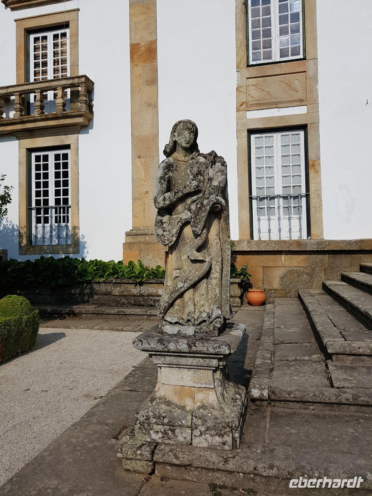 Nach dem Frühstück begann der Ausflug nach Vila Real. Anna Paula, aufgewachsen in Köln, begleitete uns und berichtete sehr ausführlich über den Weinanbau im Dourotal. Wir nutzten die erst 2016 fertiggestellte Autobahn 4, die uns fantastische Ausblicke ins Dourotal und zu den Gebirgskämmen bot. Im Palast von Mateus gingen wir in kleinen Gruppen von nur 10 Personen durch die noch sehr gut erhaltenen Räume, ausgestattet mit wertvollen Möbeln und Sammlerstücken. Der angrenzende Park lud danach zu einem Spaziergang ein. Auf diesem Ausflug war unsere Gruppe komplett unterwegs - eine gute Gelegenheit für ein Gruppenfoto.