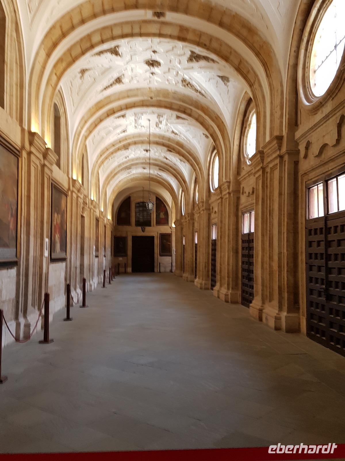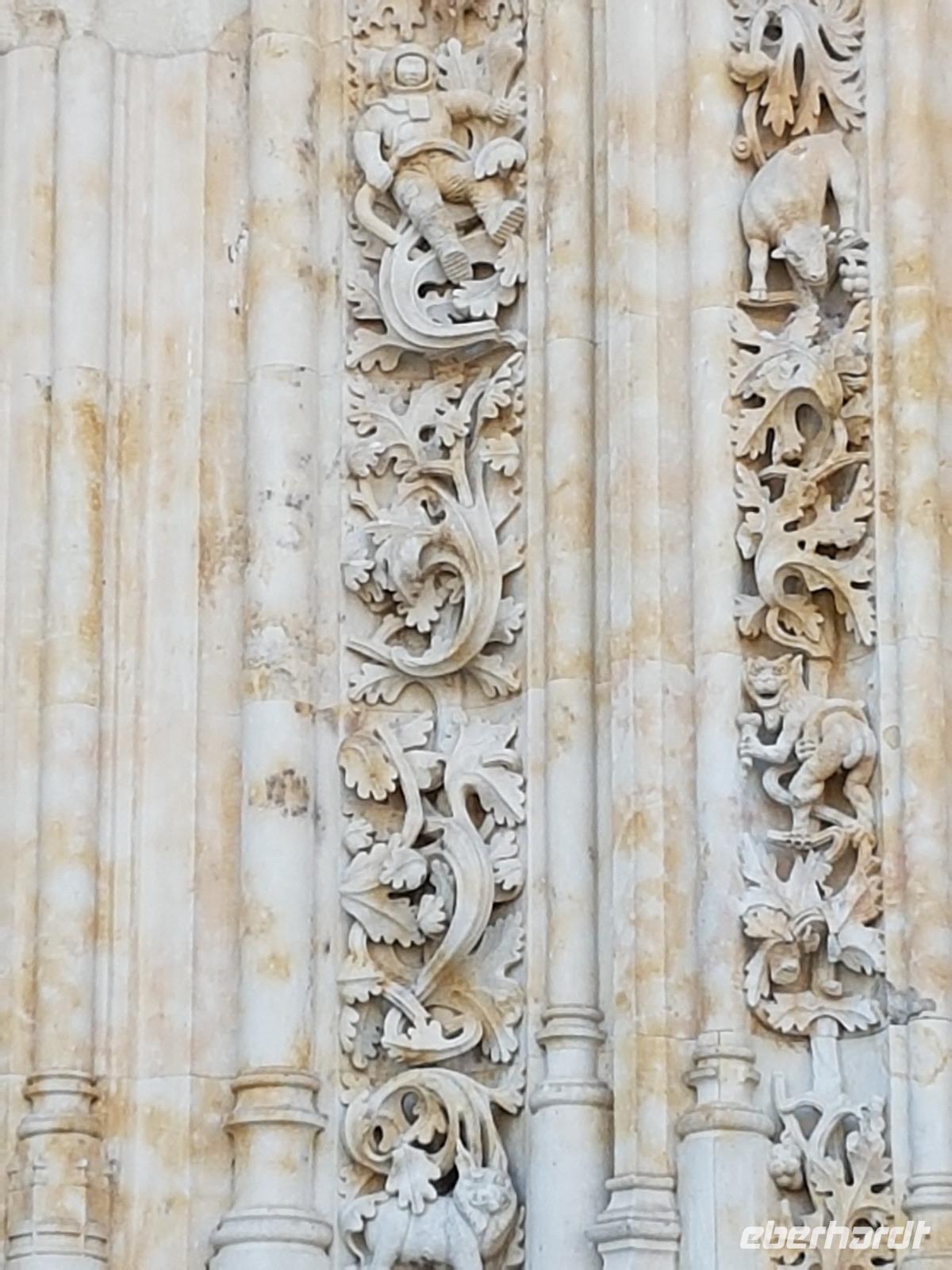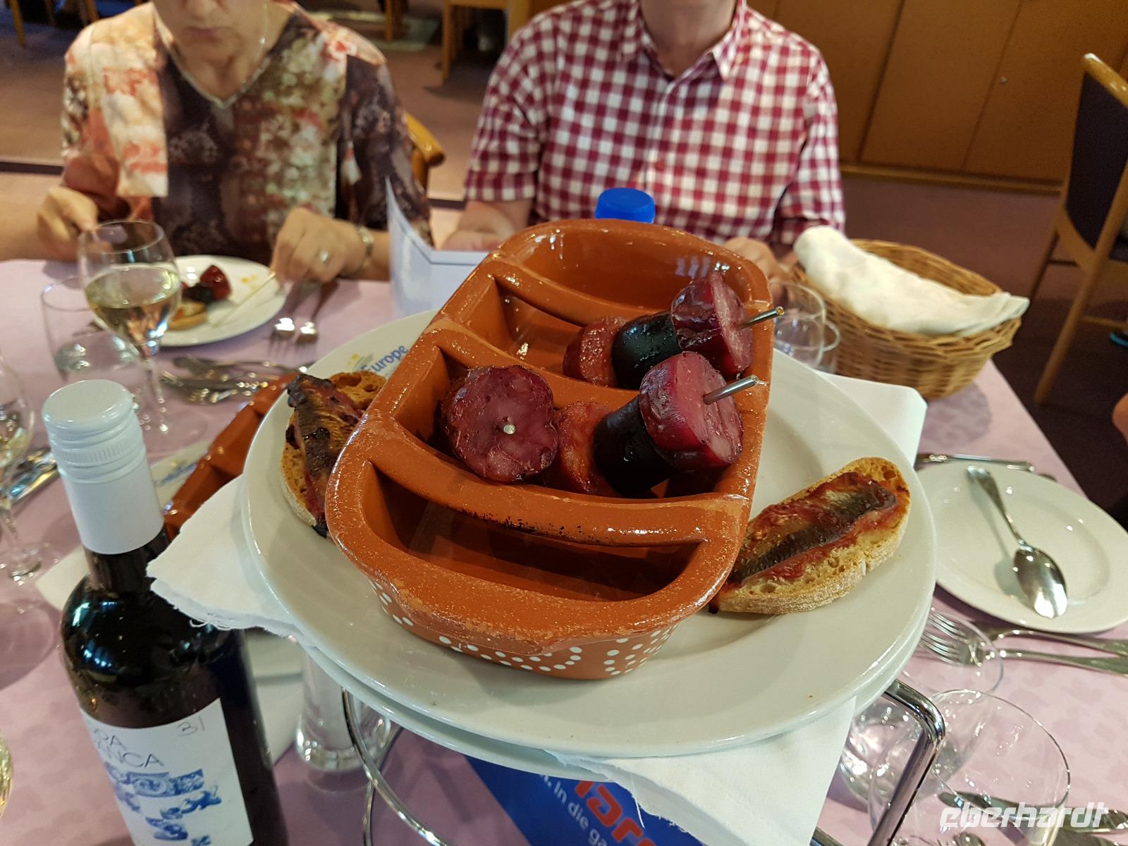 Früher als sonst fuhren wir ab mit dem Bus begleitet von Susanne und Teresa - 2 gute Geister der Rezeption. Unterwegs bekam jeder einen Stadtplan von Salamanca, wo alle wichtigen Stationen unserer Besichtigung und die Treffpunkte mit Uhrzeiten eingezeichnet waren - eine perfekte Vorbereitung. In Salamanca dann erwartete unsere kleine Gruppe eine deutschsprachige Führerin, die mit uns einen schönen Rundgang machte. Es war Sonntag und die Stadtbewohner feierten ihr wichtigstes Fest der Madonna von Bega gewidmet. Auf dem Plaza Mayor begann gerade der Rundgang der Prominenz in Richtung Kathedrale. Wir spazierten weiter durch die Innenstadtgassen zur alten Universität, wo wir am Portal den berühmten Frosch auf einem Totenkopf finden mußten. Die Innenräume der alten Universität sind im Kreuzgang angeordnet und wir besichtigten sie einschließlich der Kapelle. Unser Mittagessen nahmen wir im Muschelhaus ein und danach war Freizeit. Wir stiegen auf die beiden Türme der ehemaligen Jesuitenkirche, besuchten danach die neue und alte Kathedrale und ganz zum Schluß das Art Deco Museum. Es war ein sehr schöner Ausflug mit perfekter Organisation. Auf dem Schiff ging es spanisch weiter mit dem Abendessen und einer Flamenco Show in der Bar.