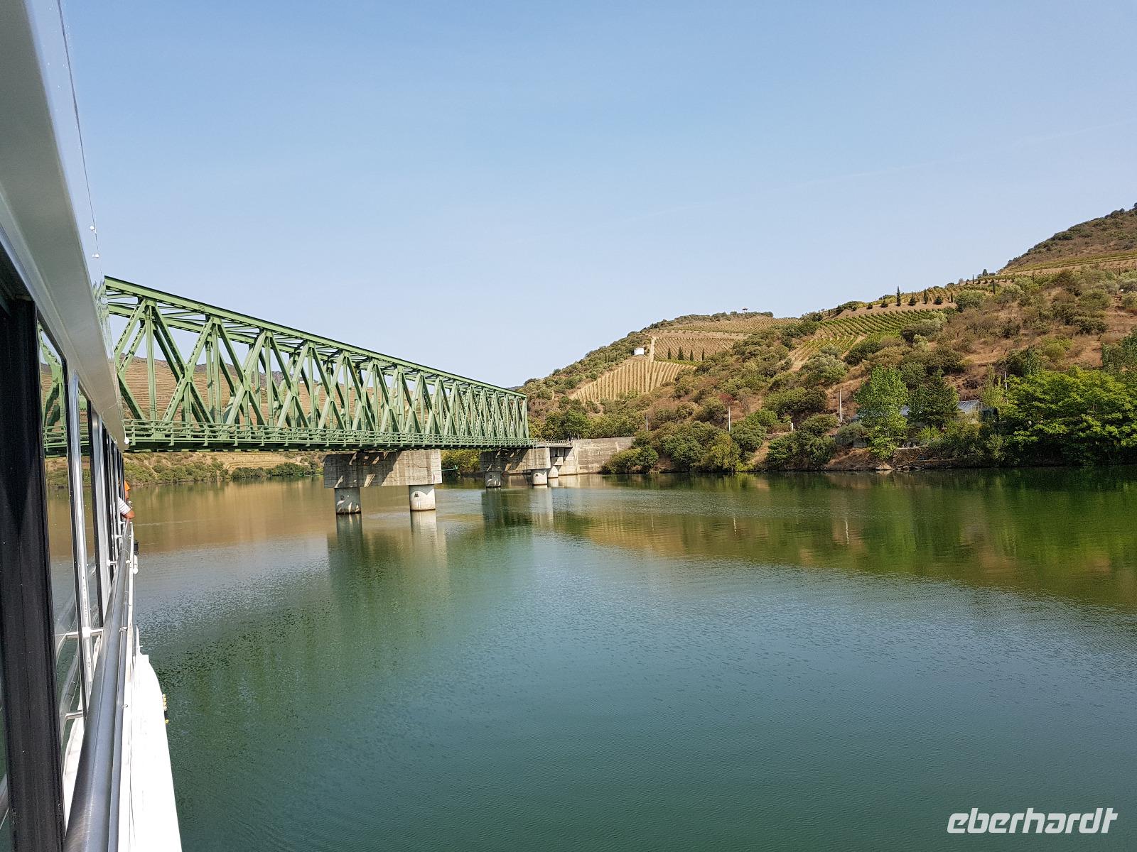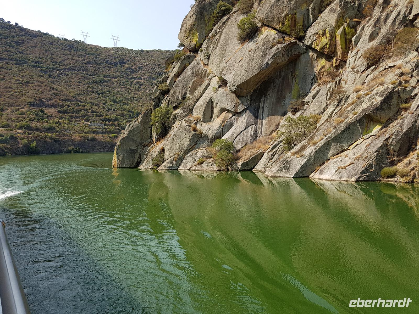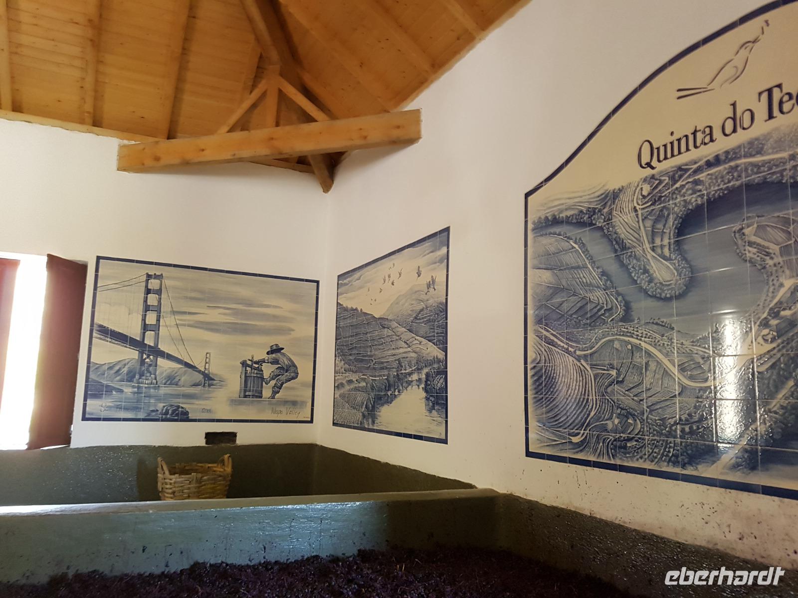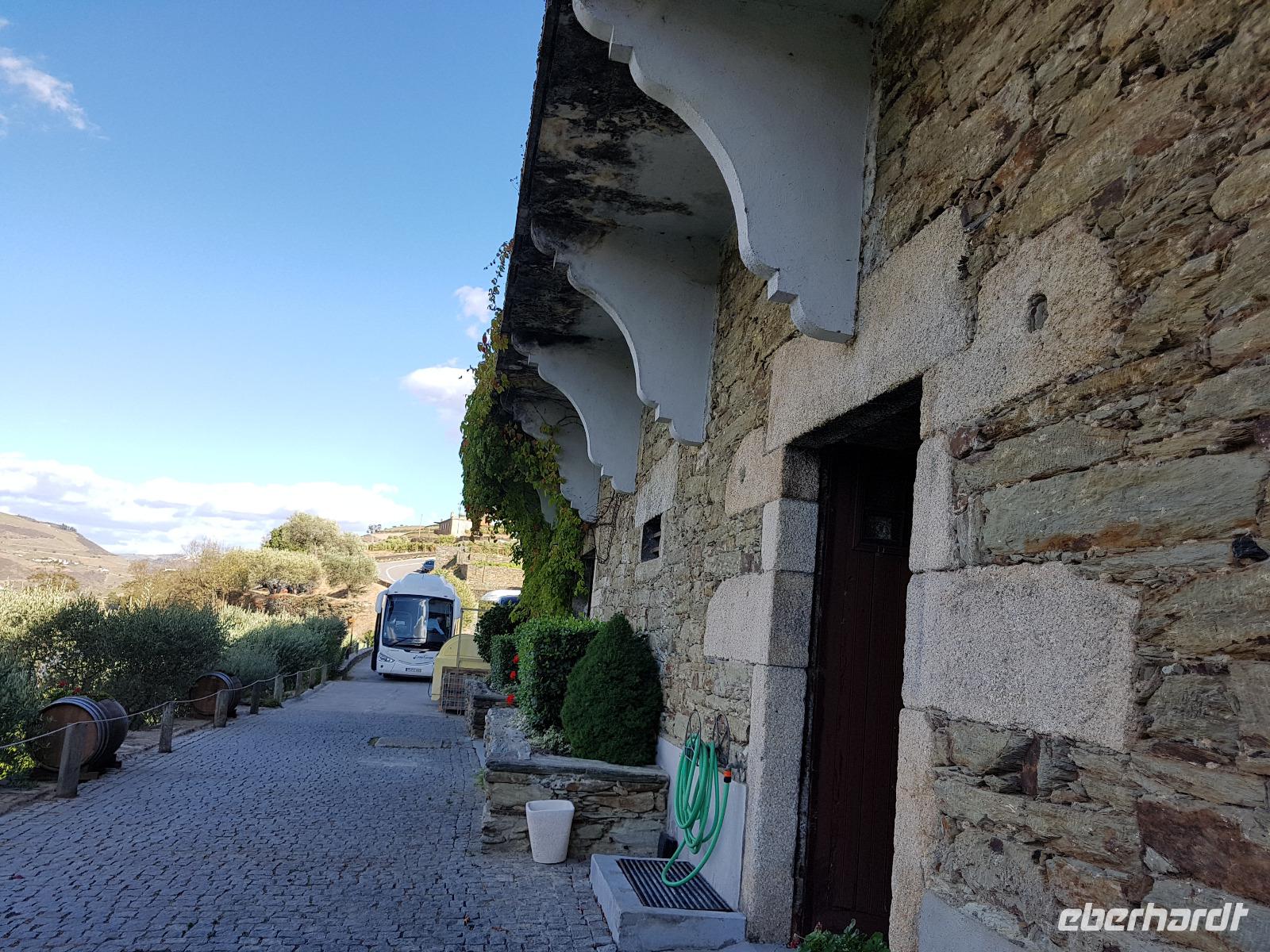 Das Frühstück gab es später, weil der Vormittag gemütlich an Bord verbracht wurde. Für Bewegung sorgte die Crew beim Frühsport auf dem Sonnendeck und danach gab es wieder ein Quizz und einen weiteren Staudamm mit Schleuse. Nach dem Mittagessen begann dann der Ausflug zur Portweinstrasse. Er wurde von Adelia begleitet, die auch in Deutschland gelebt hatte und sehr gut zu verstehen war. Wir fuhren mit dem Bus steil bergan auf 500 m Höhe zu einem Aussichtspunkt und dann weiter auf 700 m nach Sao Joao de Pesqueira vorbei an vielen Mandelbäumen, Korkeichen und Olivenhainen. Dieser kleine Ort war ganz zauberhaft und der Rundgang zum Hauptplatz und durch die Katzenstrasse sehr interessant. Die Einwohnerinnen boten viele regionale Produkte an. Weiter ging unsere Fahrt durch die steilen Weinberge und Adelia berichtete über die Weinernte, die Quoten, die jährlich festgelegt werden, die verschiedene Anordnung der Rebstöcke und die Rebsorten. Es boten sich Ausblicke bis hinunter zum Douro und dort lag an einem Nebenfluß die Portweinkellerei Quinta do Tedo, die wir besuchten. Die Besitzer haben sich dem biologischen Weinanbau verschrieben und so werden die Trauben auch noch ganz traditionell mit den Füßen getreten, um den Saft zu gewinnen. Wir probierten rote Portweine und einen Rose und durften auch frische Trauben verkosten. Mit dem Bus ging es zurück nach Pinhao, wo unser Schiff lag. Zuvor besuchten wir aber noch den Bahnhof mit seinen wunderschönen blauweißen Kacheln.