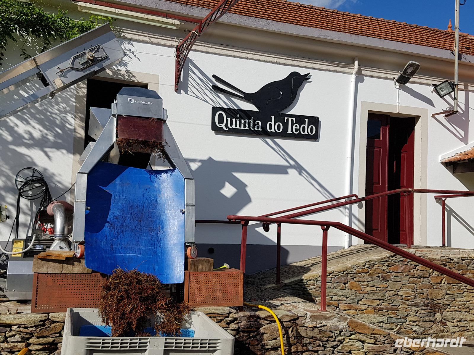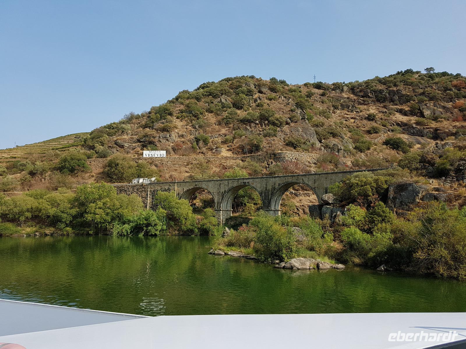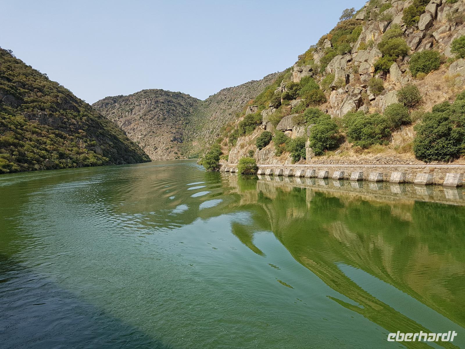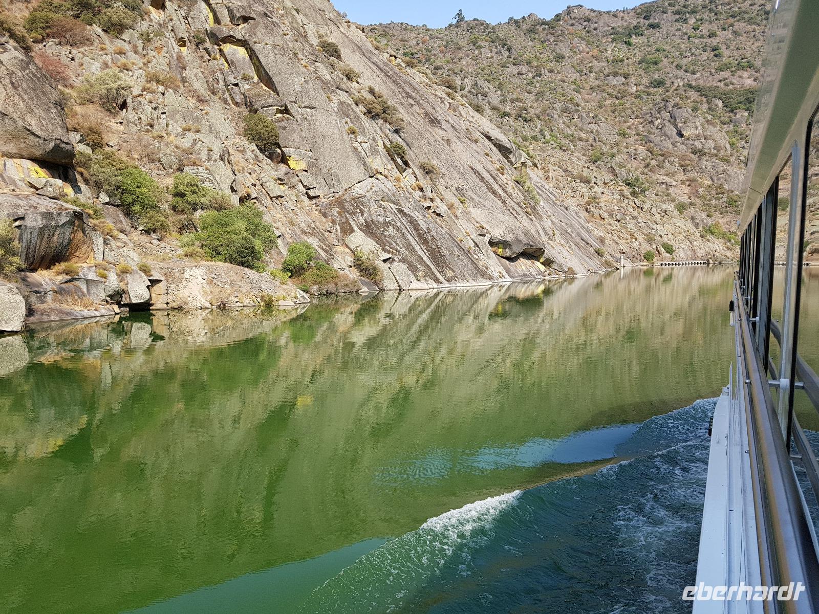 Das Frühstück gab es später, weil der Vormittag gemütlich an Bord verbracht wurde. Für Bewegung sorgte die Crew beim Frühsport auf dem Sonnendeck und danach gab es wieder ein Quizz und einen weiteren Staudamm mit Schleuse. Nach dem Mittagessen begann dann der Ausflug zur Portweinstrasse. Er wurde von Adelia begleitet, die auch in Deutschland gelebt hatte und sehr gut zu verstehen war. Wir fuhren mit dem Bus steil bergan auf 500 m Höhe zu einem Aussichtspunkt und dann weiter auf 700 m nach Sao Joao de Pesqueira vorbei an vielen Mandelbäumen, Korkeichen und Olivenhainen. Dieser kleine Ort war ganz zauberhaft und der Rundgang zum Hauptplatz und durch die Katzenstrasse sehr interessant. Die Einwohnerinnen boten viele regionale Produkte an. Weiter ging unsere Fahrt durch die steilen Weinberge und Adelia berichtete über die Weinernte, die Quoten, die jährlich festgelegt werden, die verschiedene Anordnung der Rebstöcke und die Rebsorten. Es boten sich Ausblicke bis hinunter zum Douro und dort lag an einem Nebenfluß die Portweinkellerei Quinta do Tedo, die wir besuchten. Die Besitzer haben sich dem biologischen Weinanbau verschrieben und so werden die Trauben auch noch ganz traditionell mit den Füßen getreten, um den Saft zu gewinnen. Wir probierten rote Portweine und einen Rose und durften auch frische Trauben verkosten. Mit dem Bus ging es zurück nach Pinhao, wo unser Schiff lag. Zuvor besuchten wir aber noch den Bahnhof mit seinen wunderschönen blauweißen Kacheln.