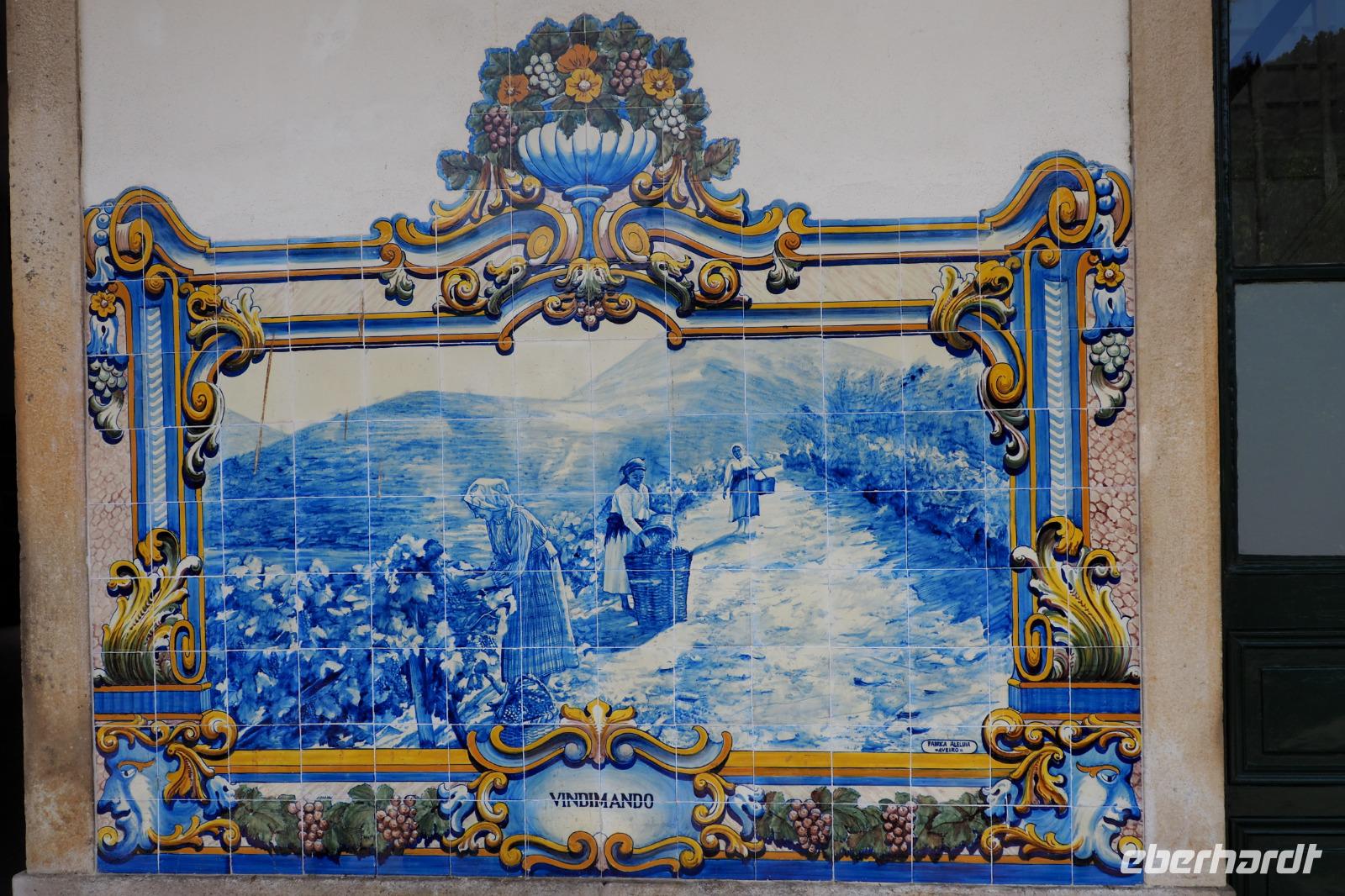 Hier in Pinhão beginnt das Portwein-Gebiet. Auf den vielen Fliesen, die den Bahnhof schmücken, waren alle Themen rund um den Wein dargestellt. Beginnend mit dem Anbau über die Ernte bis zur Verarbeitung und Lagerung in den Fässern und nicht zu vergessen der Transport. Eine anschauliche Darstellung des gesamten Prozesses war auf diesen wunderbaren Wandfliesen zu sehen.