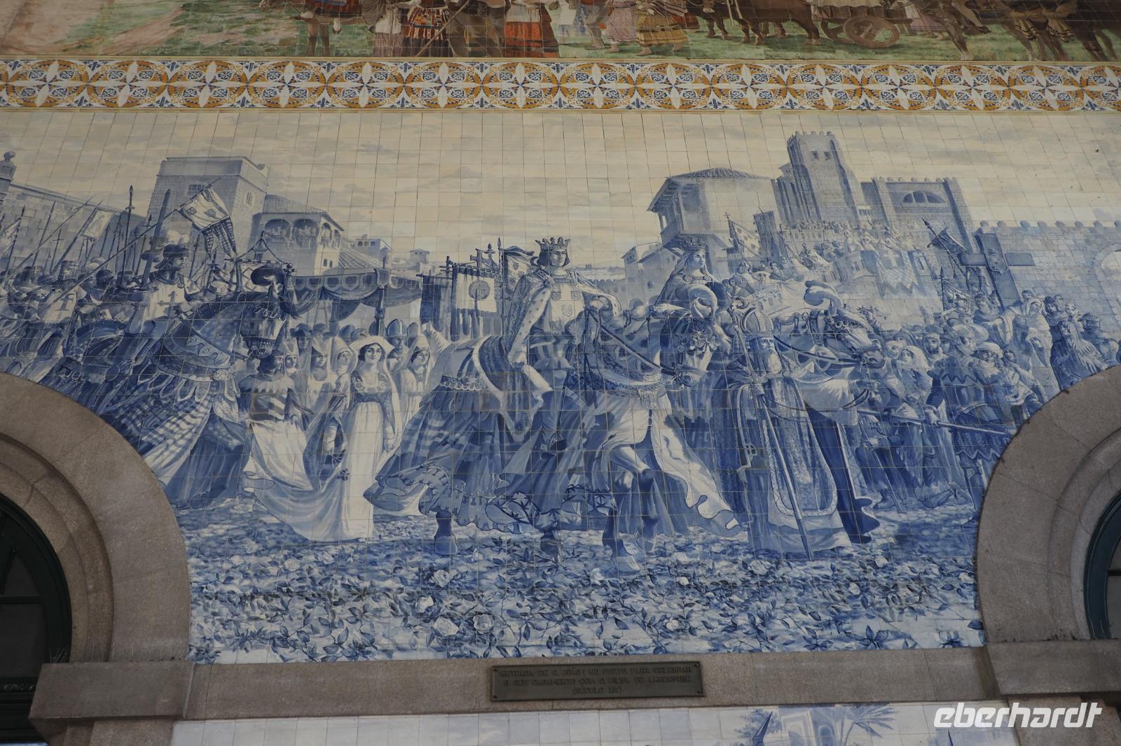 Zu Fuß ging es zum nahen Bahnhof. Wer hätte geahnt, dass dieser Bahnhof nicht nur ein einfacher Ab- und Ankunftsort für viele Menschen ist, sondern mit ca. 20.000 blau-weißen Azulejos aufwartet. Diese Fliesen erzählen viele Geschichten, u. a. die Geschichte Portugals. Ein unglaublicher Anblick!