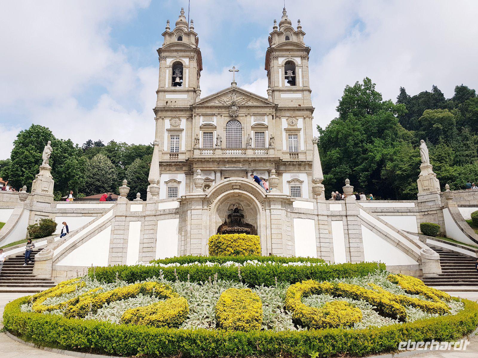 Gleich außerhalb der Stadt erwartet uns ein weiteres Highlight des Tages: Es erhebt sich die prachtvolle, viel besuchte Kirche Bom Jesus do Monte auf einem Hügel. Bom Jesus ist Jahr für Jahr das Ziel von unzähligen Pilgern und eines der bekanntesten Wahrzeichen Portugals. Sie liegt 5 km östlich von Braga. Wir nehmen die Zahnradbahn. Man kann auch den Leidensweg Christi über die steinigen Stufen nach oben nehmen. Wer die Treppe wählt, wird aber auf jeden Fall belohnt. Die Escadaria dos Cinco Sentidos (Treppe der Fünf Sinne) wartet mit allerlei Springbrunnen auf. Wasser sprudelt aus Ohren, Augen, Nasen und Mündern der zahlreichen Statuen. Nach der Besichtigung hol uns der Bus ab und wir fahren zurück nach Porto an.
