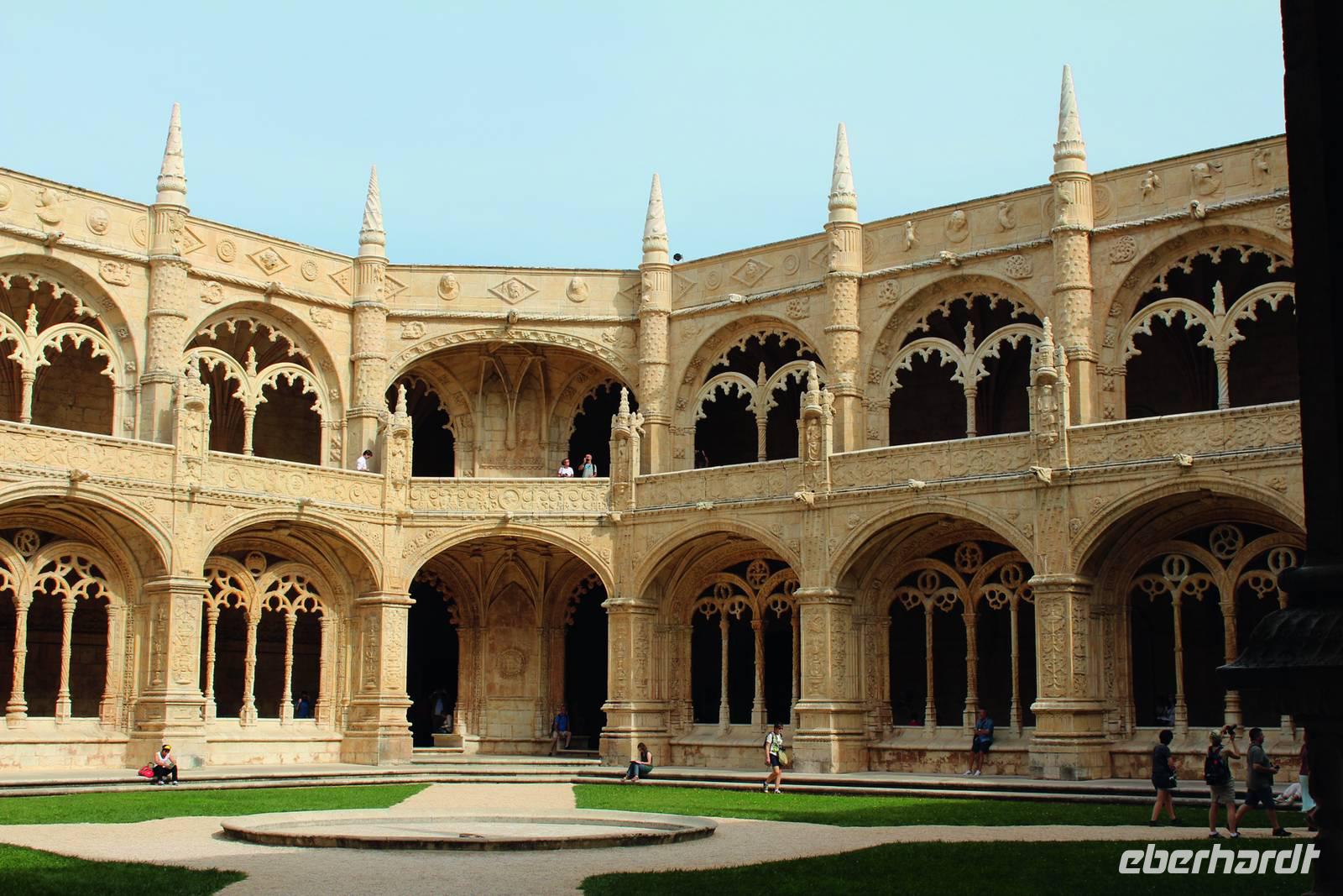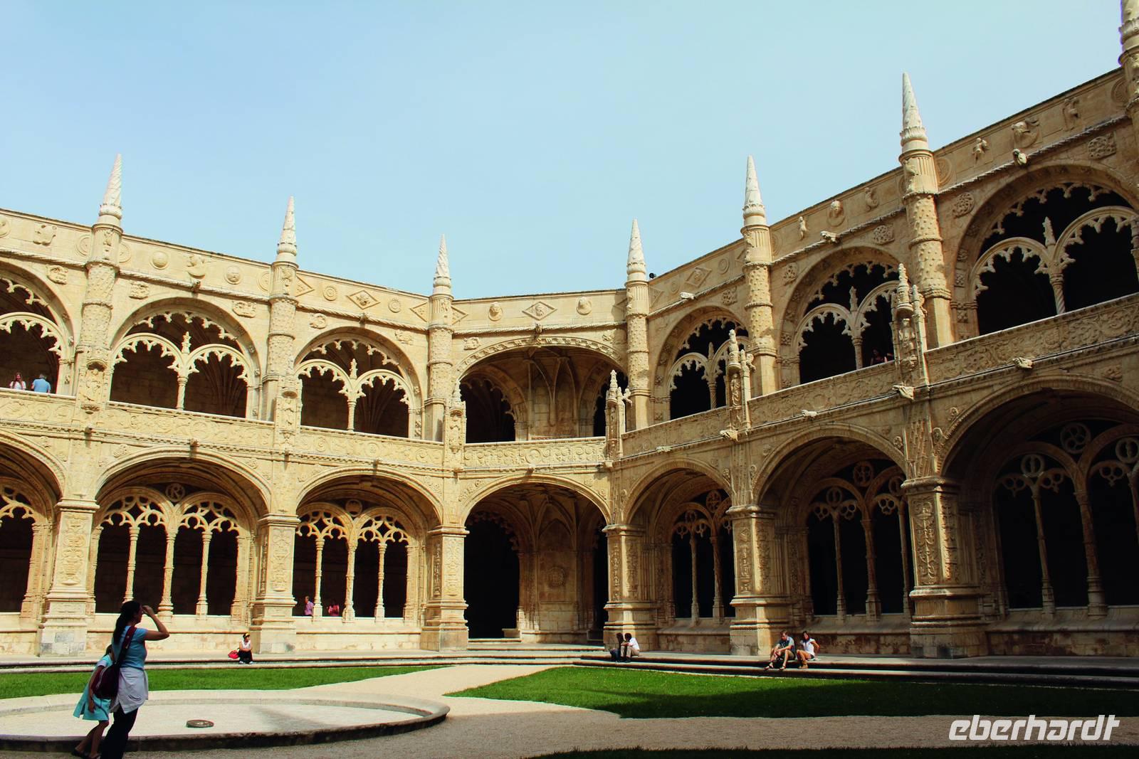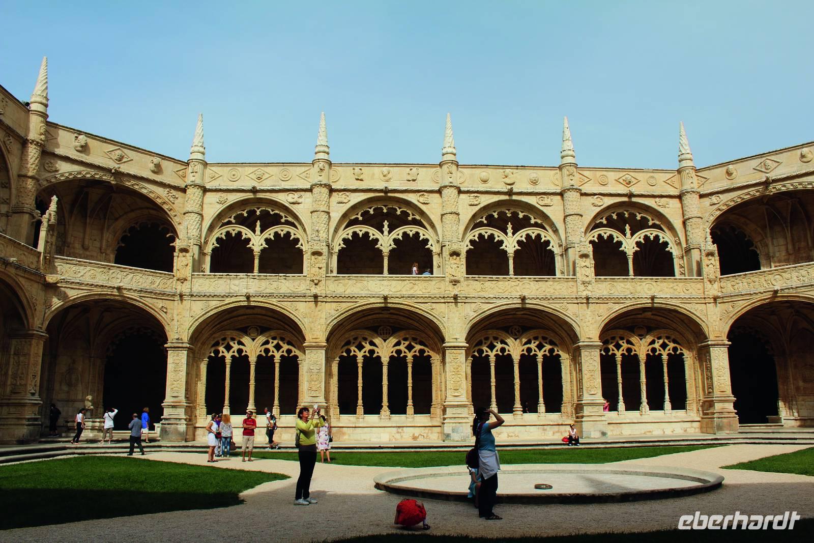 Am nächsten Morgen nach dem Frühstück wartete Margarida bereits auf uns und wir starteten unsere erste Standrundfahrt durch Lissabon. Unser erster Stopp war eine spontane Eingebung von Margarida, die uns am Parque Eduardo einen Blick über Lissabon zeigte. Weiter ging es mit dem Bus in den Stadtteil Belem, stets versorgt mit Informationen über Lissabon von Margarida. Wir hielten zunächst für einen kurzen Fotostopp am Torre de Belem, einem wunderschönen kleinen Turm am Ufer des Tejos. Dann ging es weiter zum Hieronymus-Kloster, was nicht nur von außen betrachtet sehr faszinierend ist, sondern auch innen eine wahnsinnig schönen Innenhof zu bieten hat. Nachdem wir die schöne filigrane Struktur des Klosters auf eigene Faust erkunden und bewundern durften, wartete Margarida am Bus auf uns mit den süßen "Pasteis de Belem", den himmlischen portugiesischen Puddingtörtchen, die wir kosten durften. Dies führte dazu, dass vor allem ich mir die Tage darauf einige von diesen Törtchen gönnte. Unsere Busfahrt ging weiter zum Zentrum von Lissabon, wo wir Zeit zum Spazieren und Mittagessen hatten - und natürlich für noch ein Puddingtörtchen. Von da aus spazierten wir zur Burg Sao Jorge indem wir unter anderem Aufzüge (die sogenannten Elevador Castelo) nahmen, um ein paar Straßen weiter höher zu gelangen. Wir genossen den Ausblick auf die Stadt, den wir von der Burg aus hatten und spazierten eine weile dort rum. Rückzugs führte uns Margarida weit ab vom üblichen Tourismusgebiet durch enge Gassen mit kleinen Lokale und alten Häusern, vor denen die alten Frauen sitzen und den neusten Tratsch austauschen zurück zum Bus. Erschöpft von den warmen Temperaturen und dem etwas längeren Spaziergang, sind wir am Bus angelangt und waren froh über eine kleine Pause im Hotel, bevor es wieder zum Abendessen ins Restaurant Colina ging. Auch dies mal wurden wir reichlich bedient und bekocht.