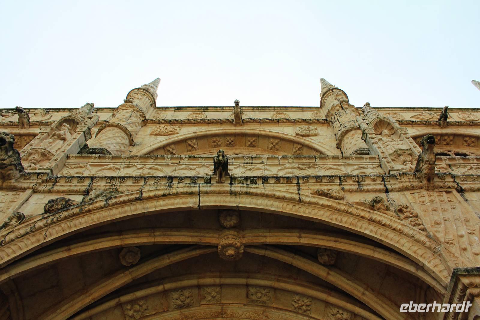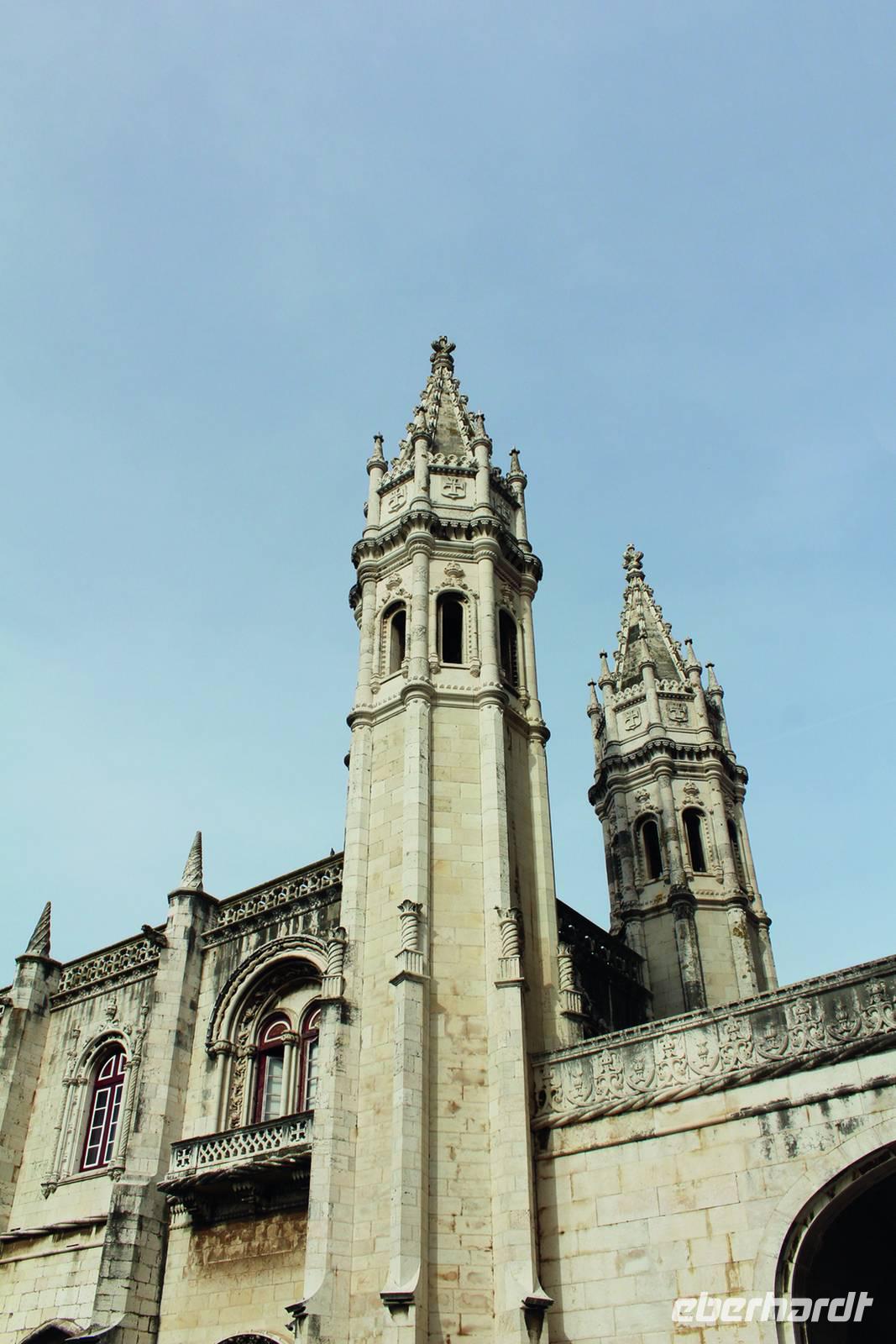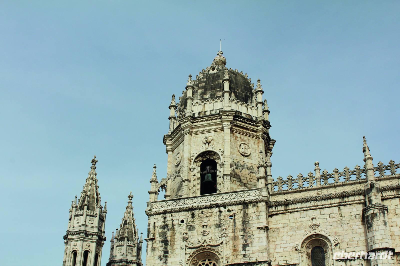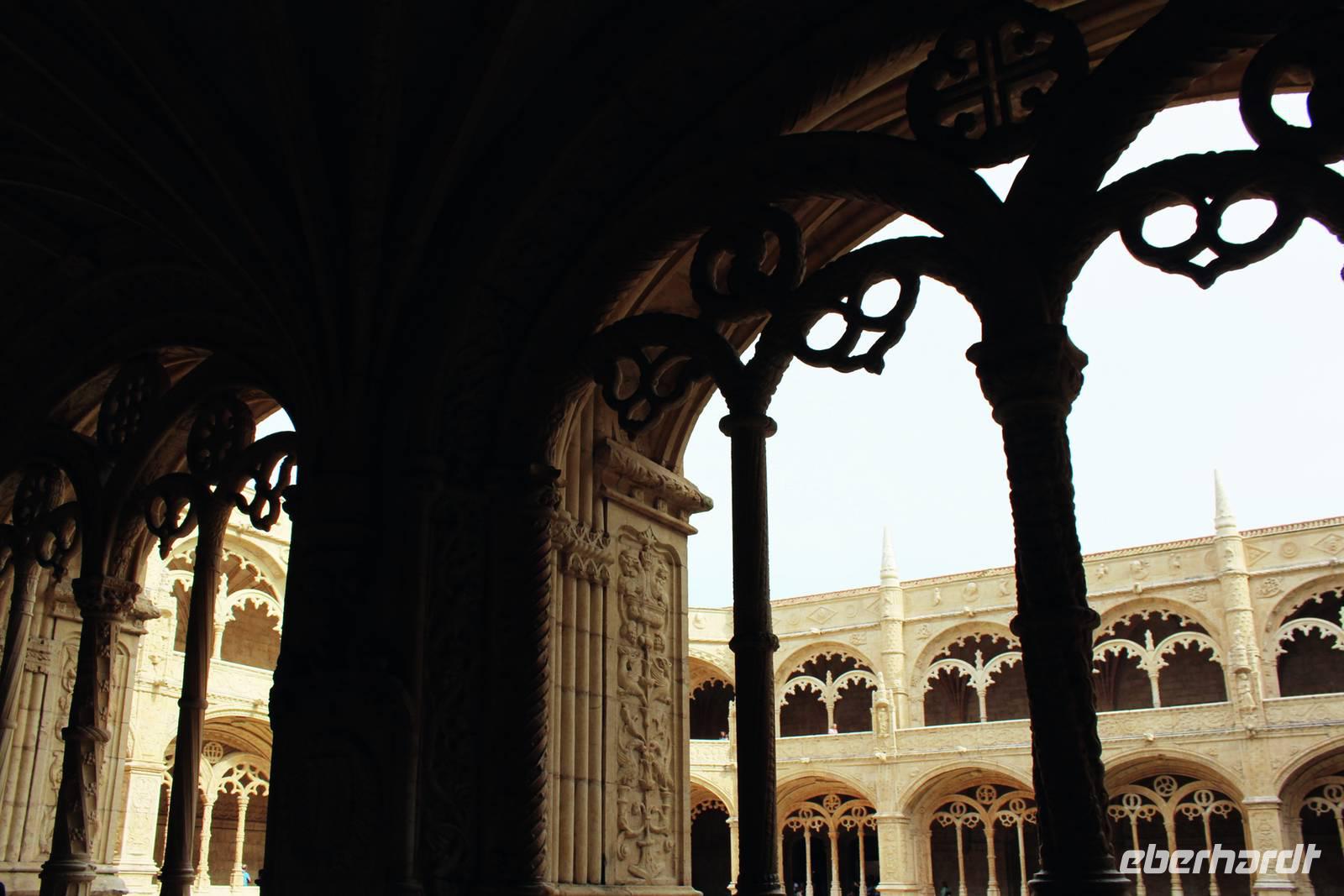 Am nächsten Morgen nach dem Frühstück wartete Margarida bereits auf uns und wir starteten unsere erste Standrundfahrt durch Lissabon. Unser erster Stopp war eine spontane Eingebung von Margarida, die uns am Parque Eduardo einen Blick über Lissabon zeigte. Weiter ging es mit dem Bus in den Stadtteil Belem, stets versorgt mit Informationen über Lissabon von Margarida. Wir hielten zunächst für einen kurzen Fotostopp am Torre de Belem, einem wunderschönen kleinen Turm am Ufer des Tejos. Dann ging es weiter zum Hieronymus-Kloster, was nicht nur von außen betrachtet sehr faszinierend ist, sondern auch innen eine wahnsinnig schönen Innenhof zu bieten hat. Nachdem wir die schöne filigrane Struktur des Klosters auf eigene Faust erkunden und bewundern durften, wartete Margarida am Bus auf uns mit den süßen "Pasteis de Belem", den himmlischen portugiesischen Puddingtörtchen, die wir kosten durften. Dies führte dazu, dass vor allem ich mir die Tage darauf einige von diesen Törtchen gönnte. Unsere Busfahrt ging weiter zum Zentrum von Lissabon, wo wir Zeit zum Spazieren und Mittagessen hatten - und natürlich für noch ein Puddingtörtchen. Von da aus spazierten wir zur Burg Sao Jorge indem wir unter anderem Aufzüge (die sogenannten Elevador Castelo) nahmen, um ein paar Straßen weiter höher zu gelangen. Wir genossen den Ausblick auf die Stadt, den wir von der Burg aus hatten und spazierten eine weile dort rum. Rückzugs führte uns Margarida weit ab vom üblichen Tourismusgebiet durch enge Gassen mit kleinen Lokale und alten Häusern, vor denen die alten Frauen sitzen und den neusten Tratsch austauschen zurück zum Bus. Erschöpft von den warmen Temperaturen und dem etwas längeren Spaziergang, sind wir am Bus angelangt und waren froh über eine kleine Pause im Hotel, bevor es wieder zum Abendessen ins Restaurant Colina ging. Auch dies mal wurden wir reichlich bedient und bekocht.