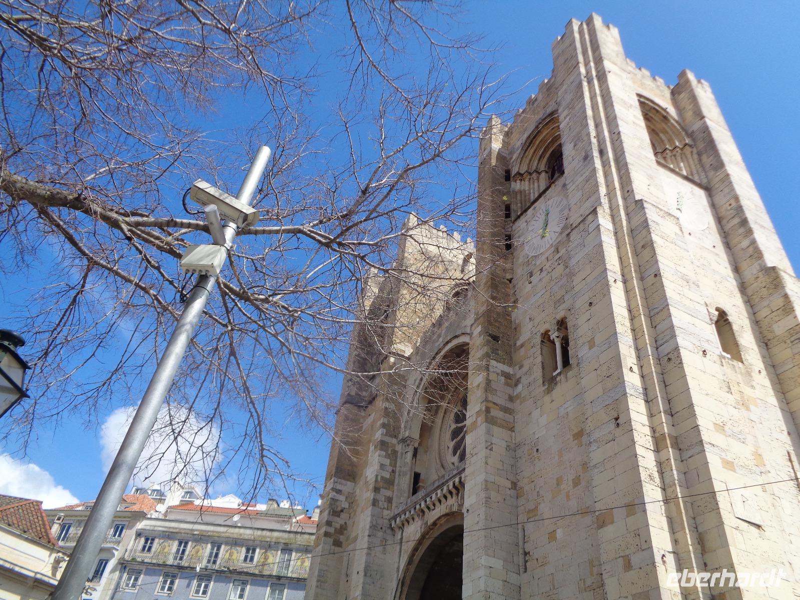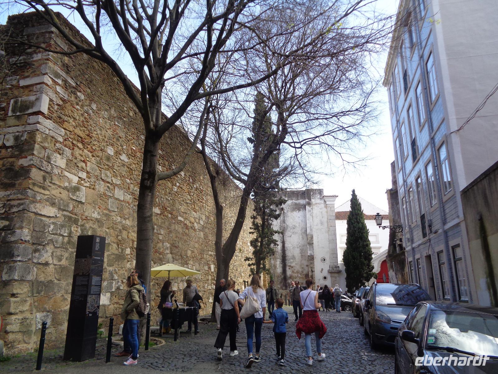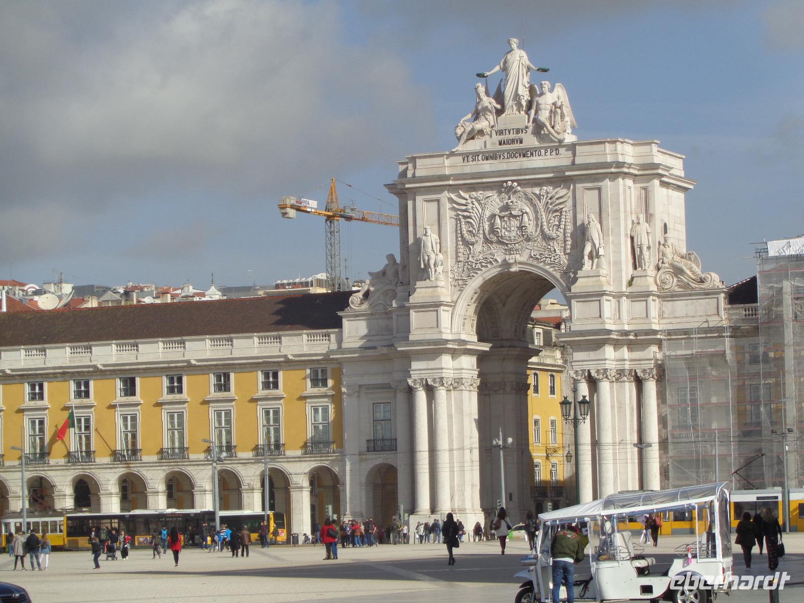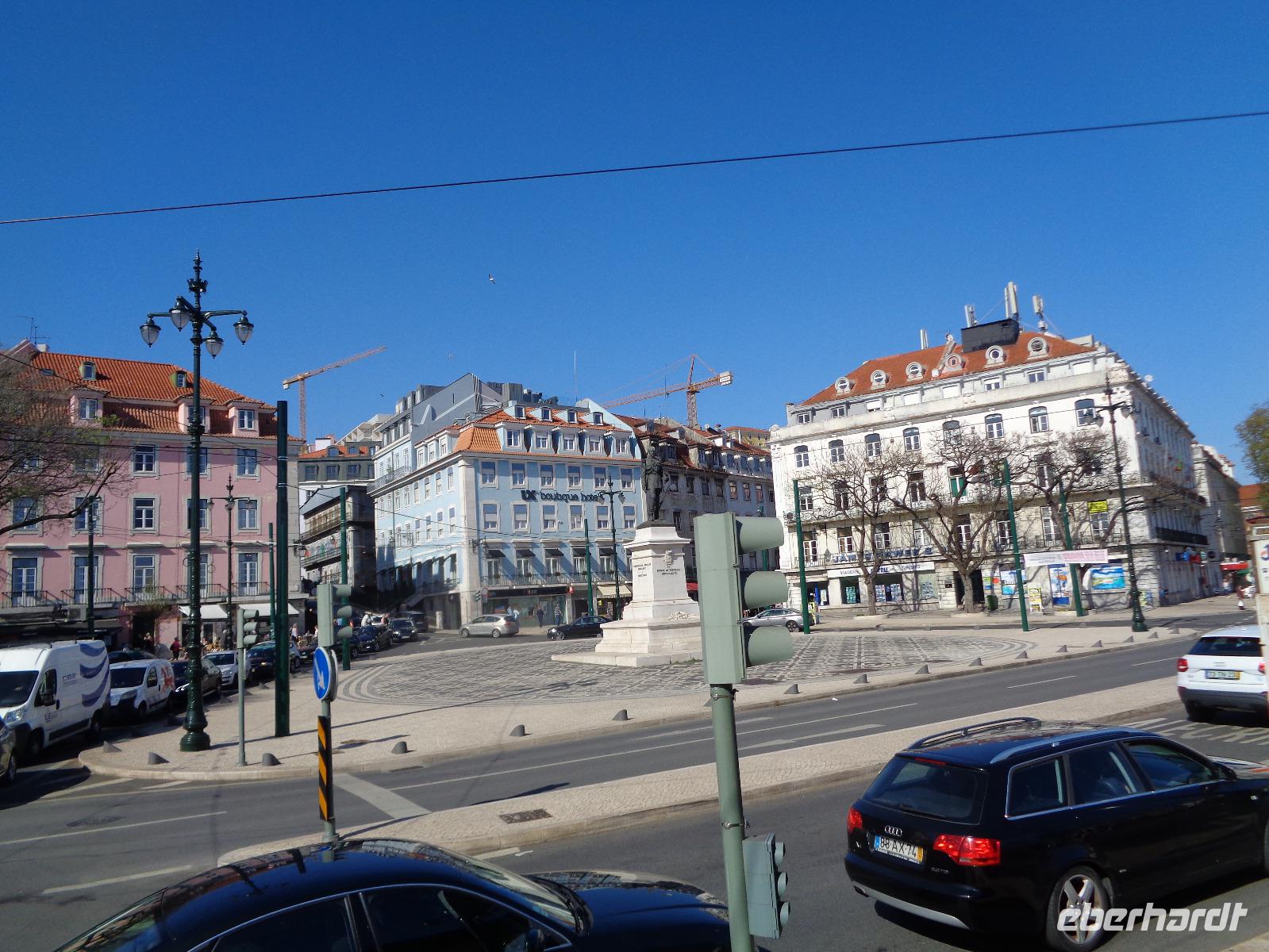 Pünktlich nach unserem reichhaltigen Frühstück erwartet uns Isabel zu unserem Stadtrundgang. Ausgerüstet mit Stadtplan und Metro-Ticket fahren wir ab Station Sao Sebastiao bis zum Tejo und beginnen unseren Aufstieg zur Burg Sao Jorge am wunderschönen Königsplatz Praca do Comércio. Teils zu Fuß, teils mit Aufzügen, erreichen wir das Castelo, ein Wahrzeichen von Lissabon. Da Isabel schon unsere Eintrittskarten hat, können wir wieder an den Wartenden vorbeiziehen und Isabel erläutert uns Geschichte und Bedeutung der alten Burg. Wir treffen hier wieder auf ein sehr gelungenes Denkmal von König Manuel I. Von hier oben genießen wir den wunderschönen Ausblick auf die erwachende Hauptstadt und den Tejo. Nach der Besichtigung lädt uns Isabel ins Café ein und ich spendiere noch ein Pastetchen dazu. Gestärkt ziehen wir weiter durch den Stadtteil Alfama mit seinem ursprünglichen Charme. Am Abend kann man hier nette kleine Restaurants und Bars finden und immer wieder Fado in allen Facetten. Wir spazieren bis zur Statue des heiligen Vinzenz, der nach seinem Martyrium und Tod im 4. Jahrhundert zur Zeit der Christenverfolgung unter Kaiser Diokletian als Heiliger verehrt wurde. Letztendlich wurden seine Gebeine, begleitet von 2 Raben, im Jahre 1160 von Valencia nach Lissabon überführt. Er gilt als Schutzpatron Portugals und sein Feiertag als die Mitte des Winters. Zurück geht es über kleine Treppen und enge Gassen zur Rua Augusta bis zum Rossio-Platz, wo unser heutiger Rundgang endet. Unsere Reisegäste erkunden wie die Wiesel die wunderschöne Stadt weiter nach eigenen Wünschen, denn das Wetter ist jetzt traumhaft.